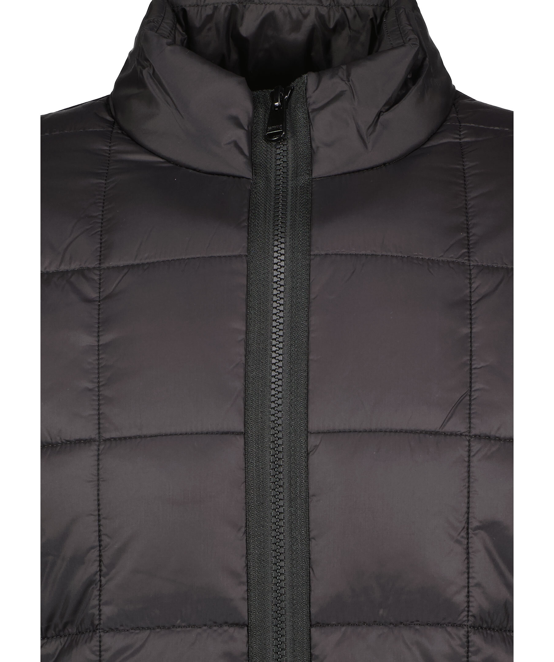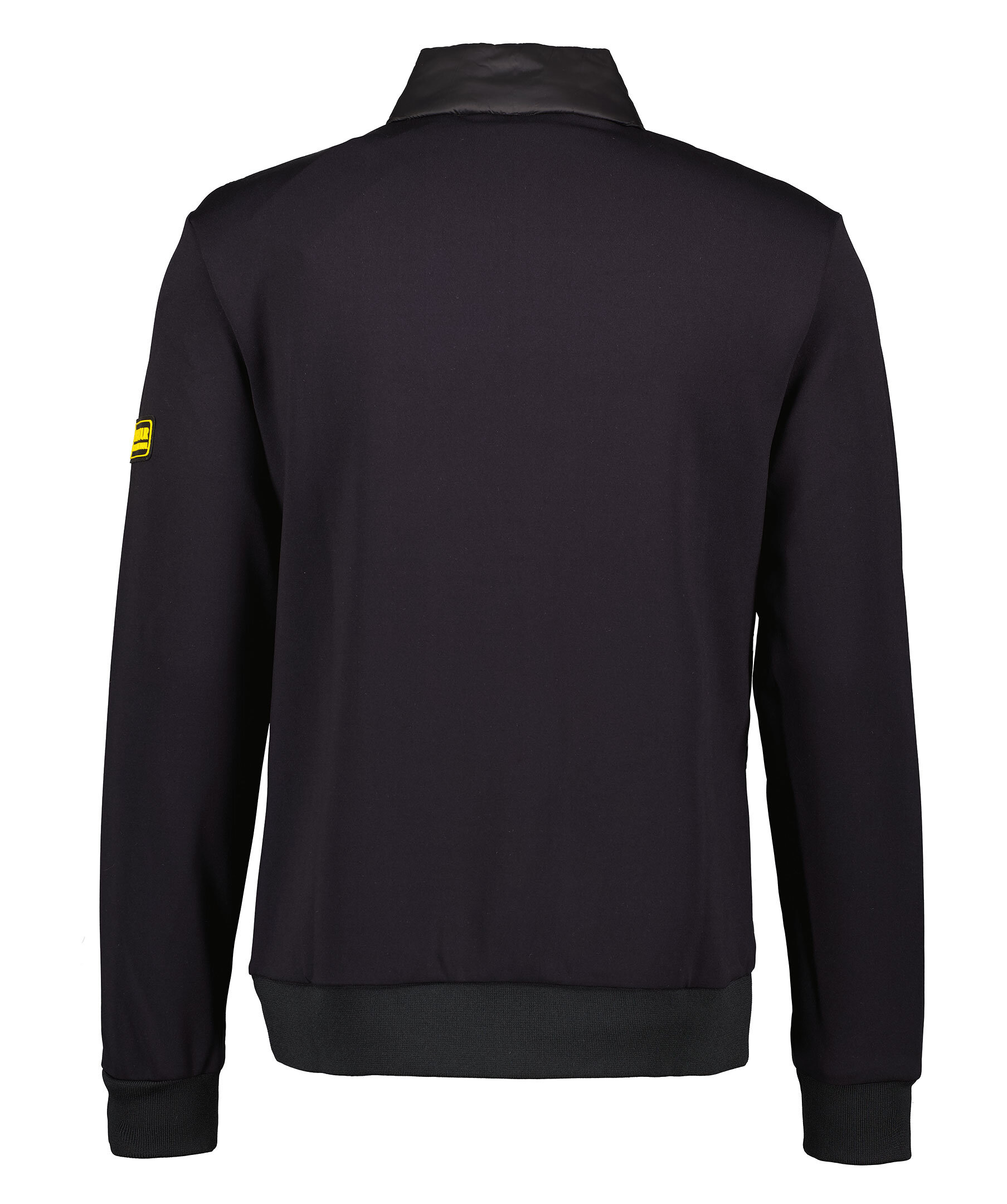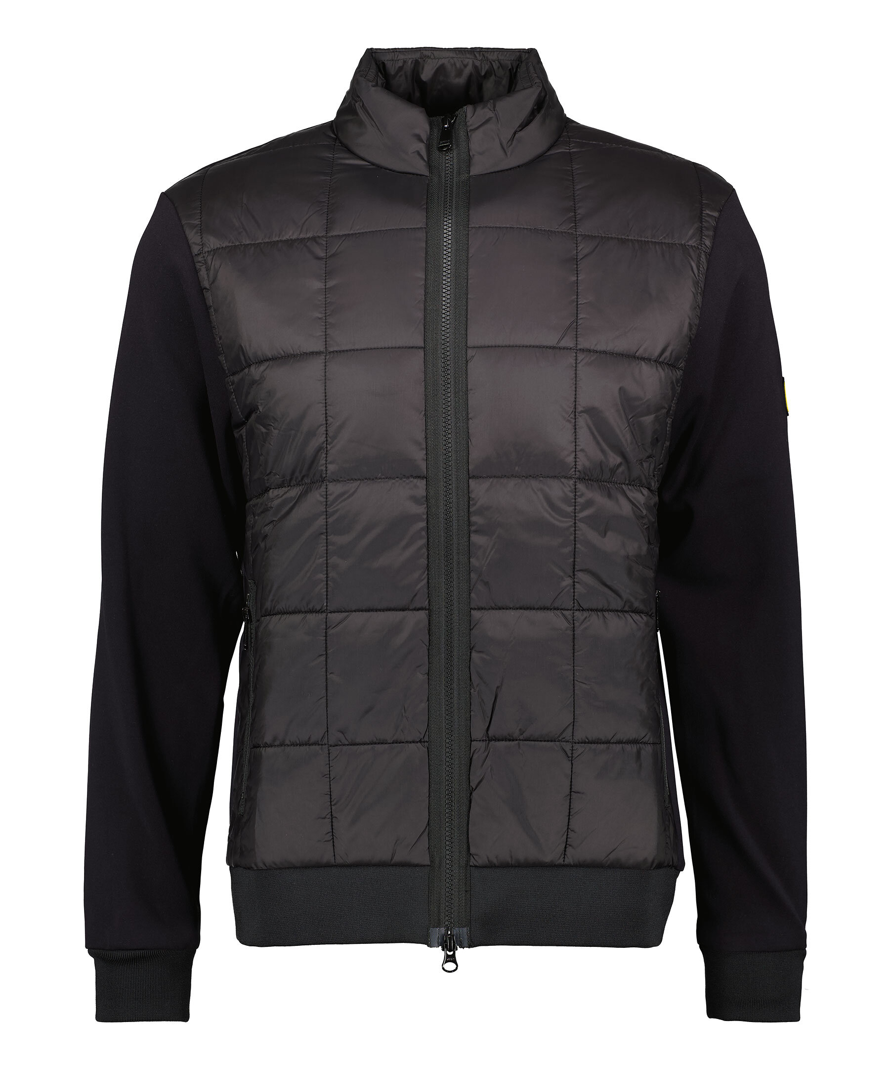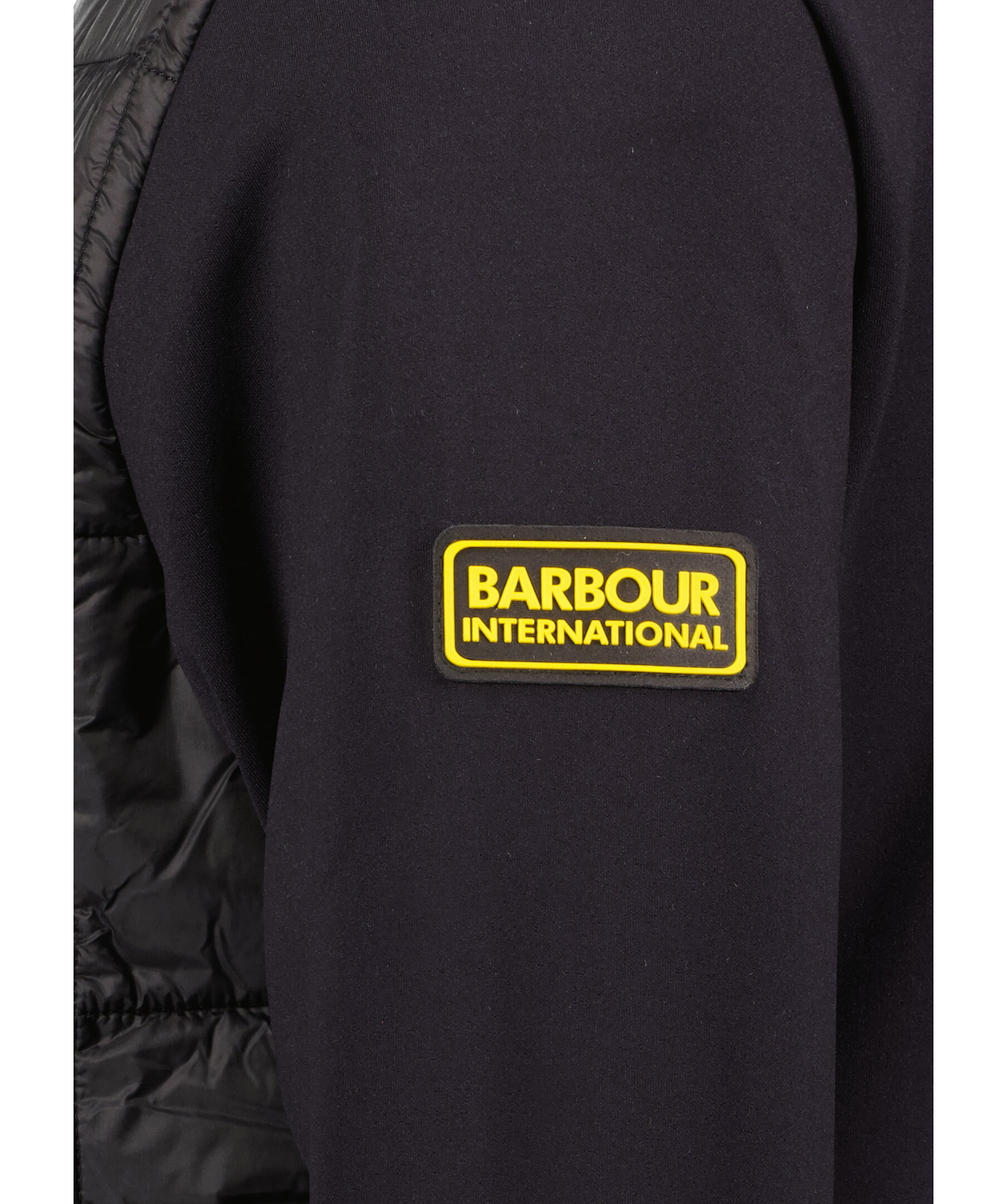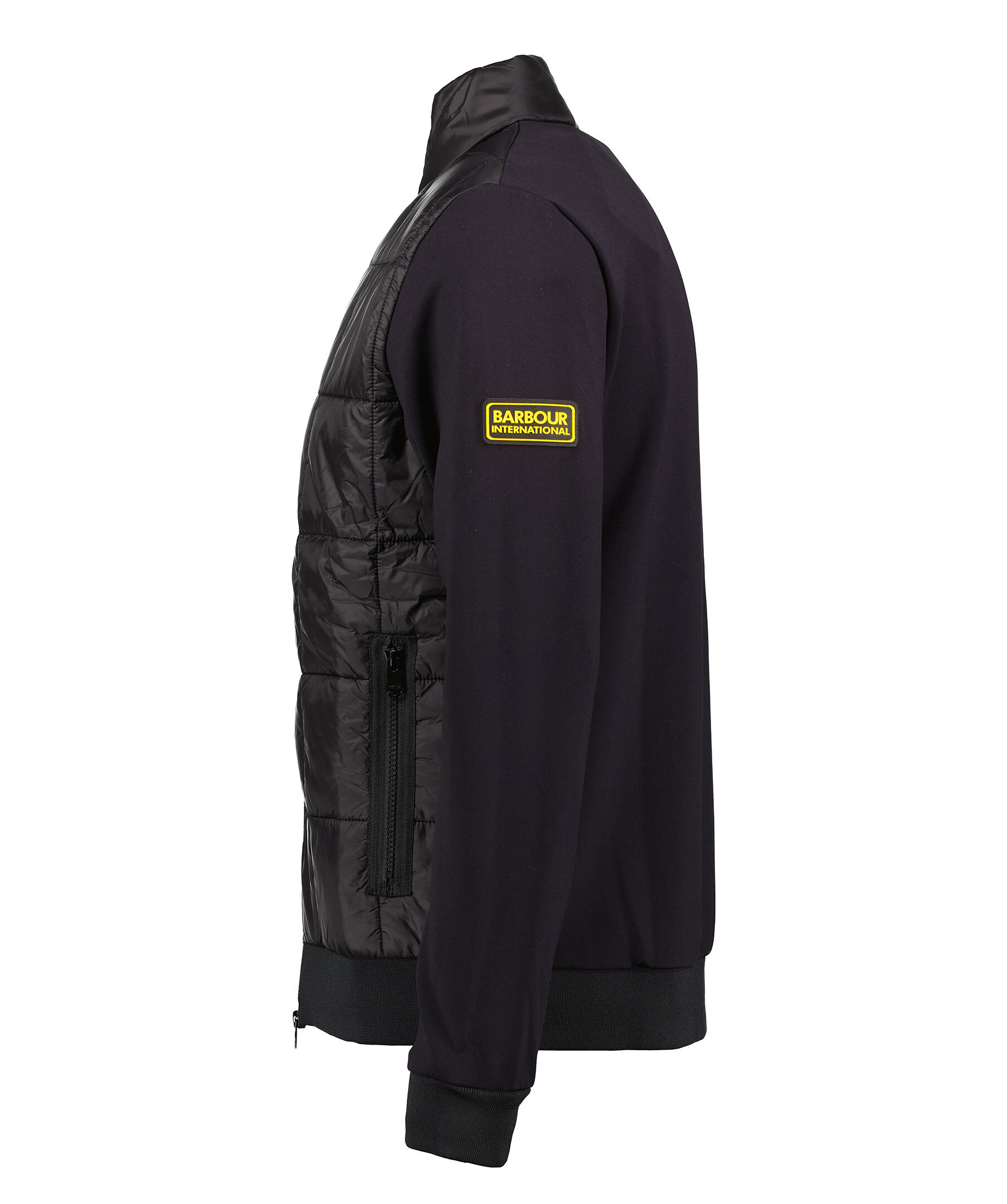 Svart hybrid trackjacka från Barbour. Quiltad vadderad panel på framsidan. Stängs med dragkedja på mitten. Gummerad Barbour International logotyp-patch på vänster ärm. Ribbstickad ärm-och plaggslut. Två sidfickor med dragkedja. Tillverkad i en blandning av polyester och polyamid.