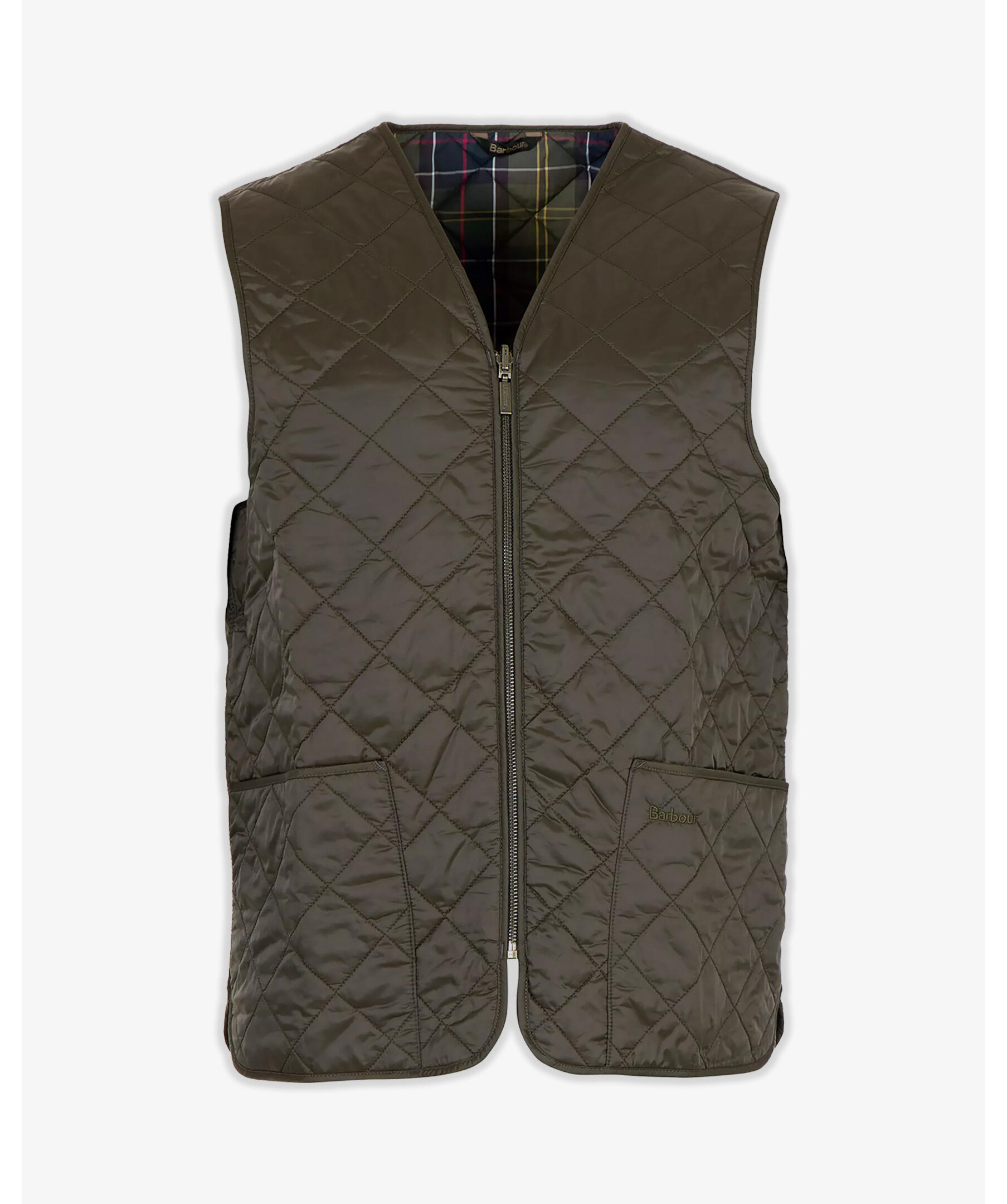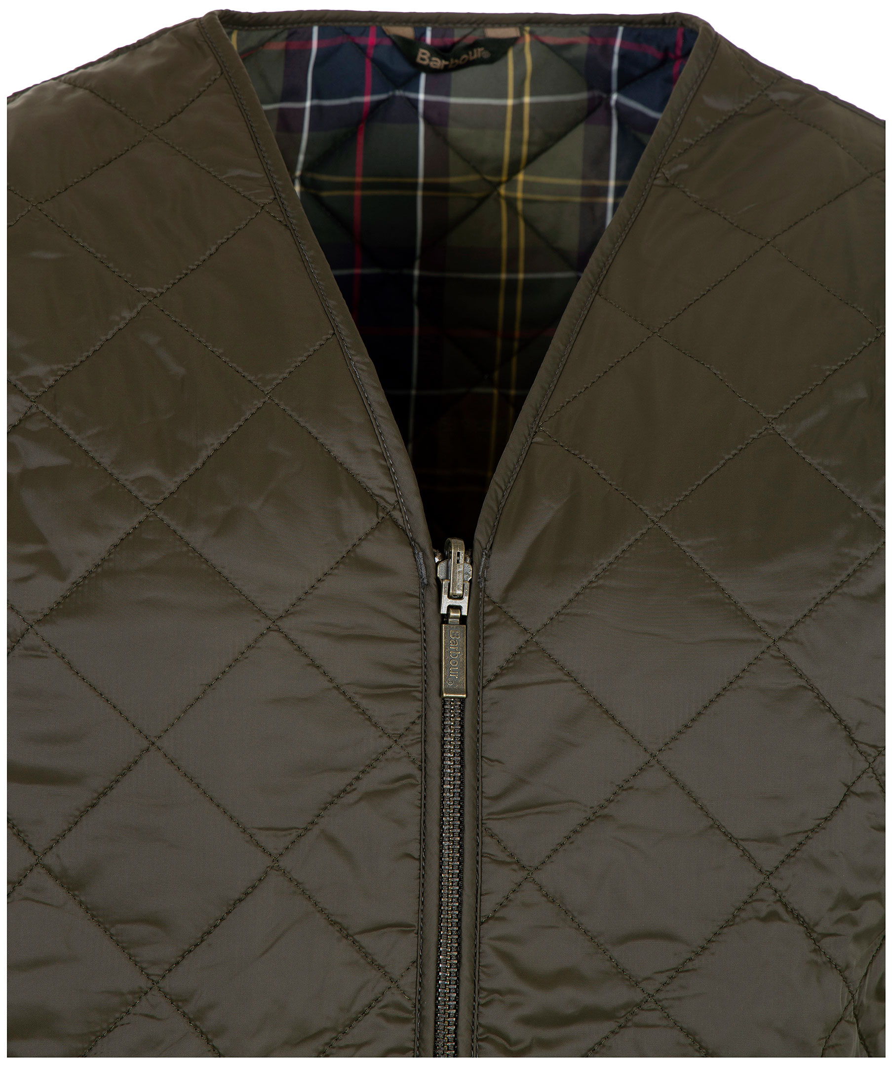 Grön quiltad väst från Barbour. Två fickor fram v-ringad och stängs med dragkedja. Rutigt foder och liten logotyp på ena fickan fram. Tillverkad i polyamid.