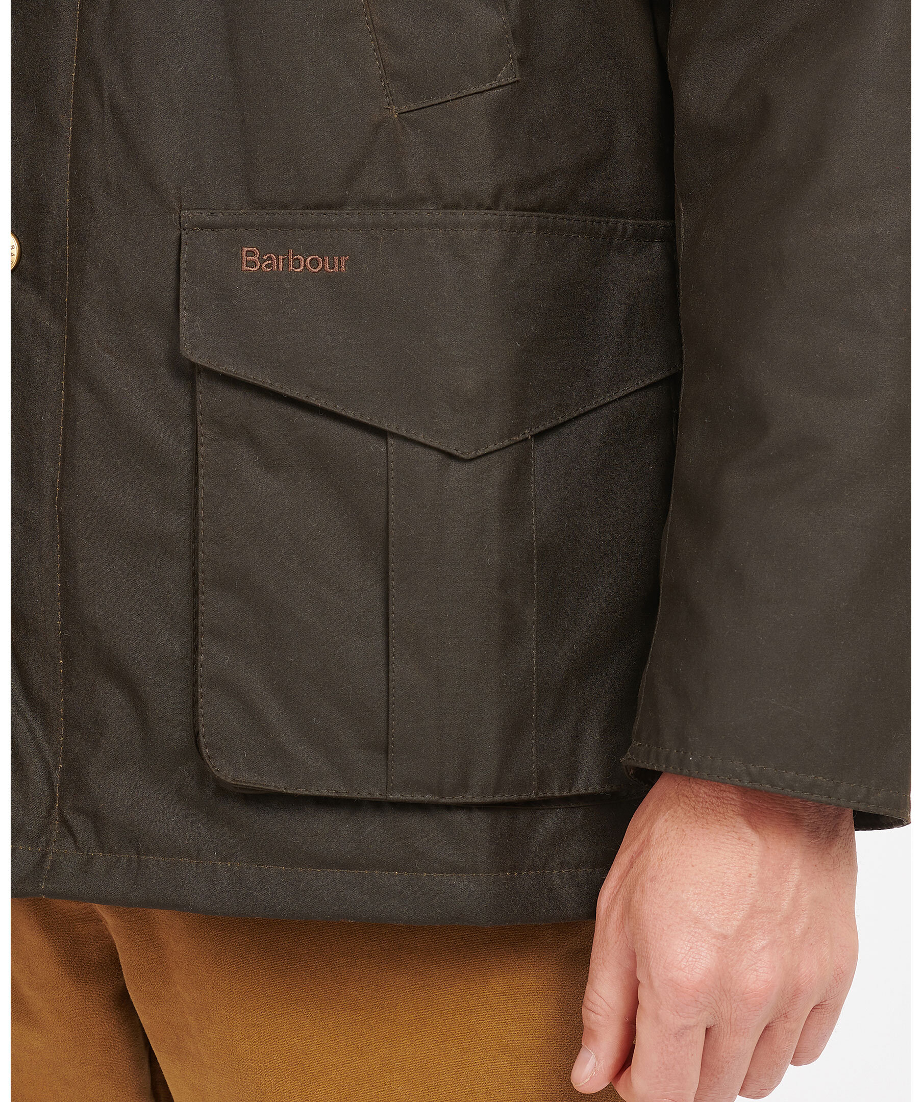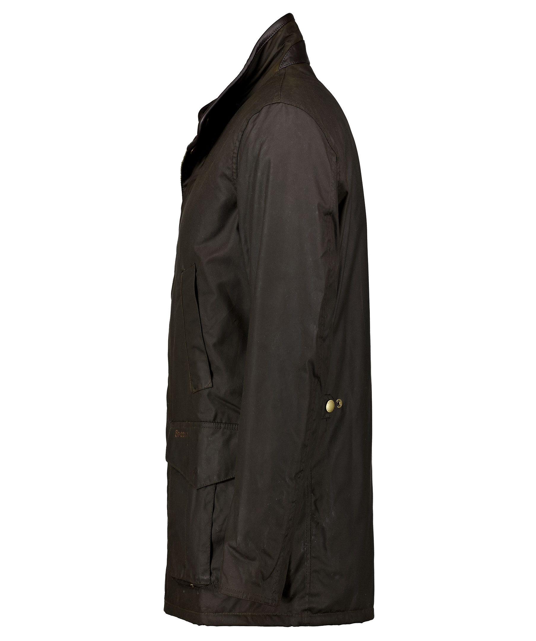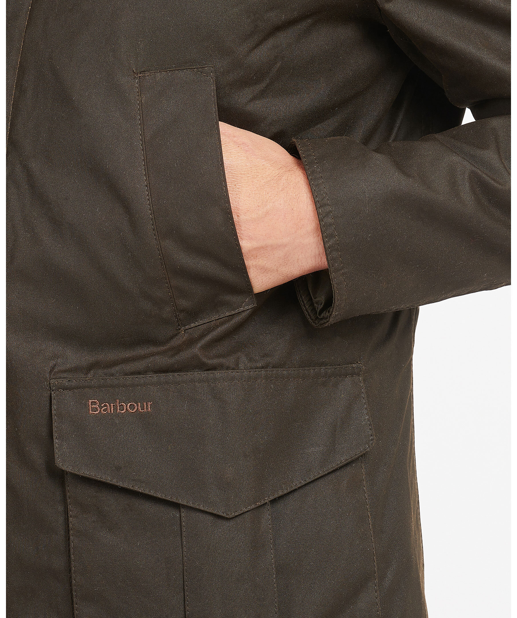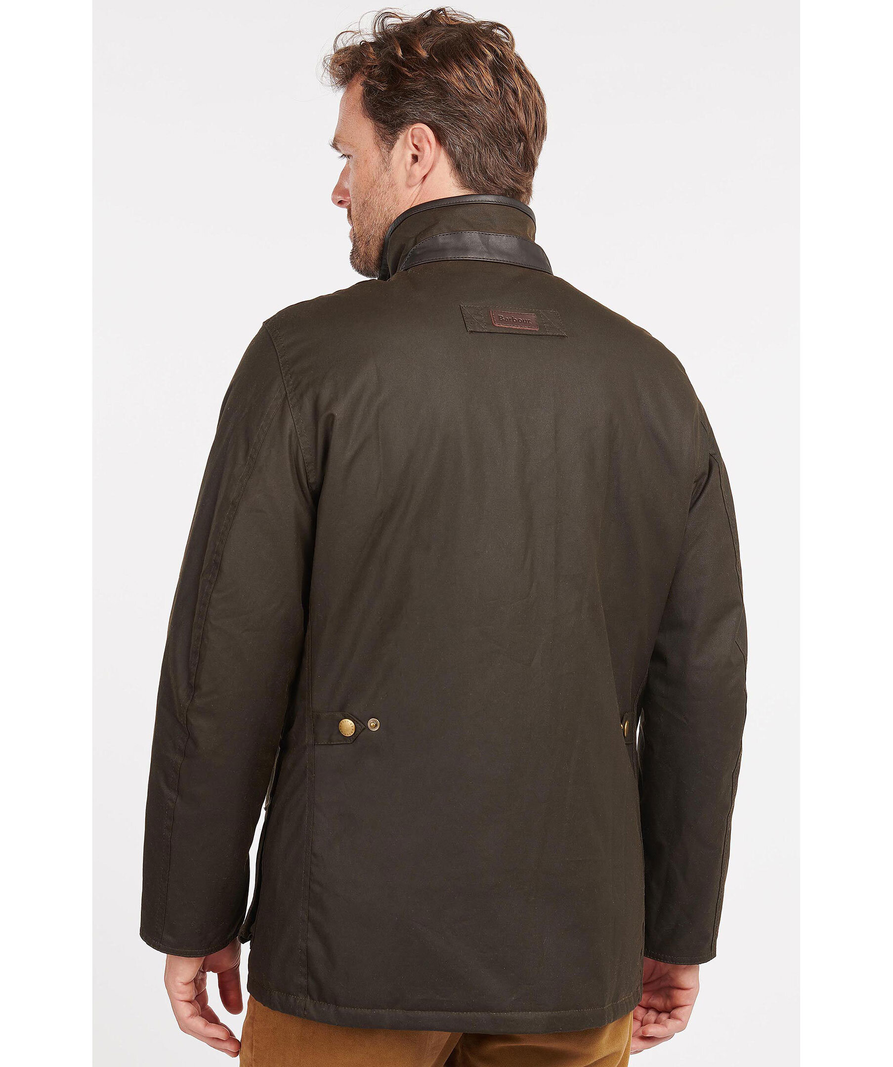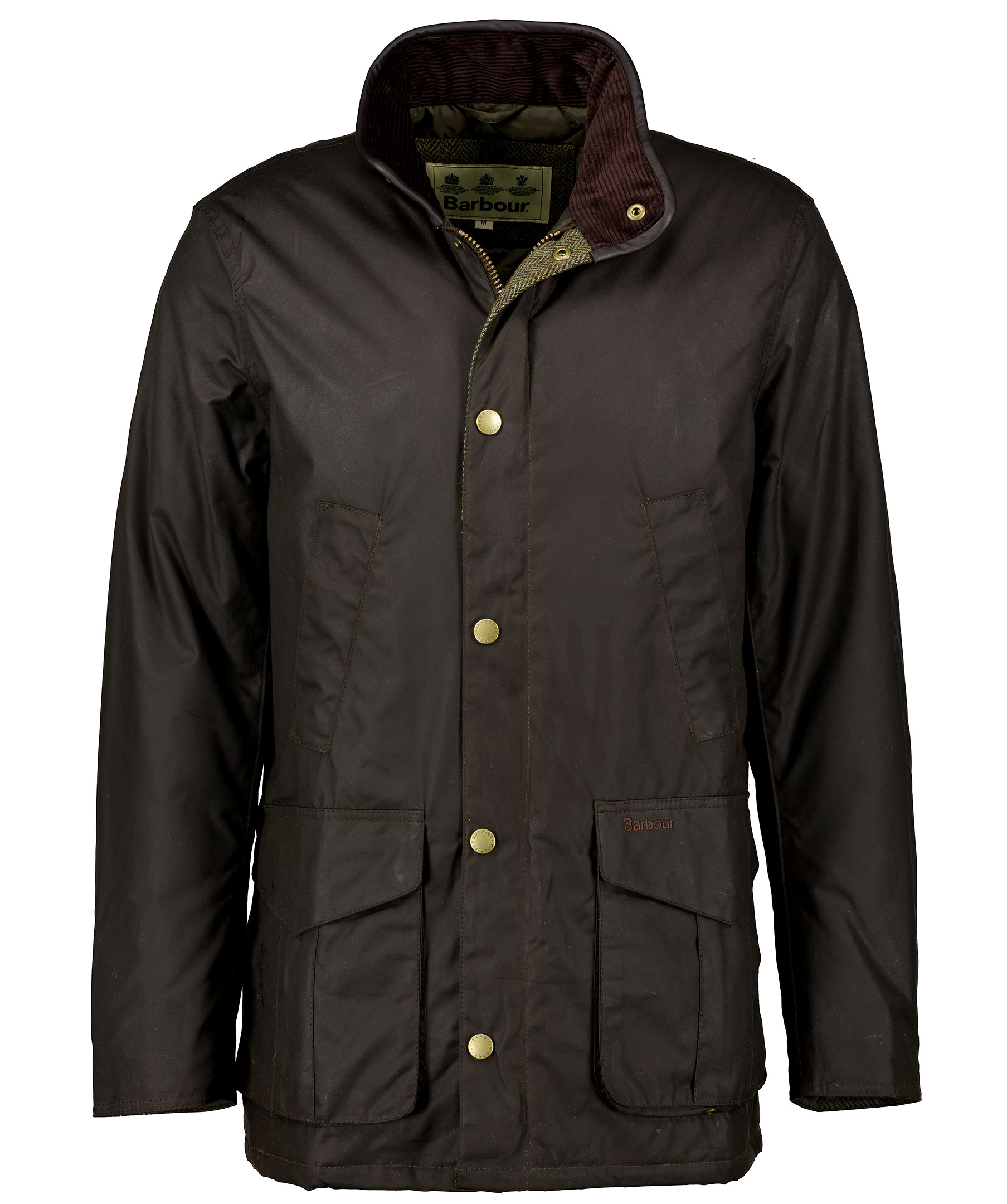 Mörkgrön tunt fodrad jacka i vaxad bomull, från Barbour. Jackan har en något avslappnad passform, krage i brunt manchestertyg, fyra fickor fram med diskret logga på vänster sida, en innerficka med dragkedja. Helt fodrad i mjuk polyester.