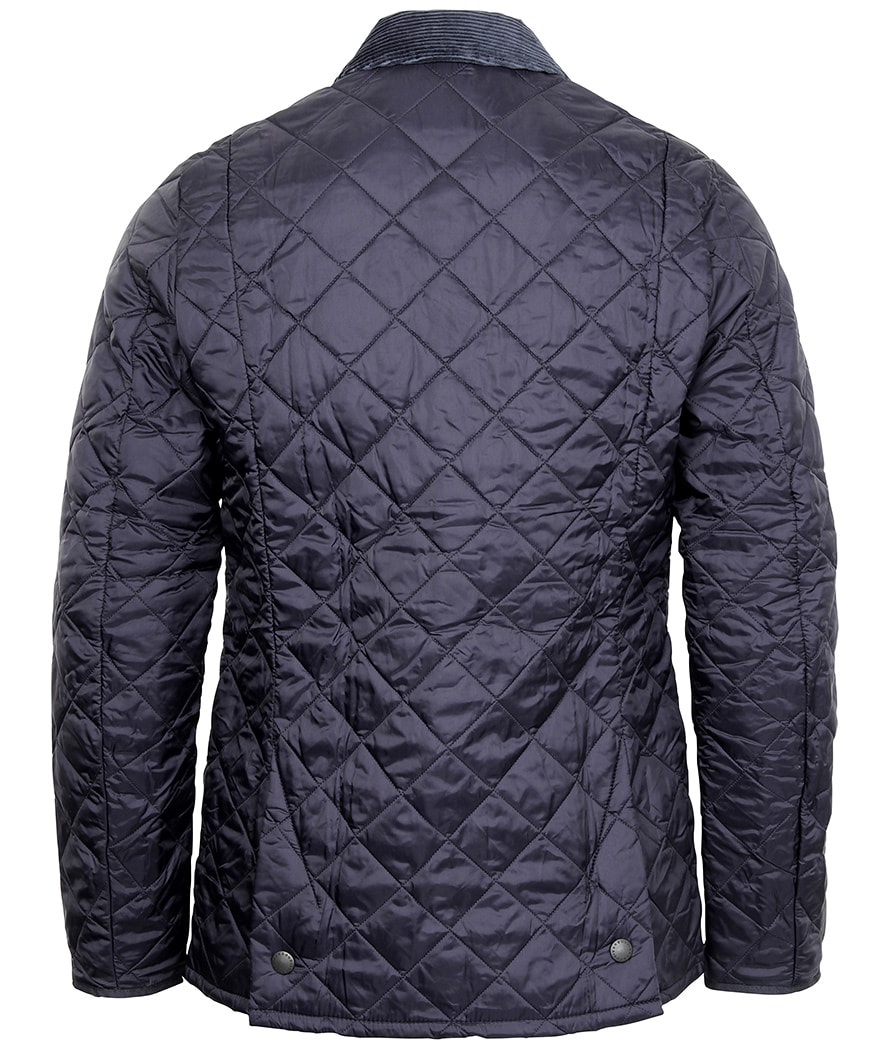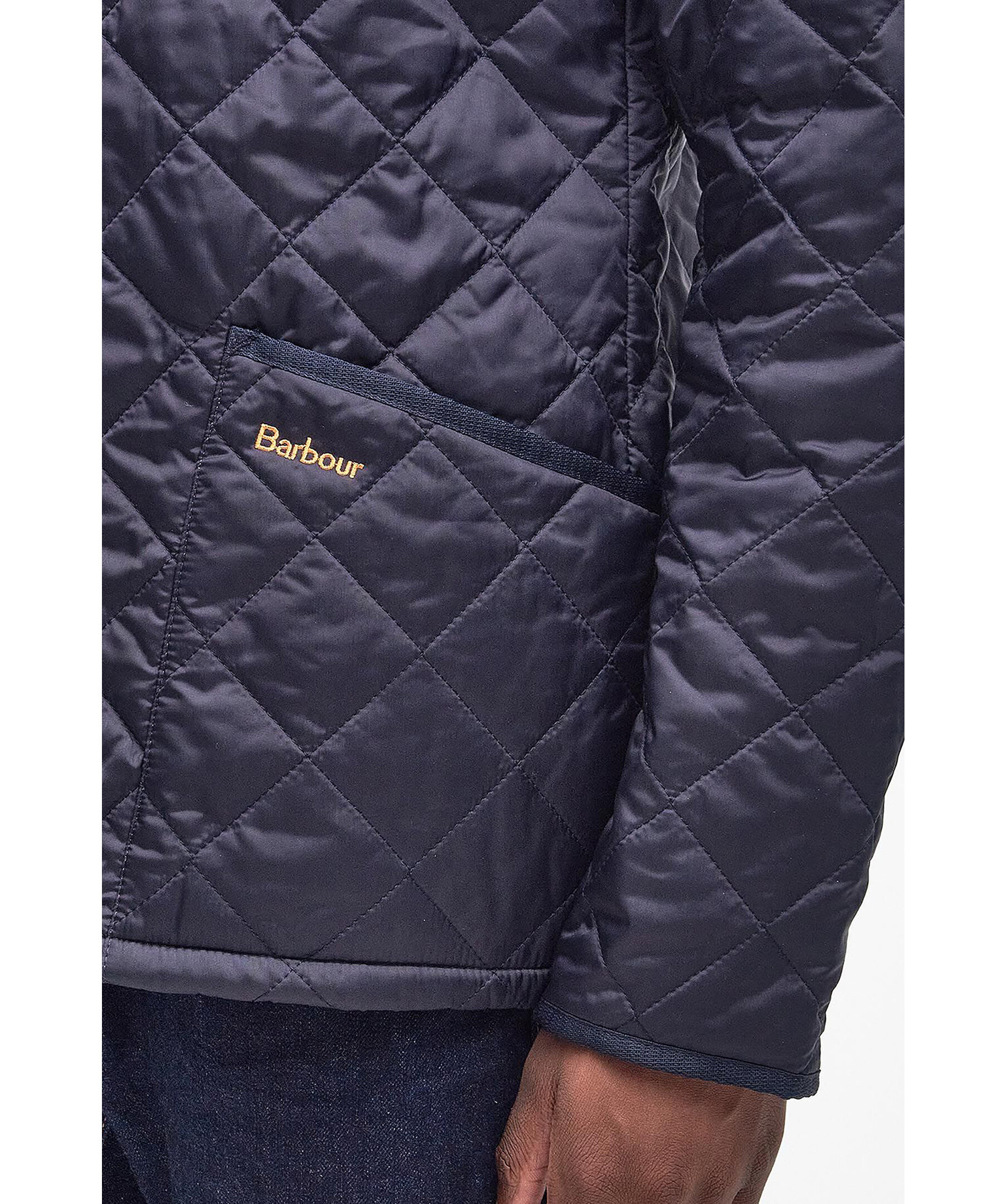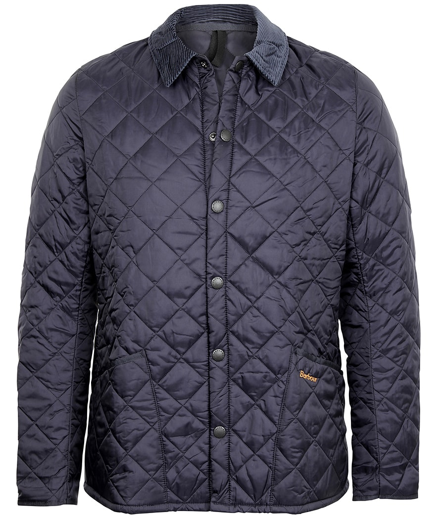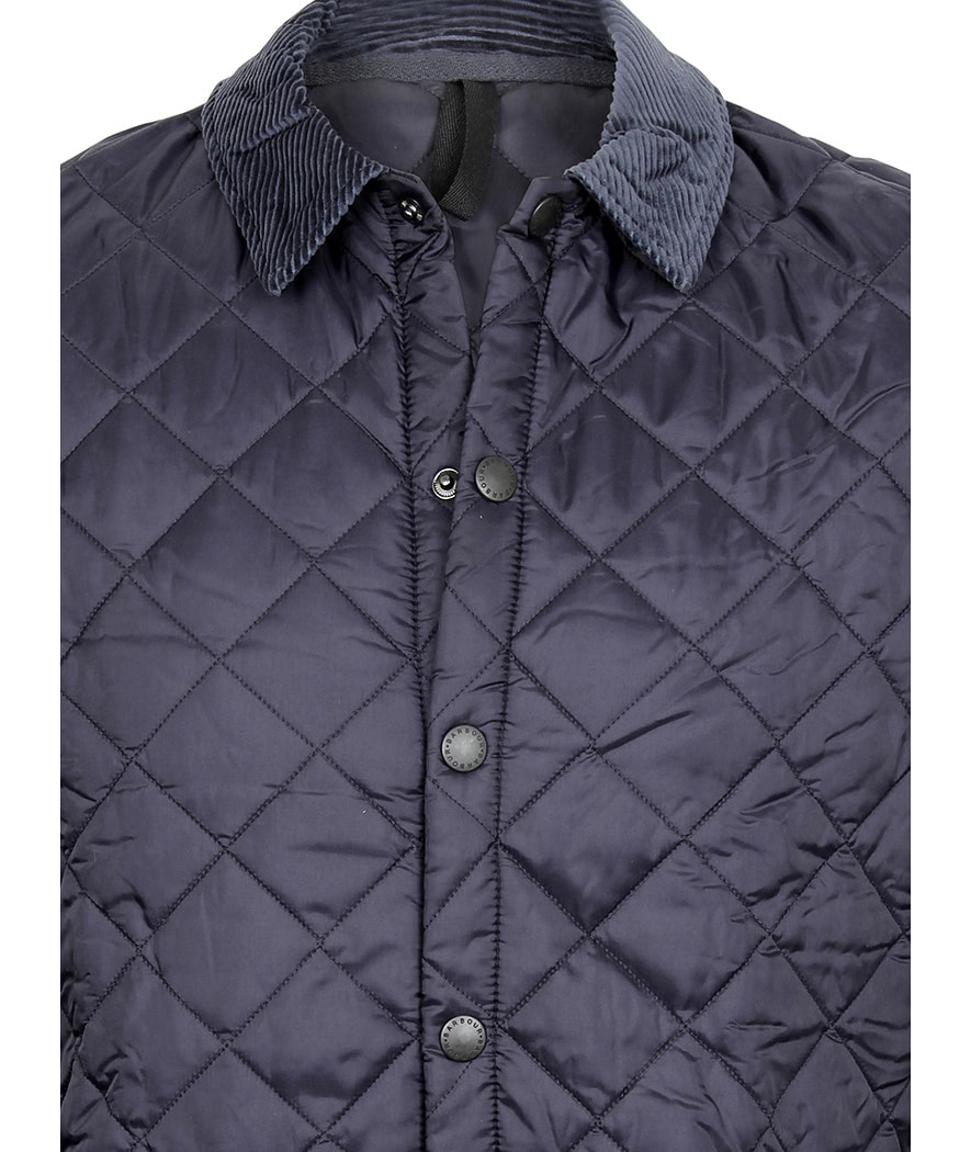 Mörkblå quiltad jacka från Barbour. Jackan har två ytterfickor och en innerficka med dragkedja. Krage i manchester. Jackan stängs med tryckknappar. Liten logotyp på vänstra ytterfickan.