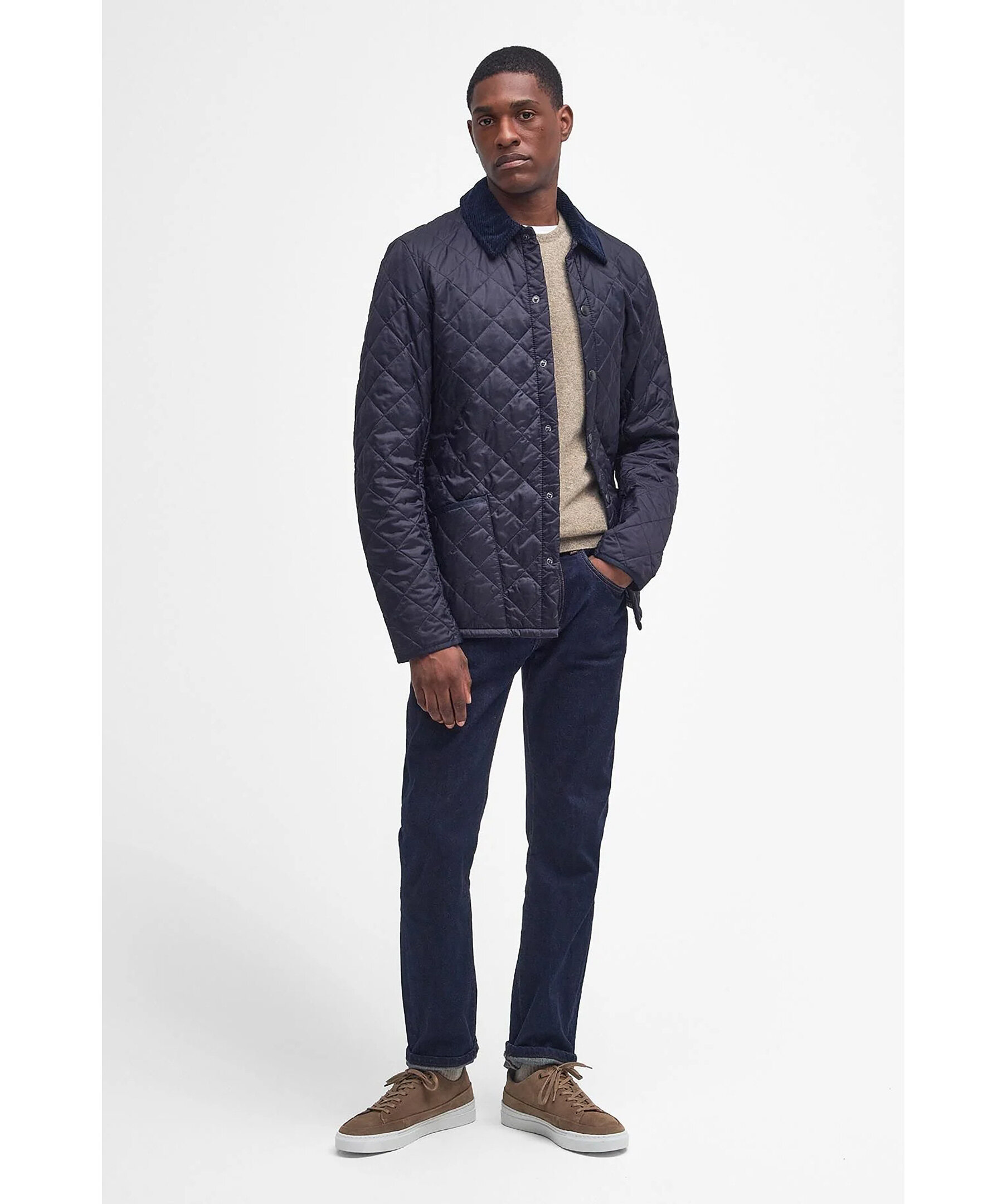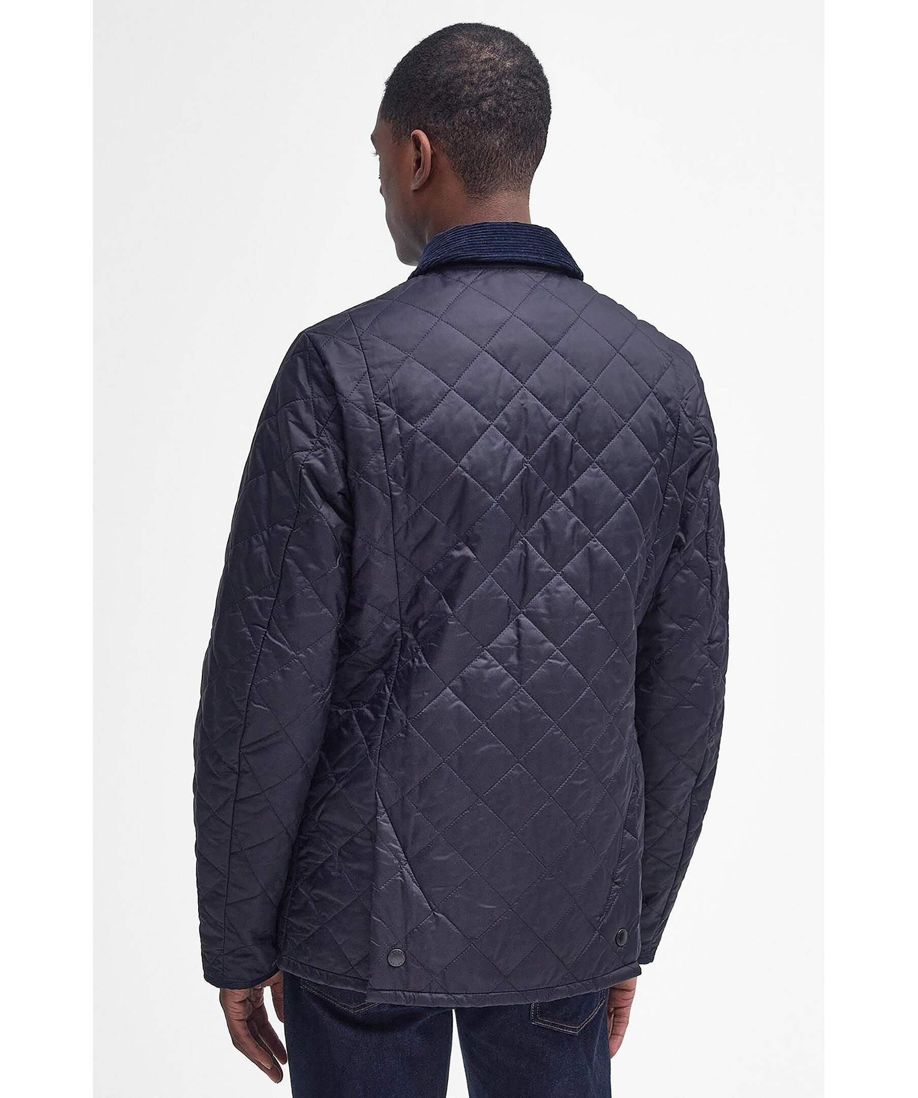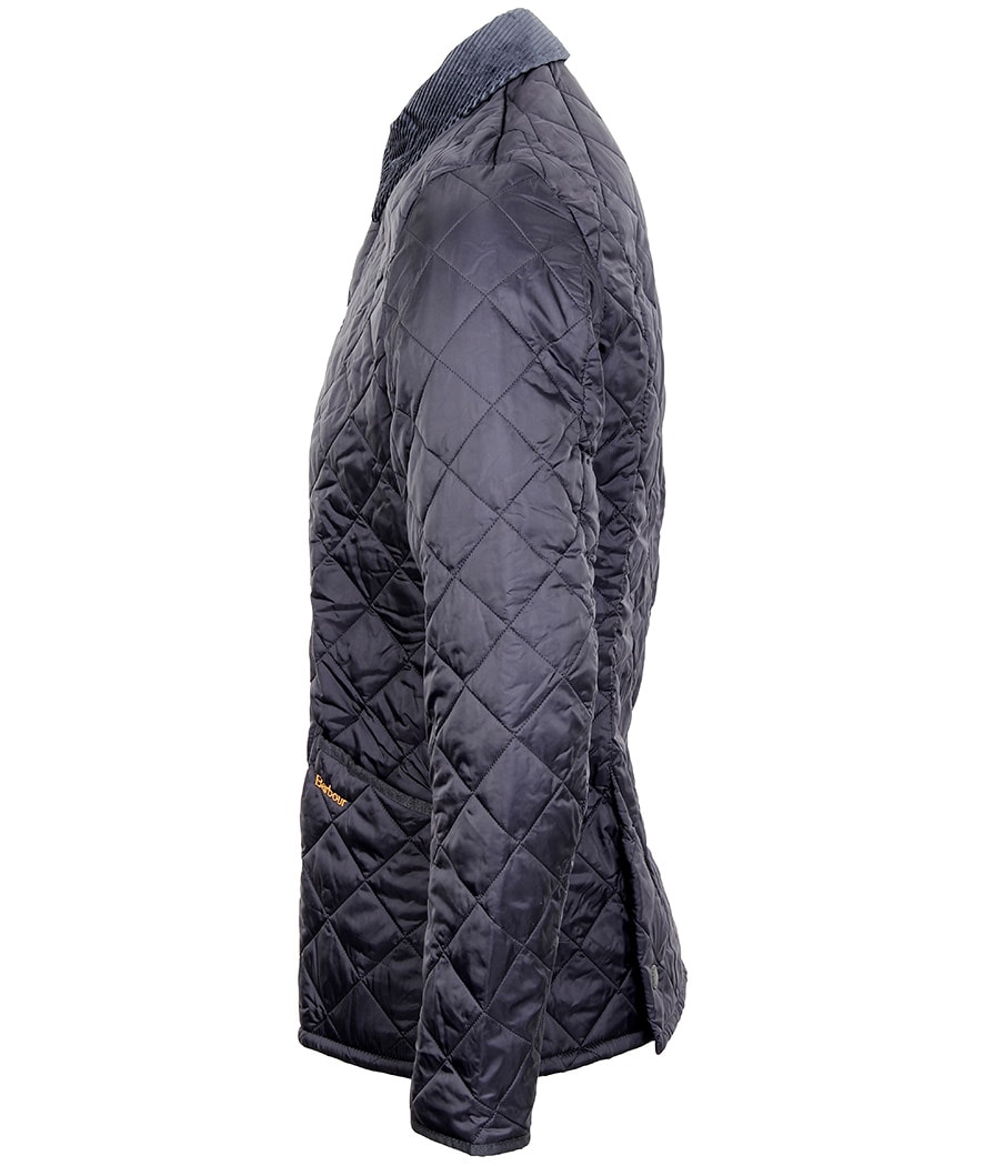 Mörkblå quiltad jacka från Barbour. Jackan har två ytterfickor och en innerficka med dragkedja. Krage i manchester. Jackan stängs med tryckknappar. Liten logotyp på vänstra ytterfickan.