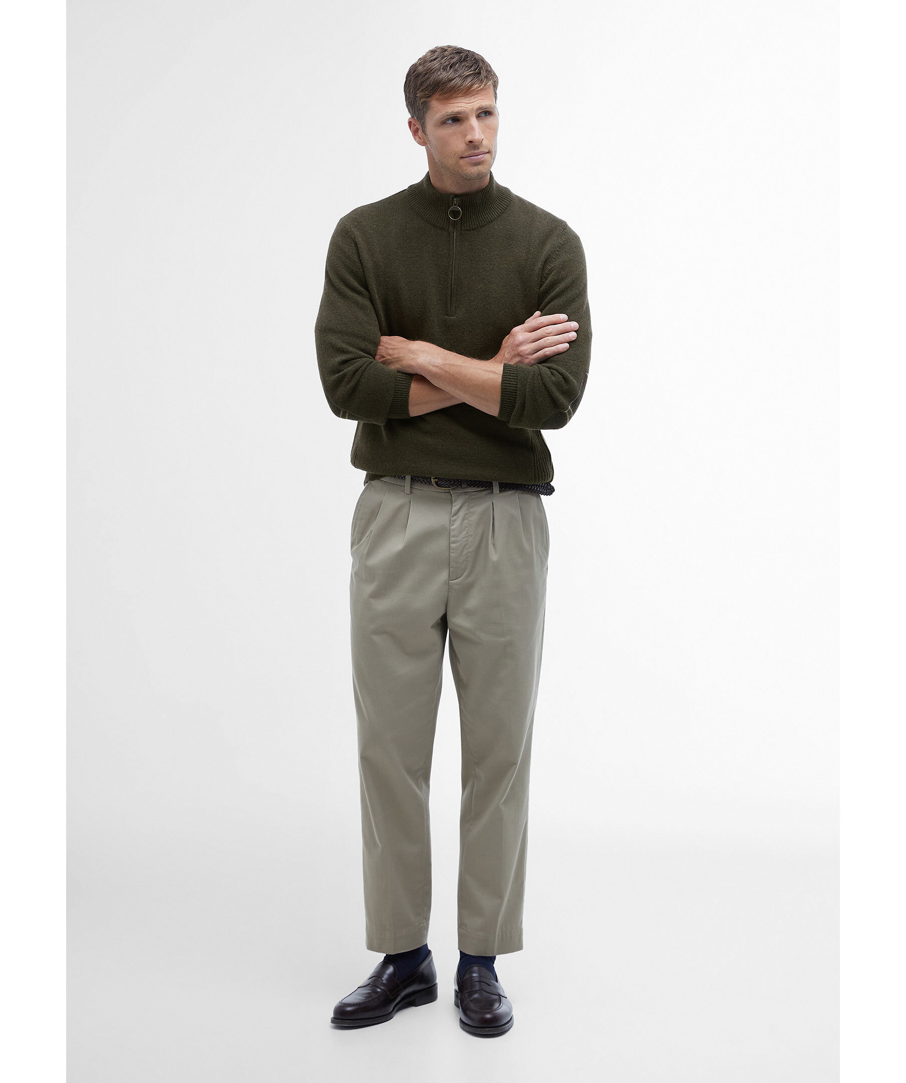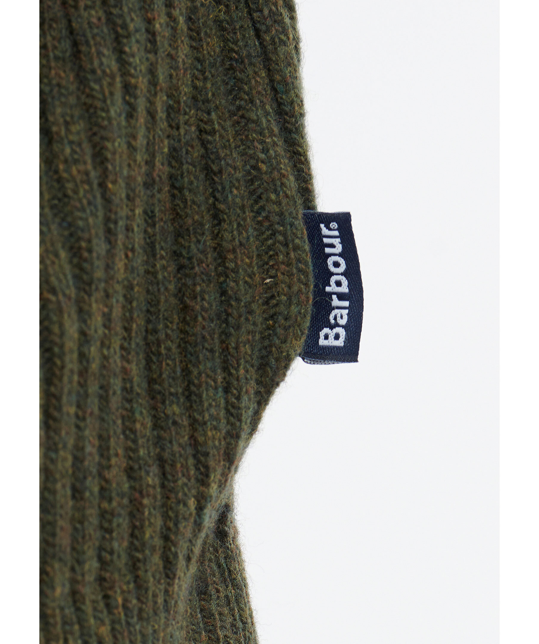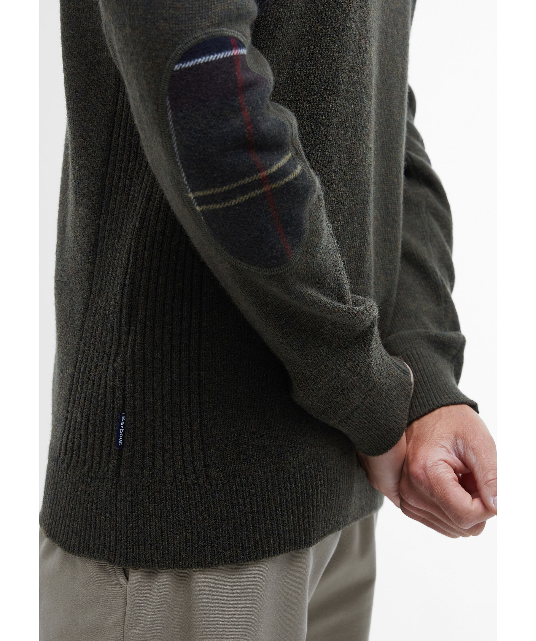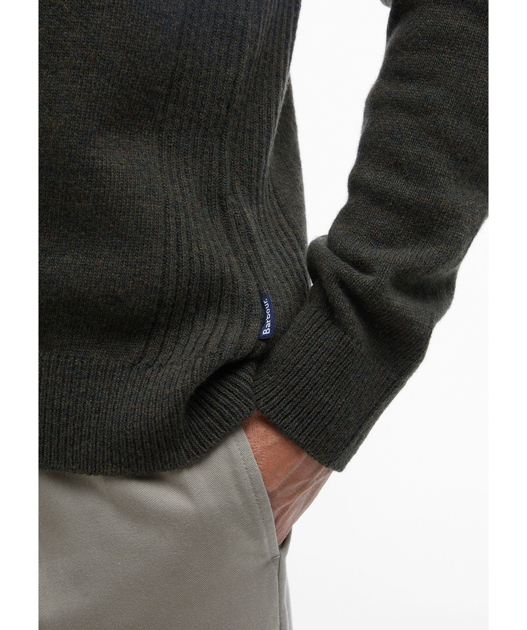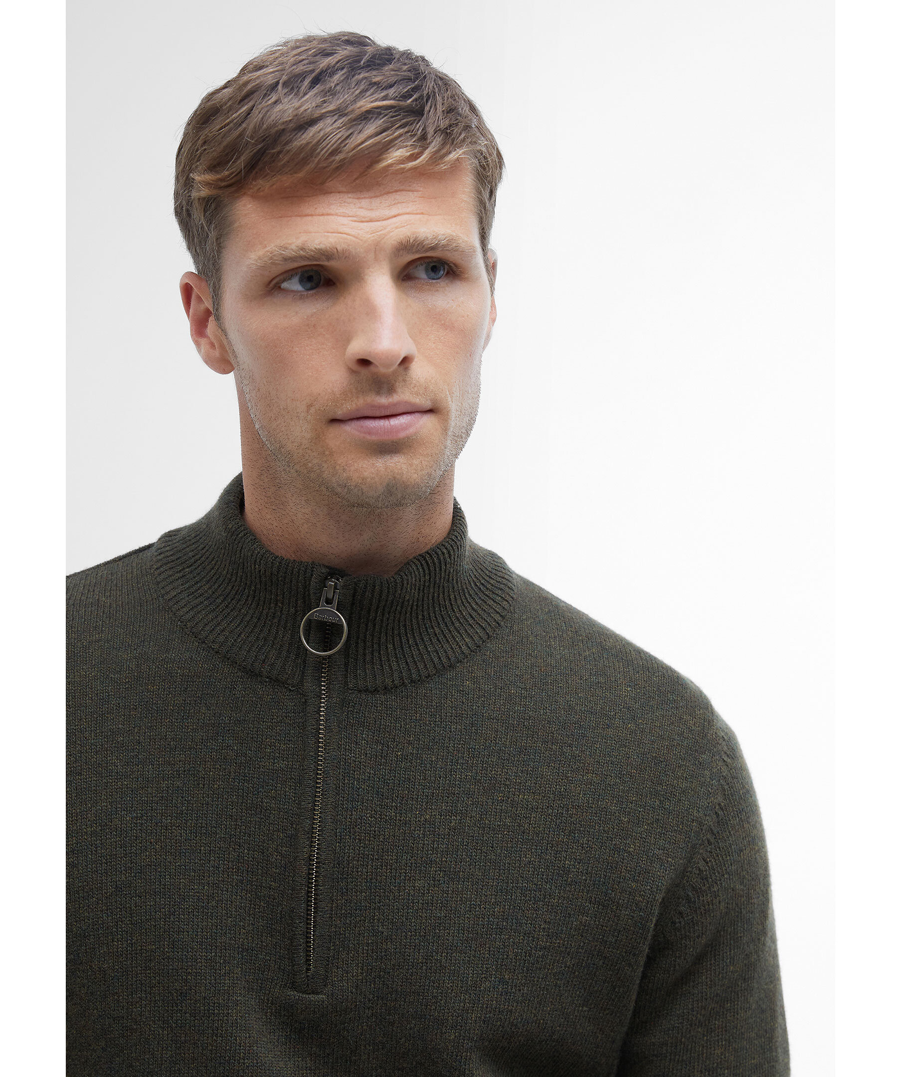 Mörkgrön stickad half-zip tröja från Barbour. Tillverkad i 100% ull. Tröjan har en hög krage med dragkedja, stretchiga muddar vid ärm och plaggslut. Tygpatch vid armbåge.