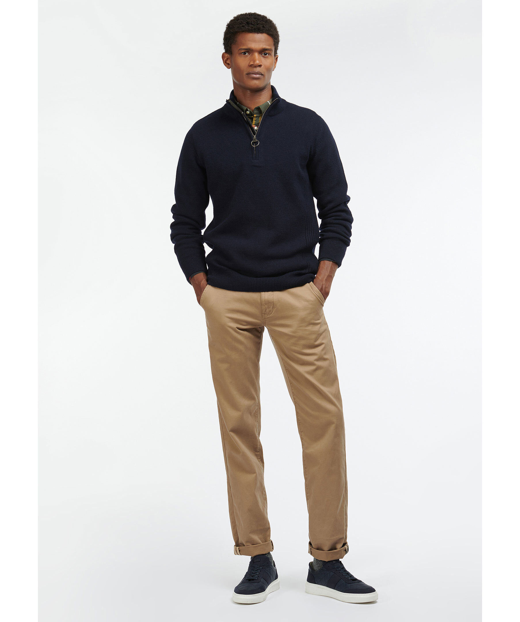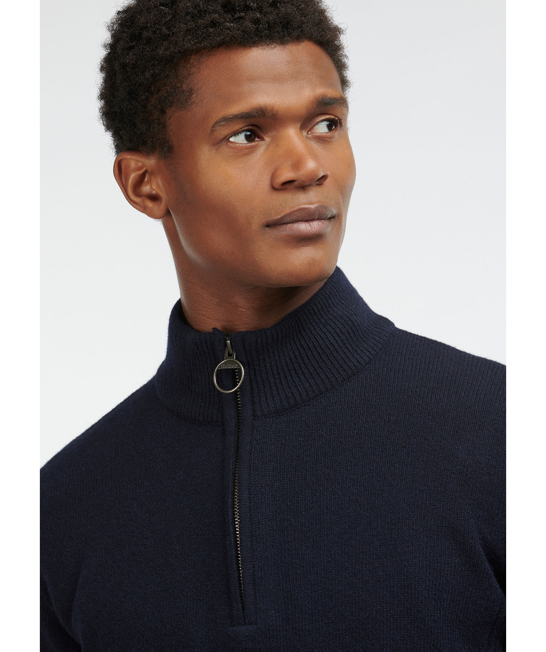 Mörkblå stickad half-zip tröja från Barbour. Tröjan har en hög krage med dragkedja, stretchiga muddar vid ärm och plaggslut. Tygpatch vid armbåge. Tillverkad i 100% ull.