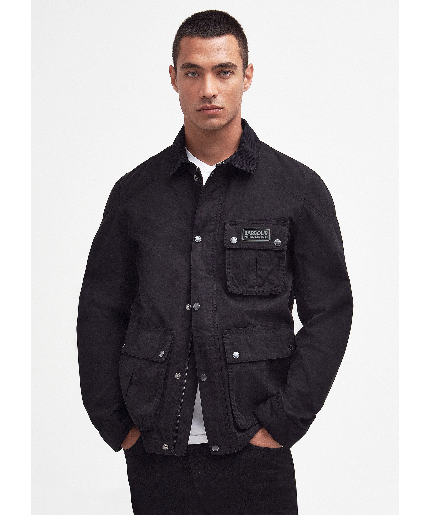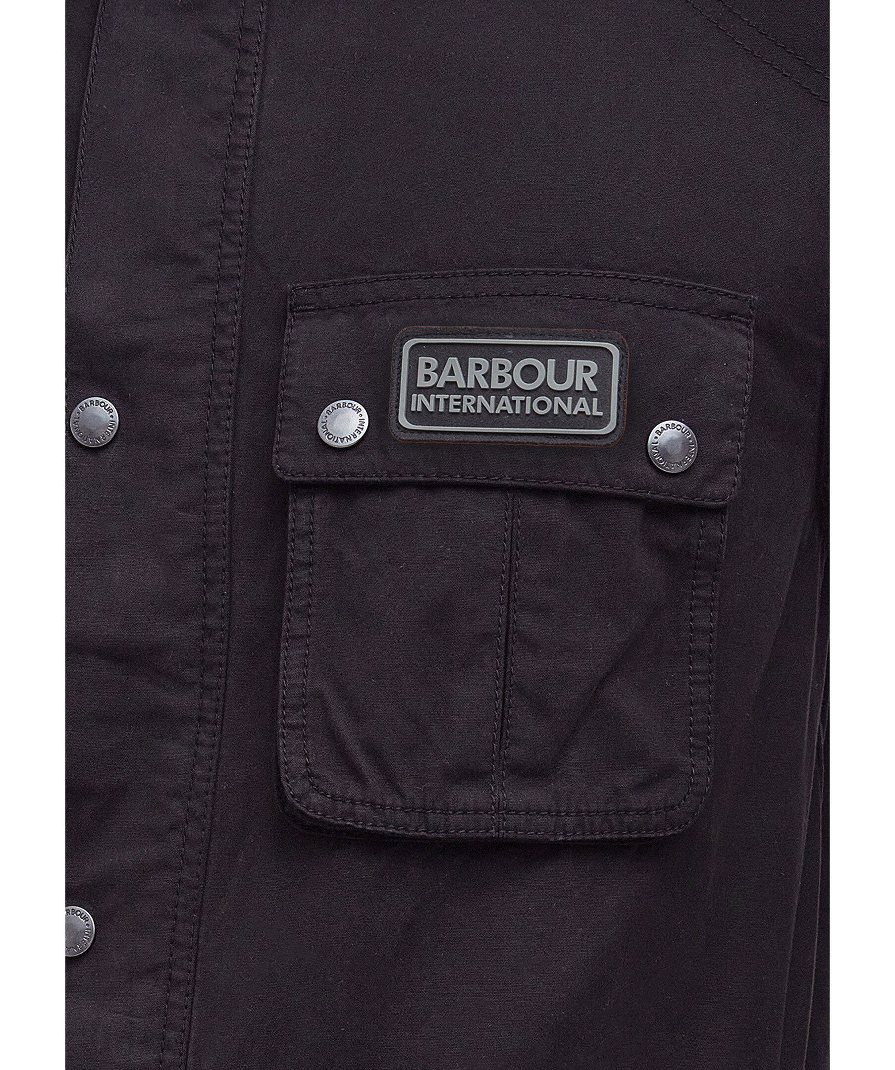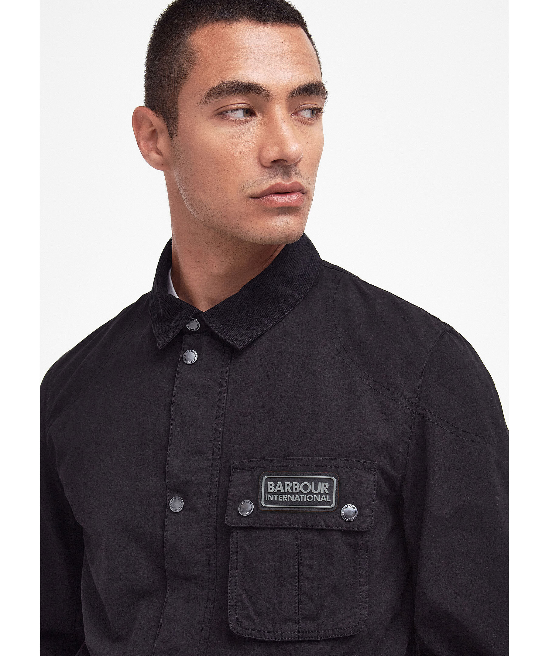 Svart overshirt-jacka från Barbour International. Den här avslappnade stilen har deras signaturnålskrage med fickor på bröstet och justeringar med nitar i fållen för en utilitaristisk look. Jackan stängs med dragkedja och knapp framtill och har två sidfickor samt en bröstficka med logotyp. Skräddarsydd passform. Tillverkad i 100% bomull.