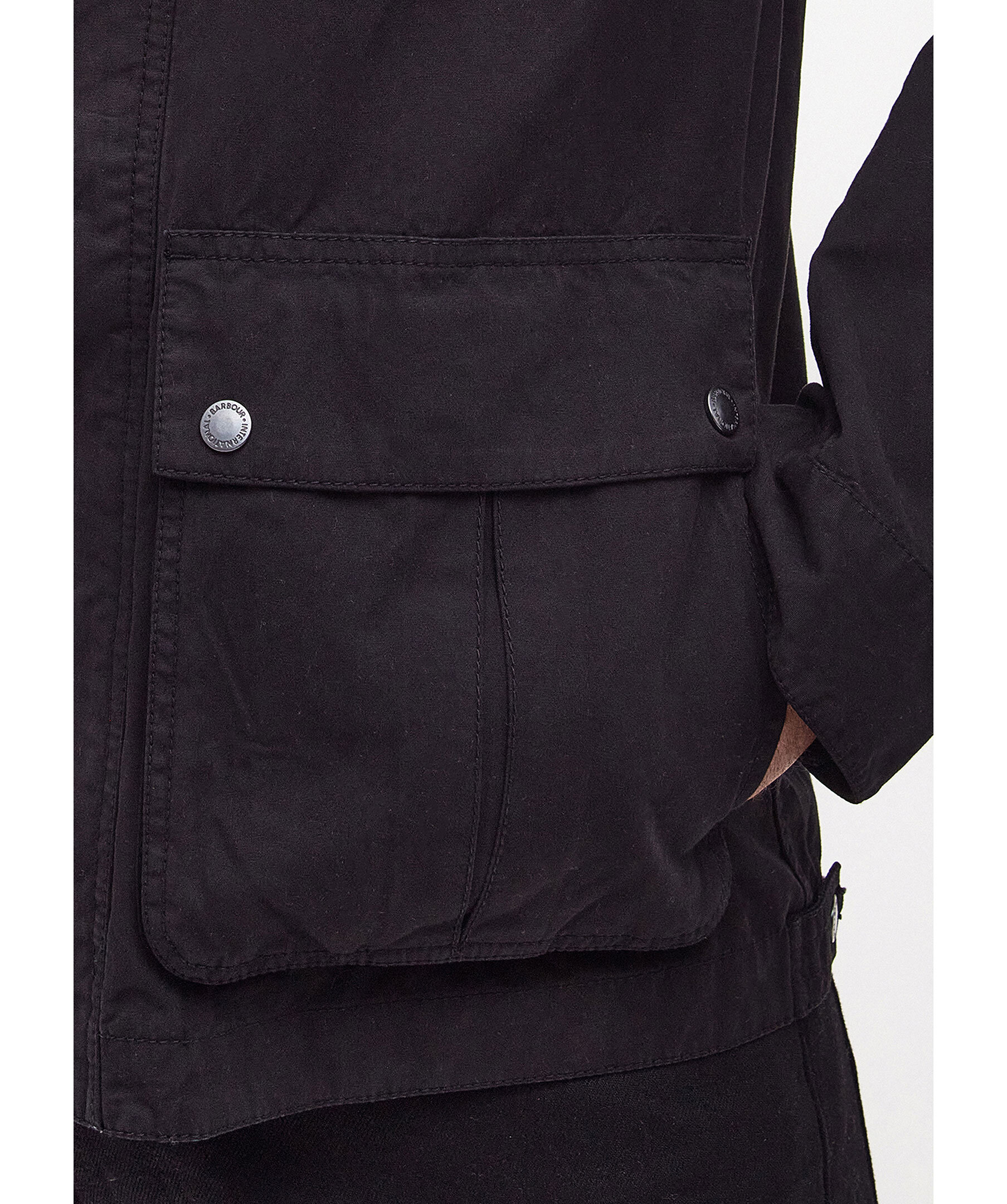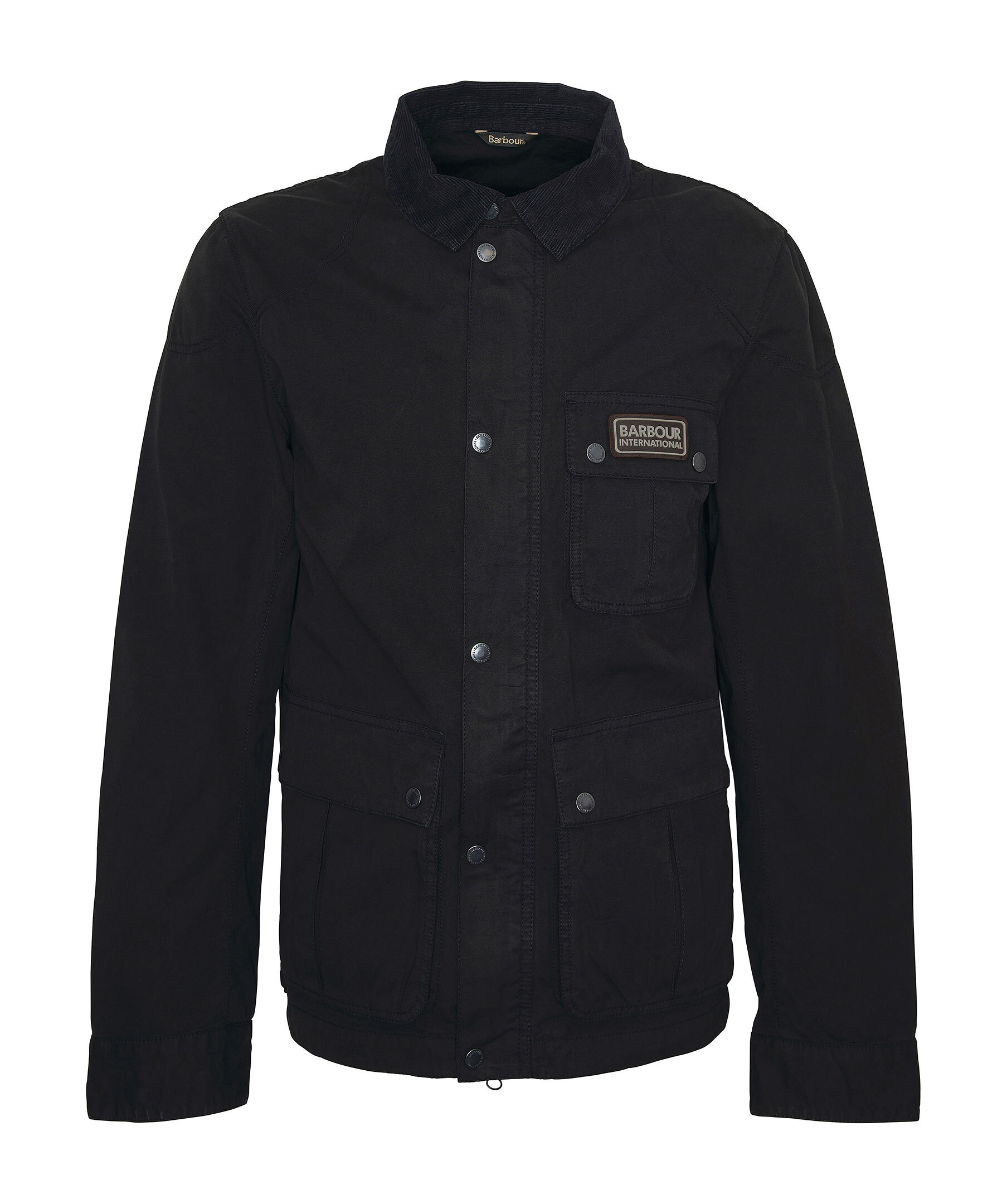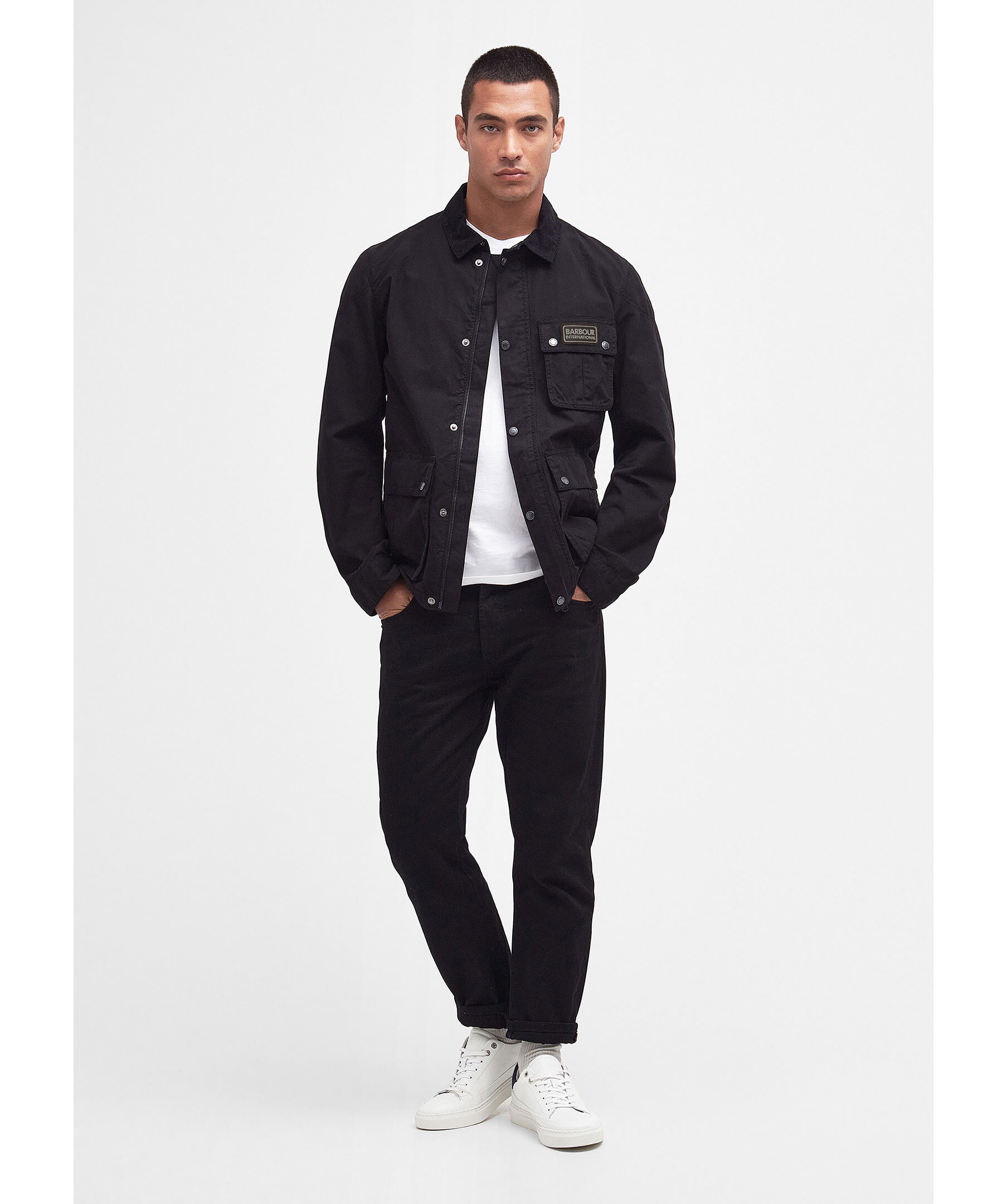 Svart overshirt-jacka från Barbour International. Den här avslappnade stilen har deras signaturnålskrage med fickor på bröstet och justeringar med nitar i fållen för en utilitaristisk look. Jackan stängs med dragkedja och knapp framtill och har två sidfickor samt en bröstficka med logotyp. Skräddarsydd passform. Tillverkad i 100% bomull.