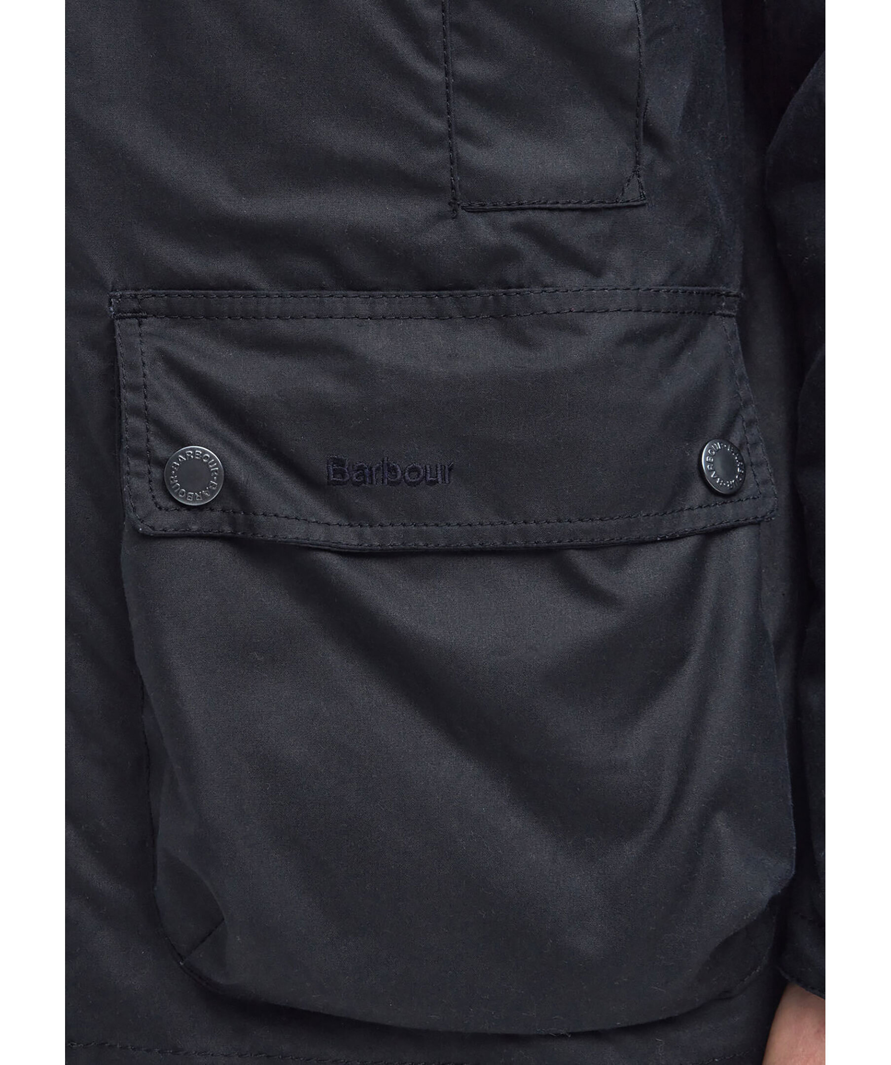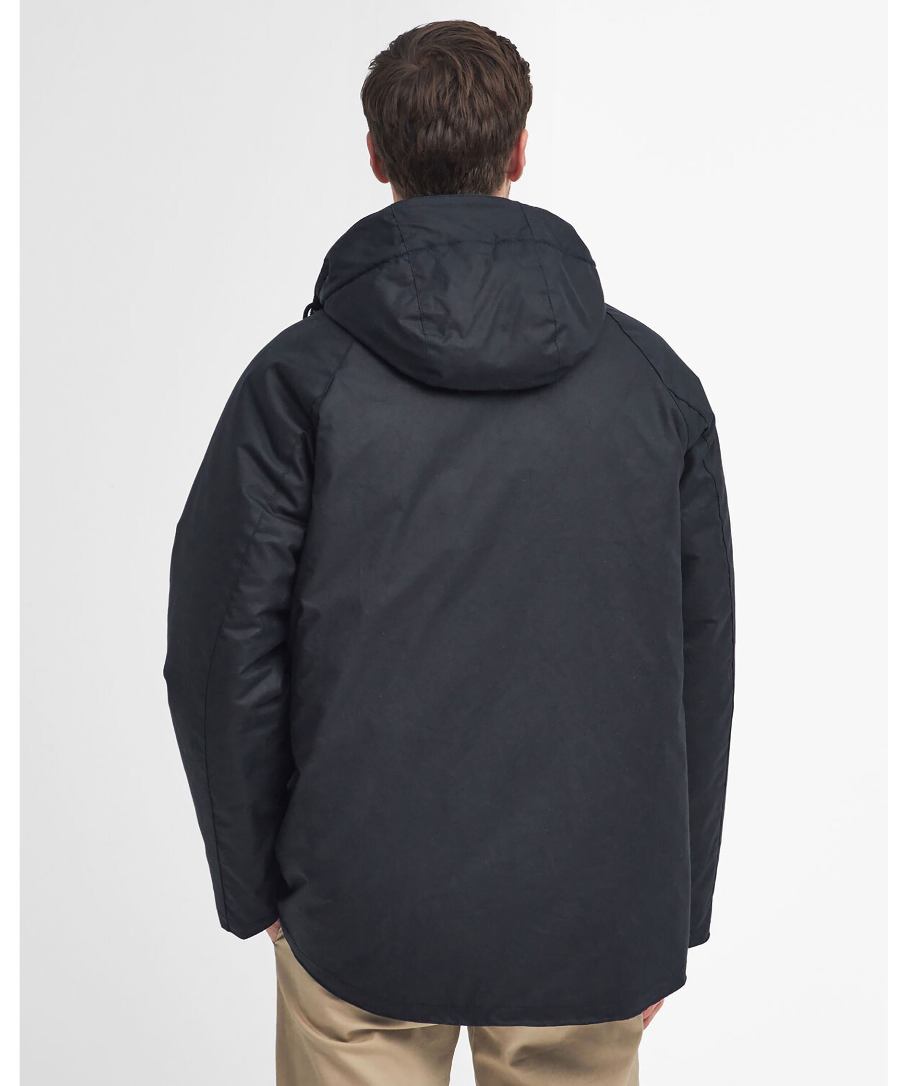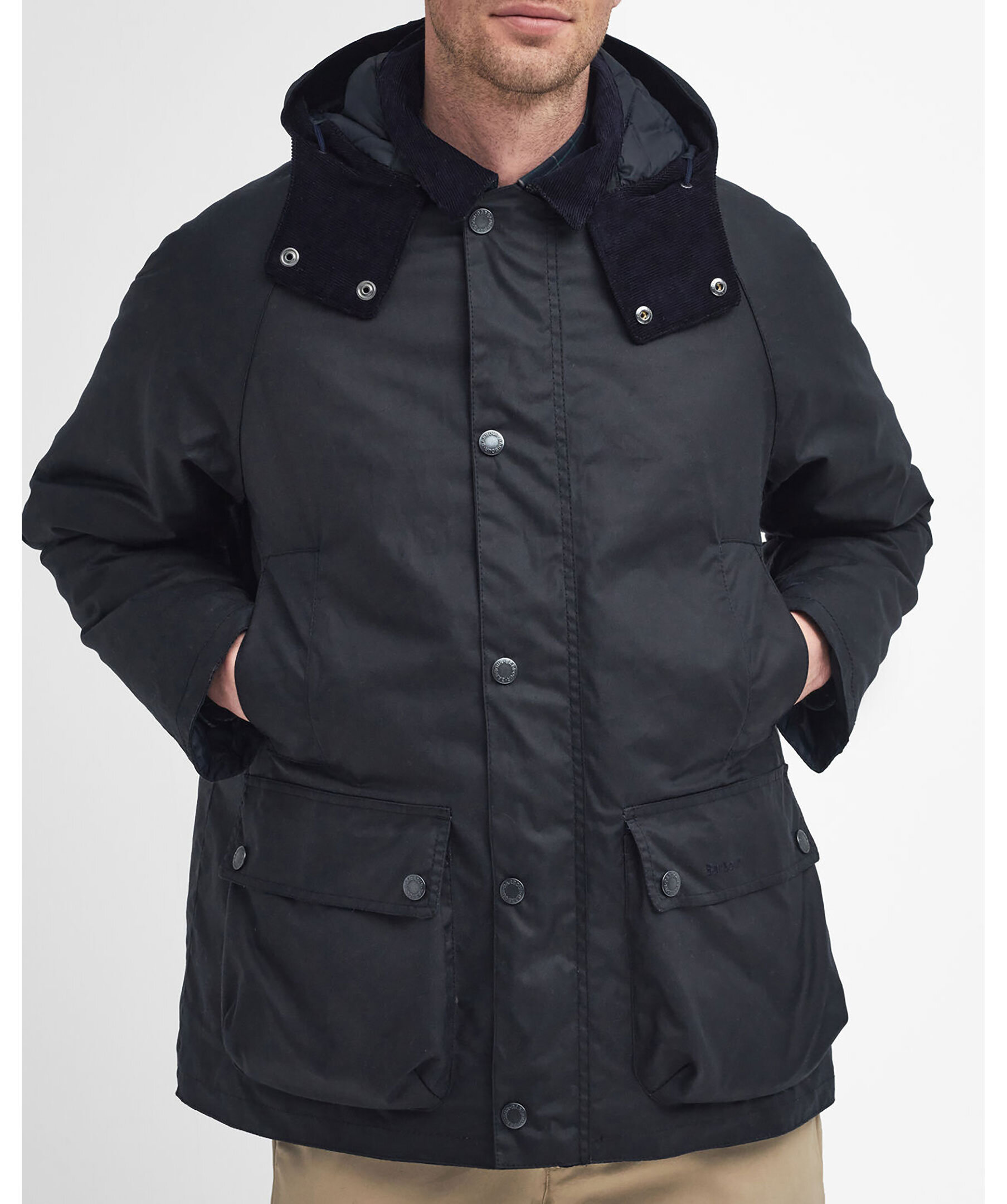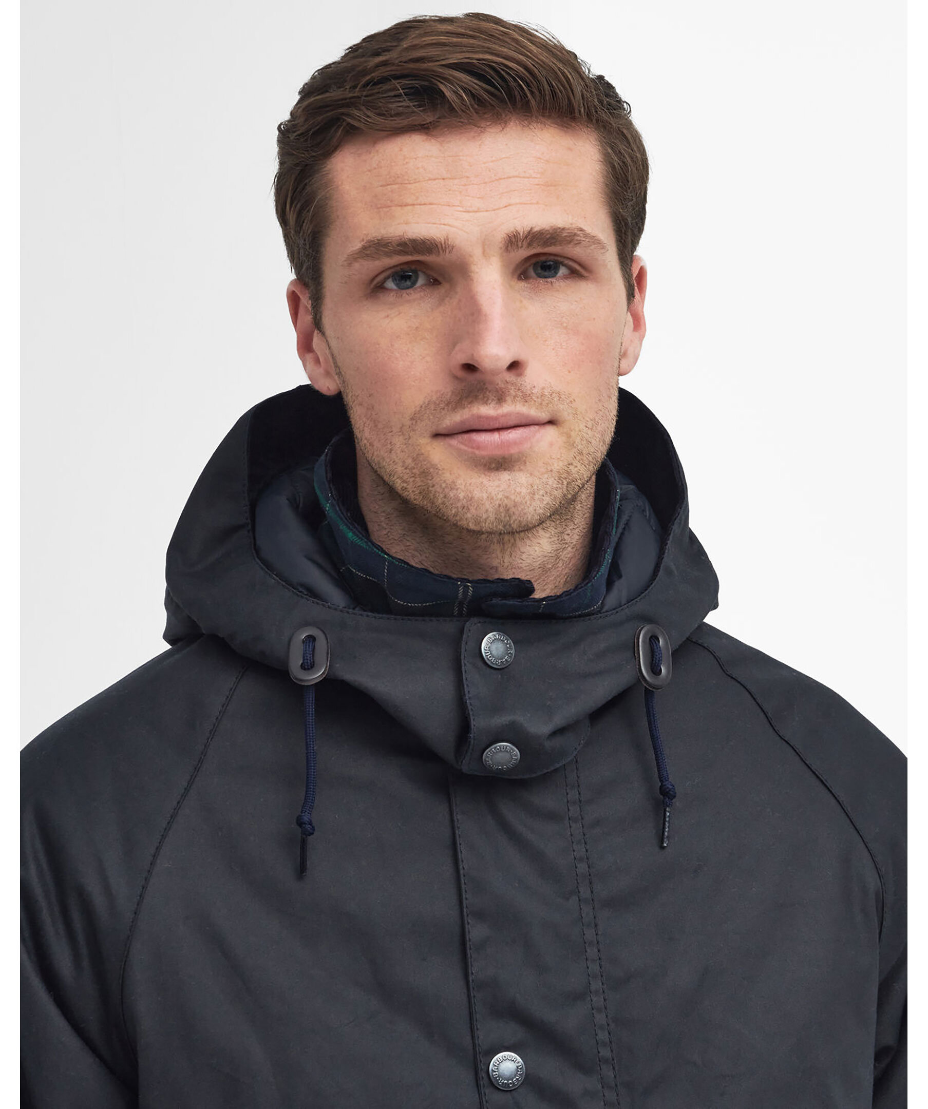 Marinblå jacka från Barbour. Jackan har ett vaxat ytskick, avtagbar huva och quiltat foder. Stängs med dragkedja som kan döljas under knäppningen med knappar. Två fickor med lock och knappar. Tillverkad av vaxas bomull.