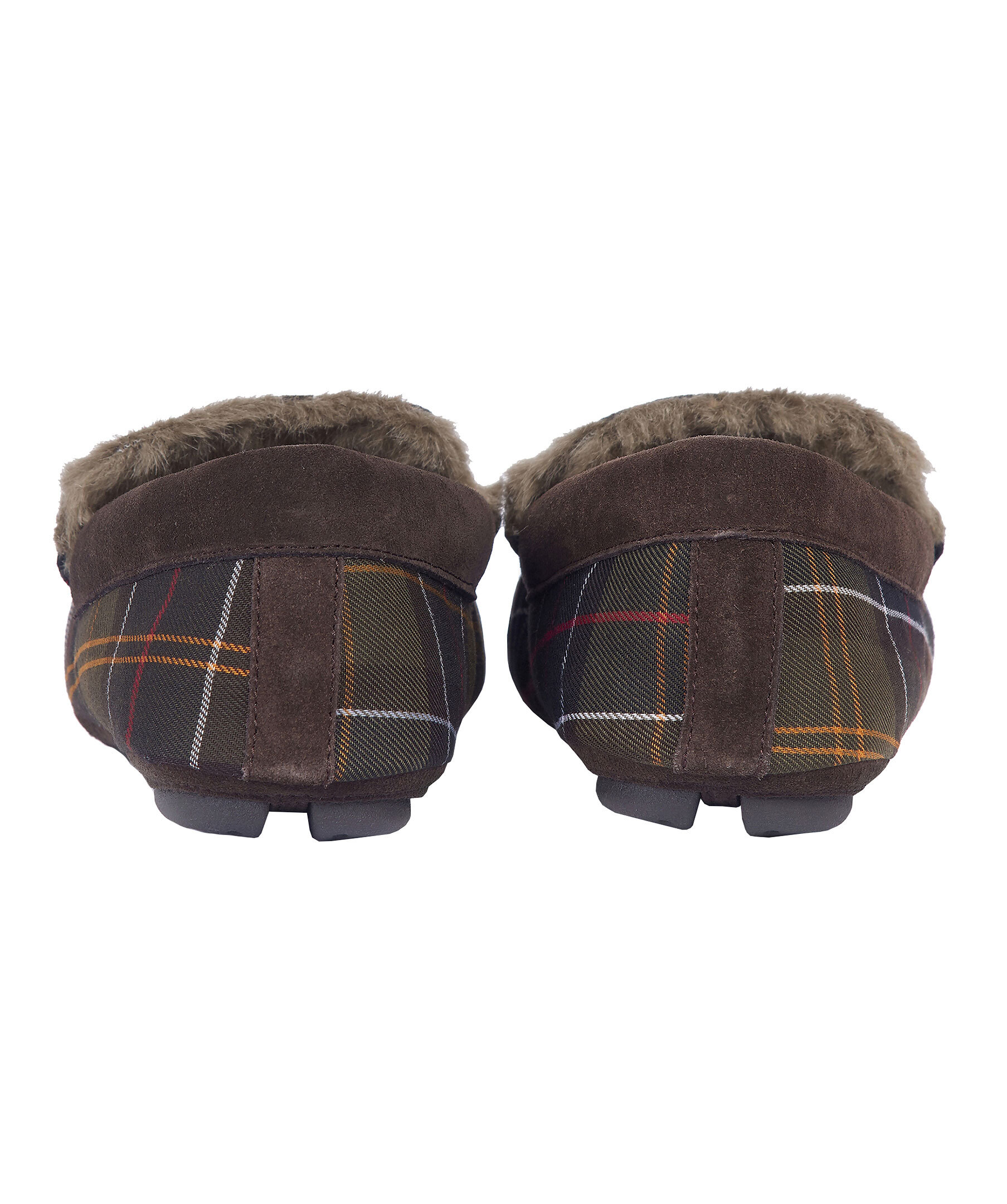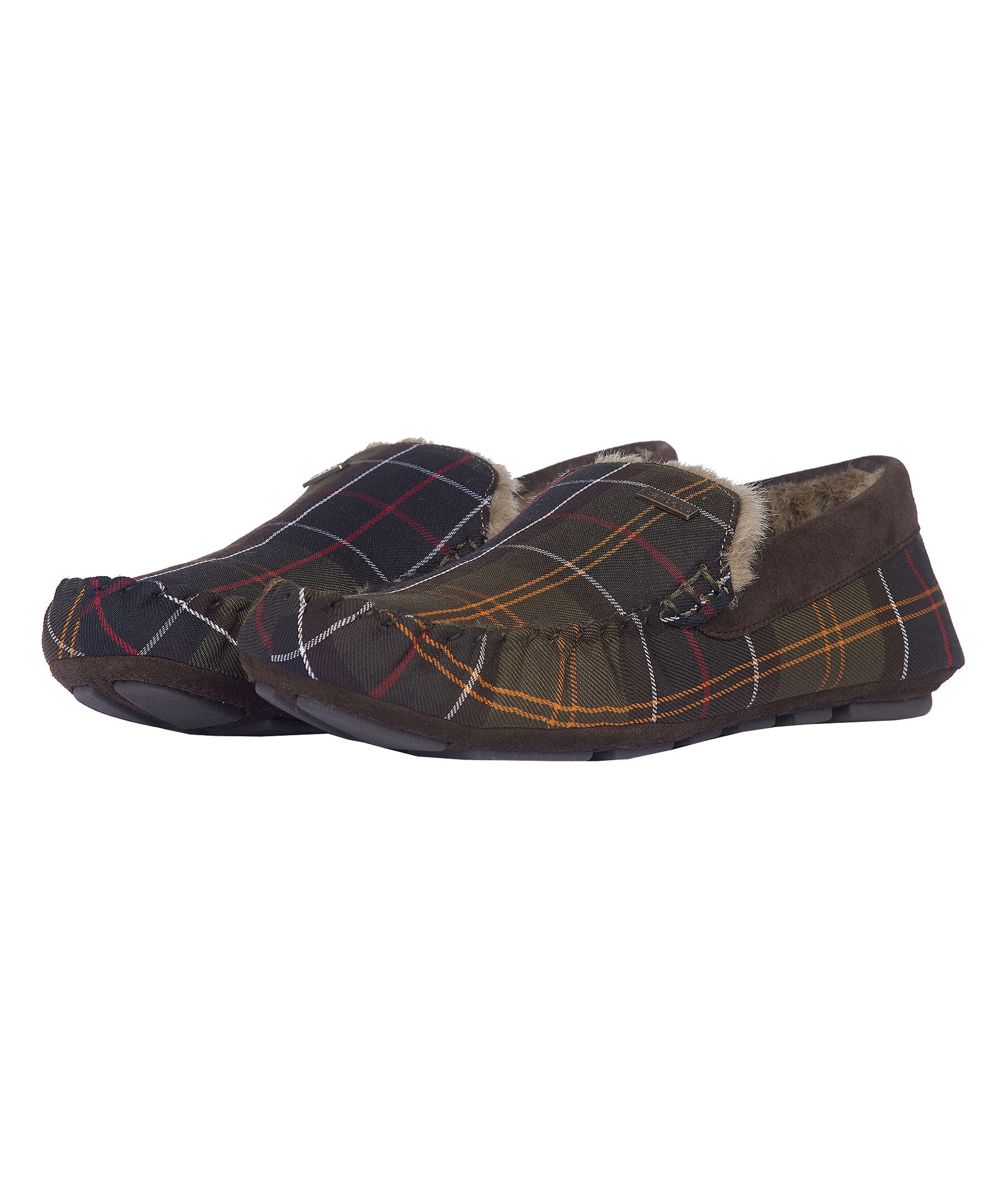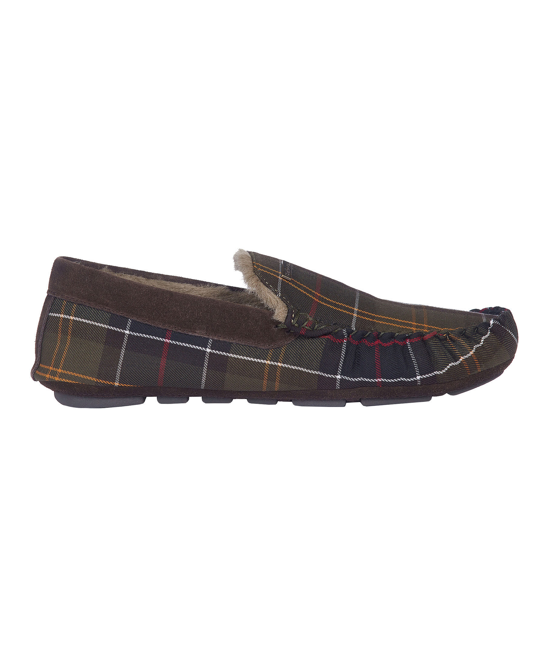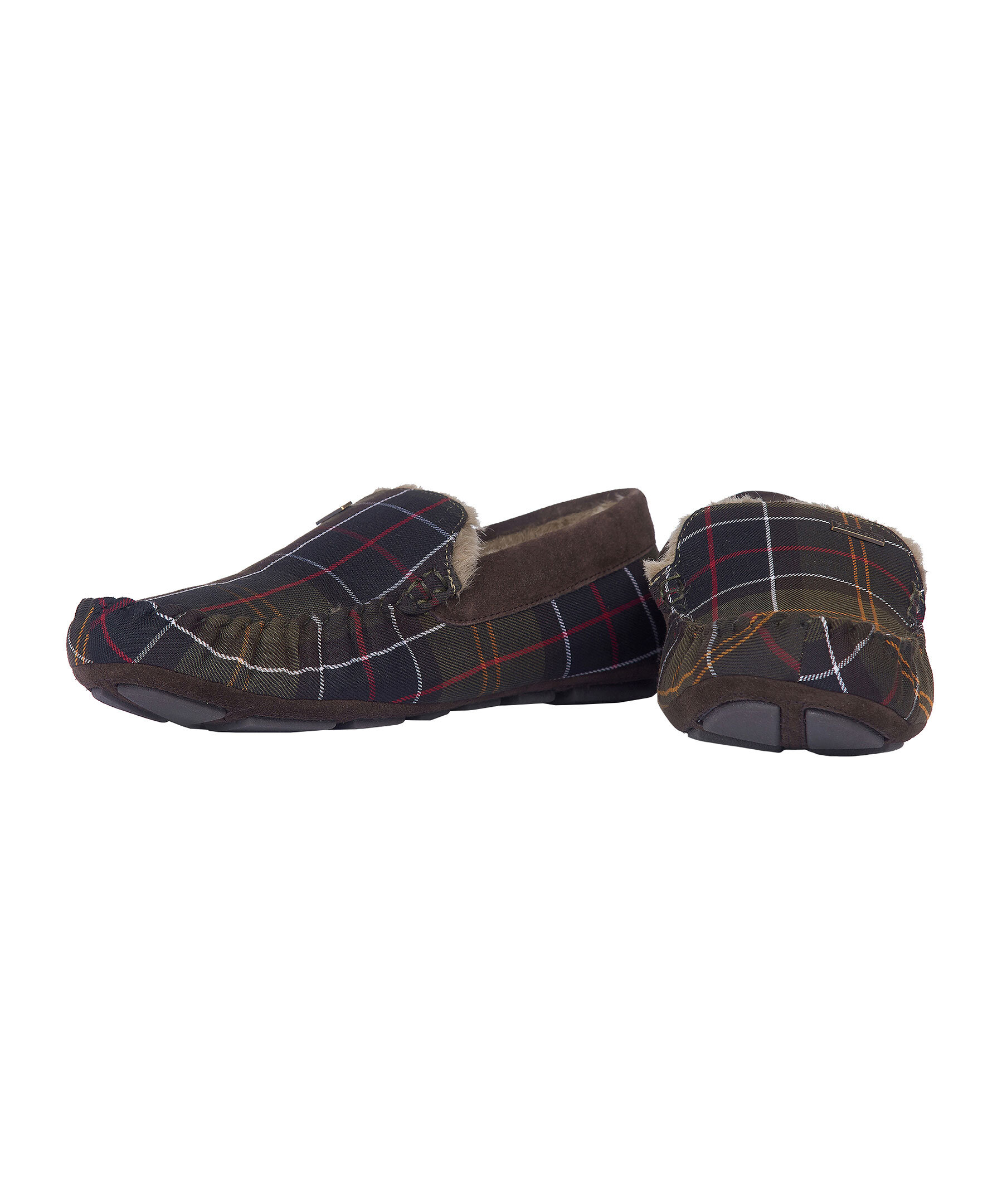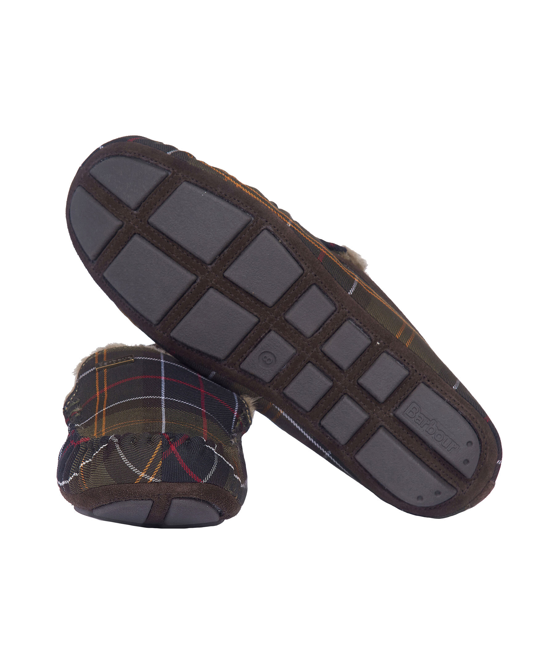 Militärgröna, rutiga innetofflor i mockasinmodell från Barbour. Yttertyg med Barbours klassiska rutmönster, bruna detaljer i mocka runt hålet där man stoppar ner foten och bak vid hälen. Mysigt faux-shearling foder, slitstark gummisula och ett Barbour-märke i metall på ovansidan.