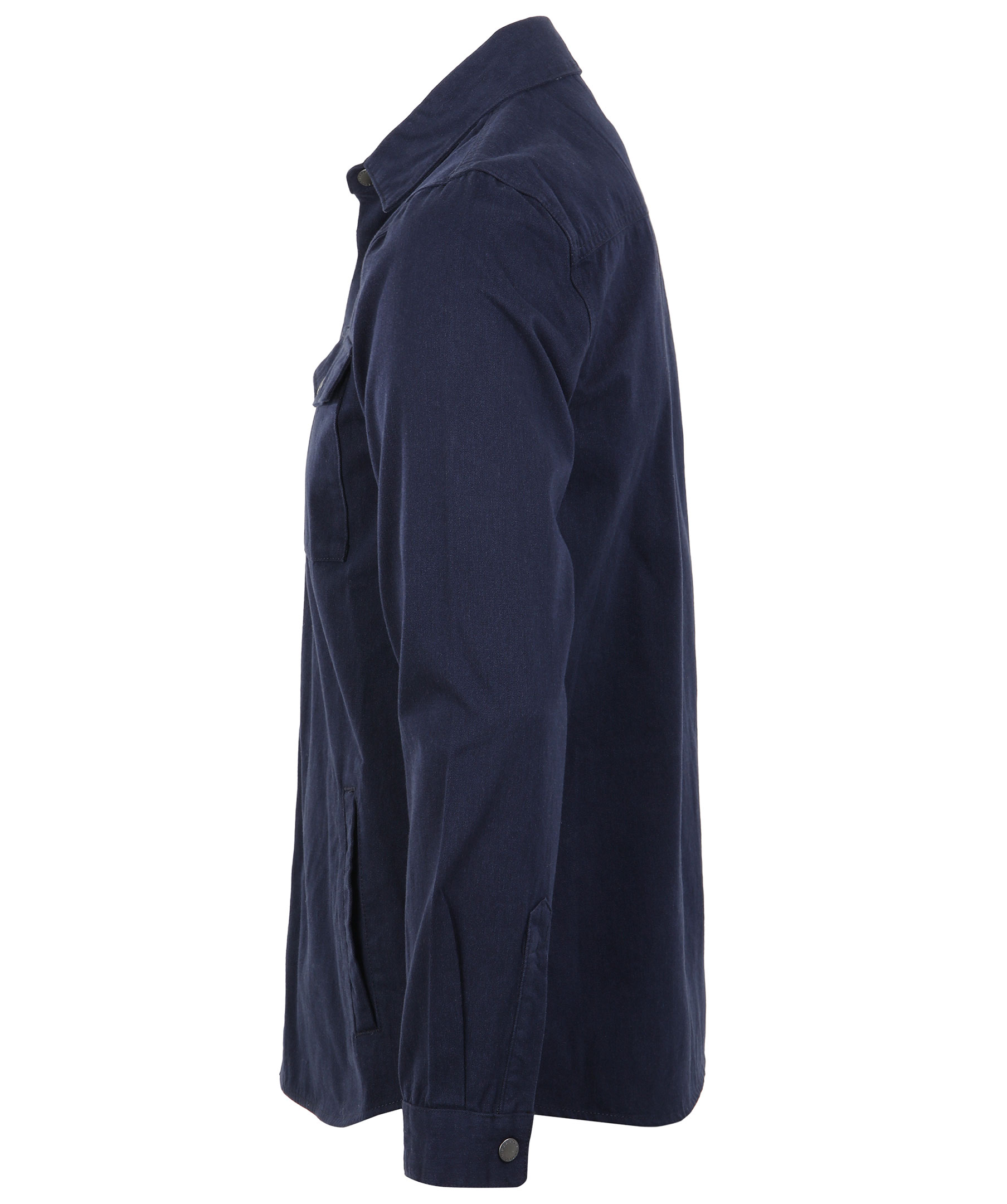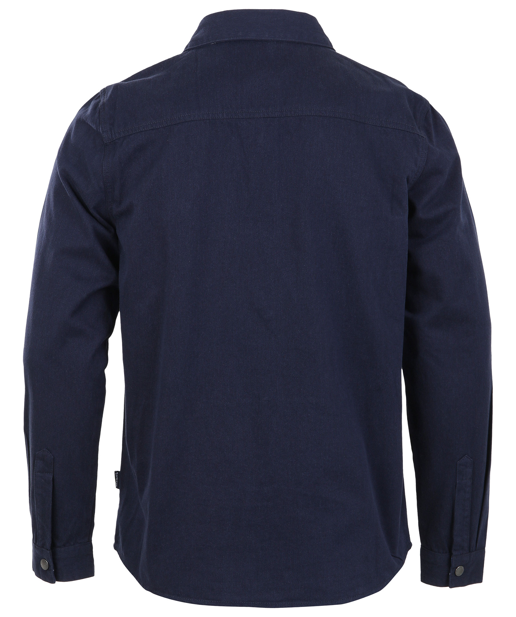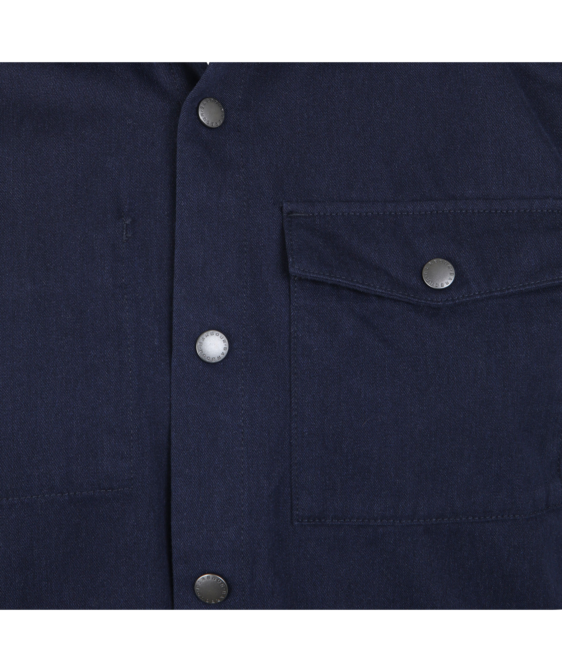 Marinblå overshirt i en rak passform från Barbour International. Tillverkad i 100% bomull. En bröstficka med ficklock och tryckknapp, två snedställda framfickor och en innerficka. Stängs med tryckknappar, har en vikt krage och en liten lapp medbarbourlogotyp på vänster sida nedtill.
