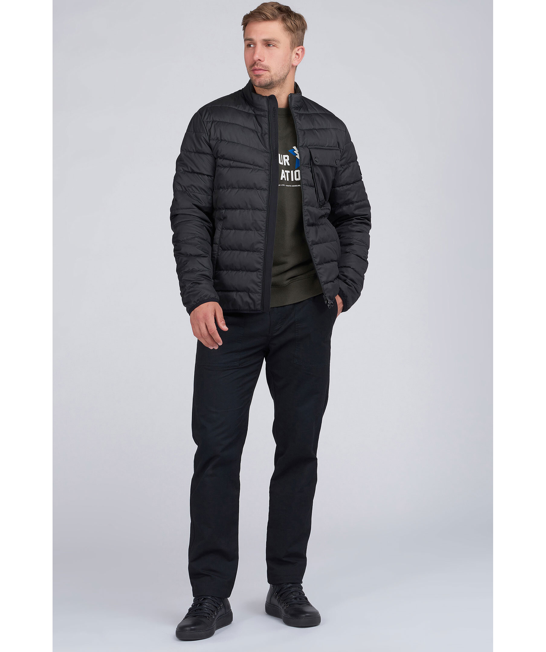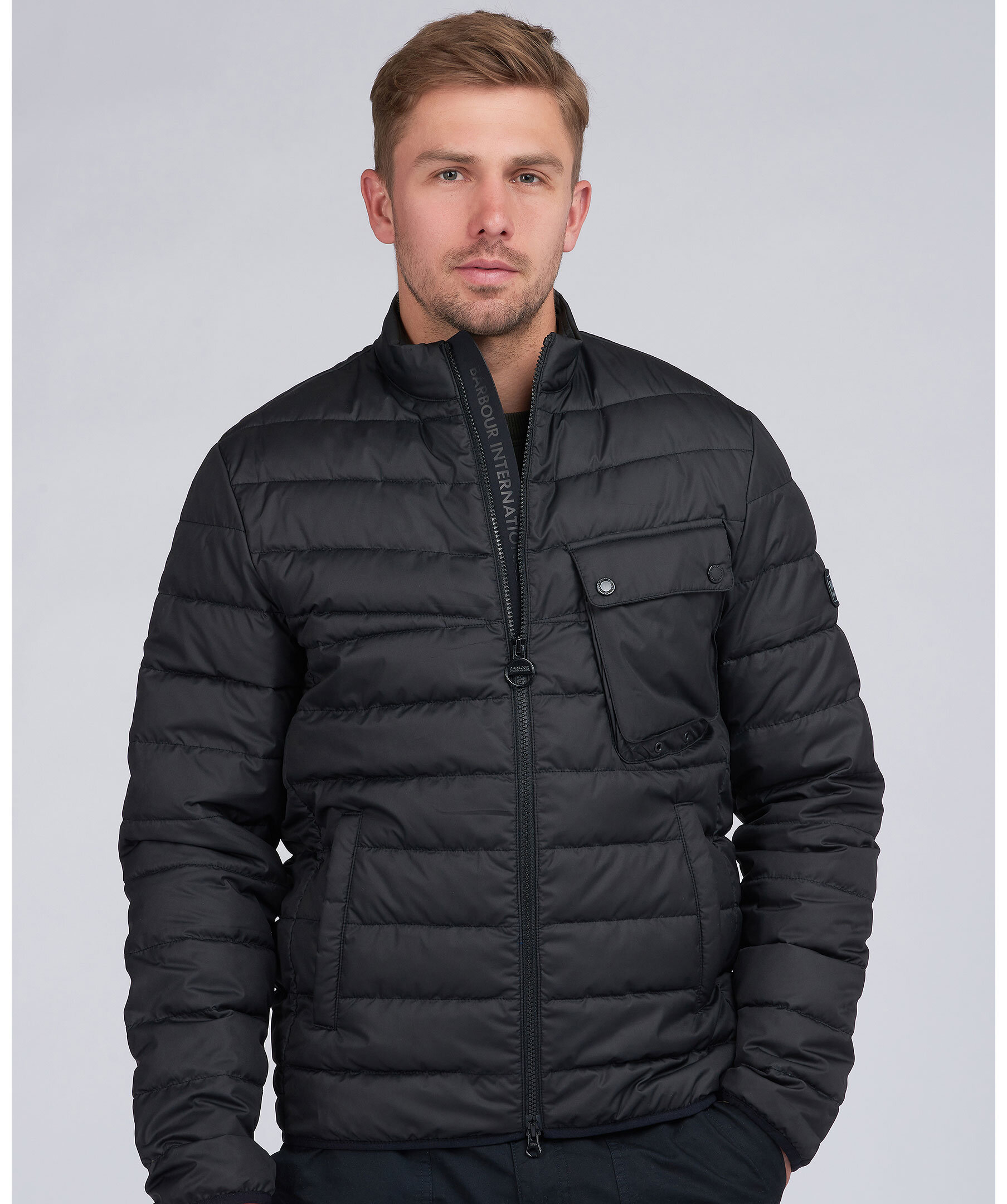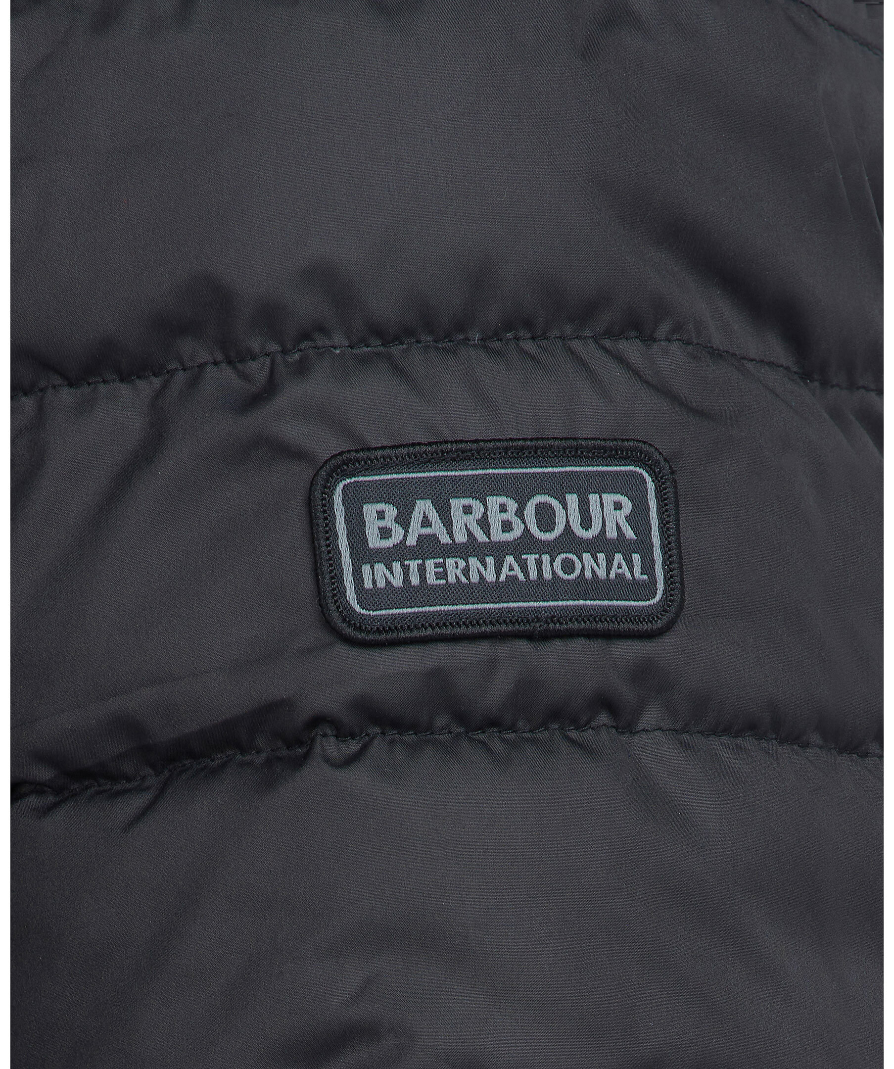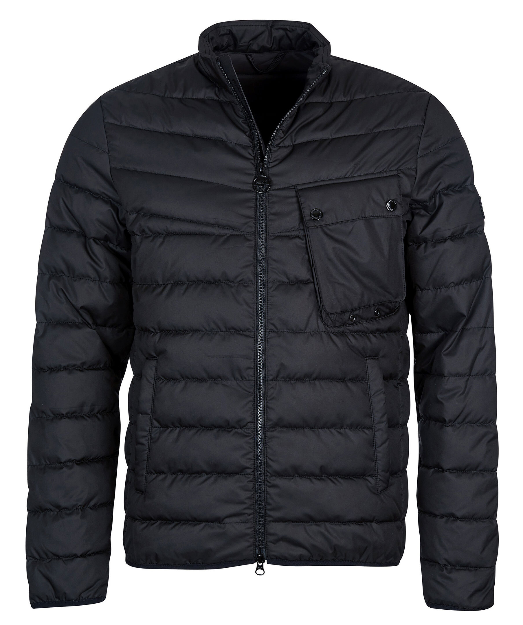 Svart quiltad pufferjacka från Barbour. Stängs framtill med dragkedja. Dragsko i midja och på luva. Patch med logotyp på vänster bröstficka. Bröstficka med lock på vänster sida som stängs med tryckknappar. två öppna sidfickor.