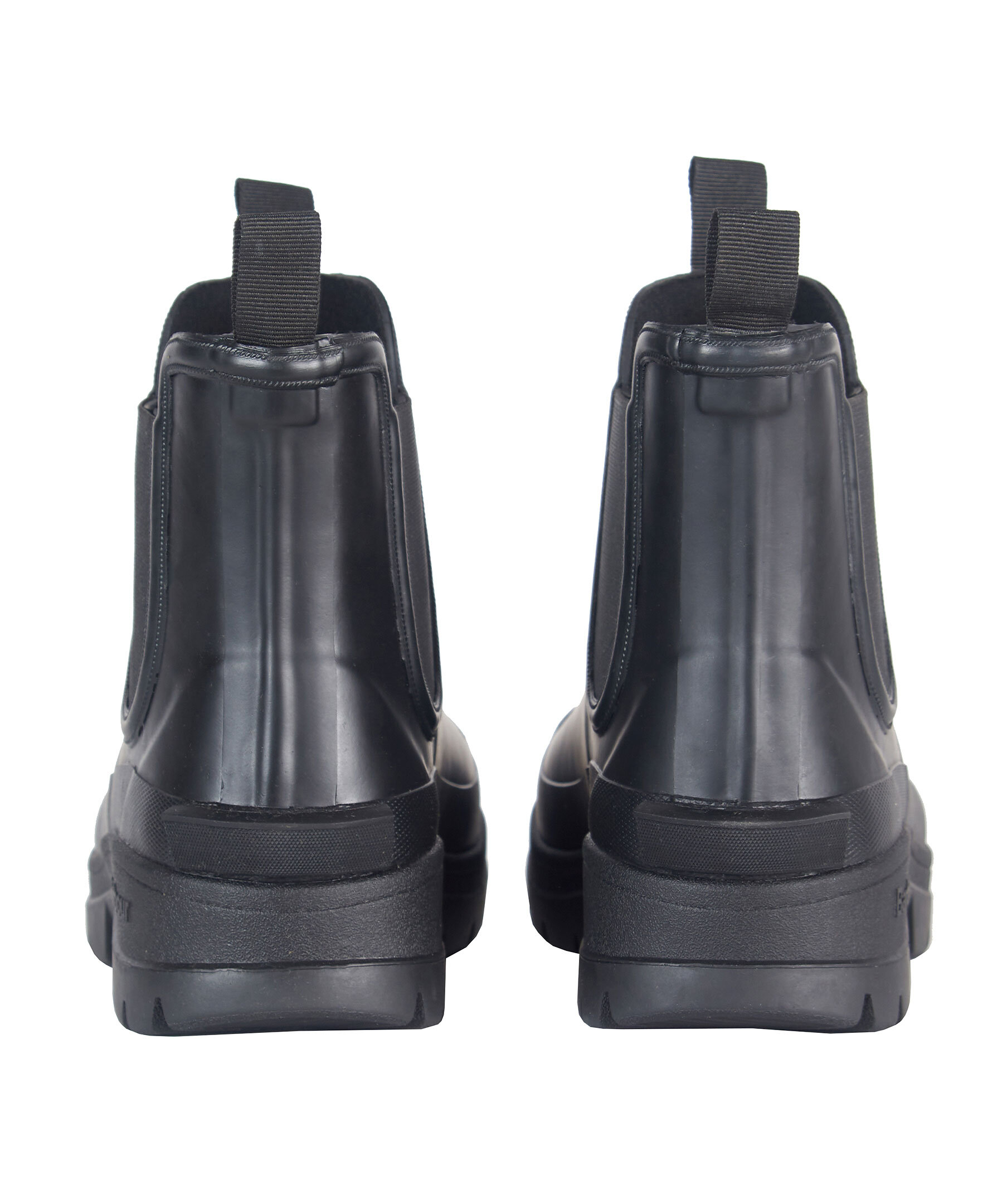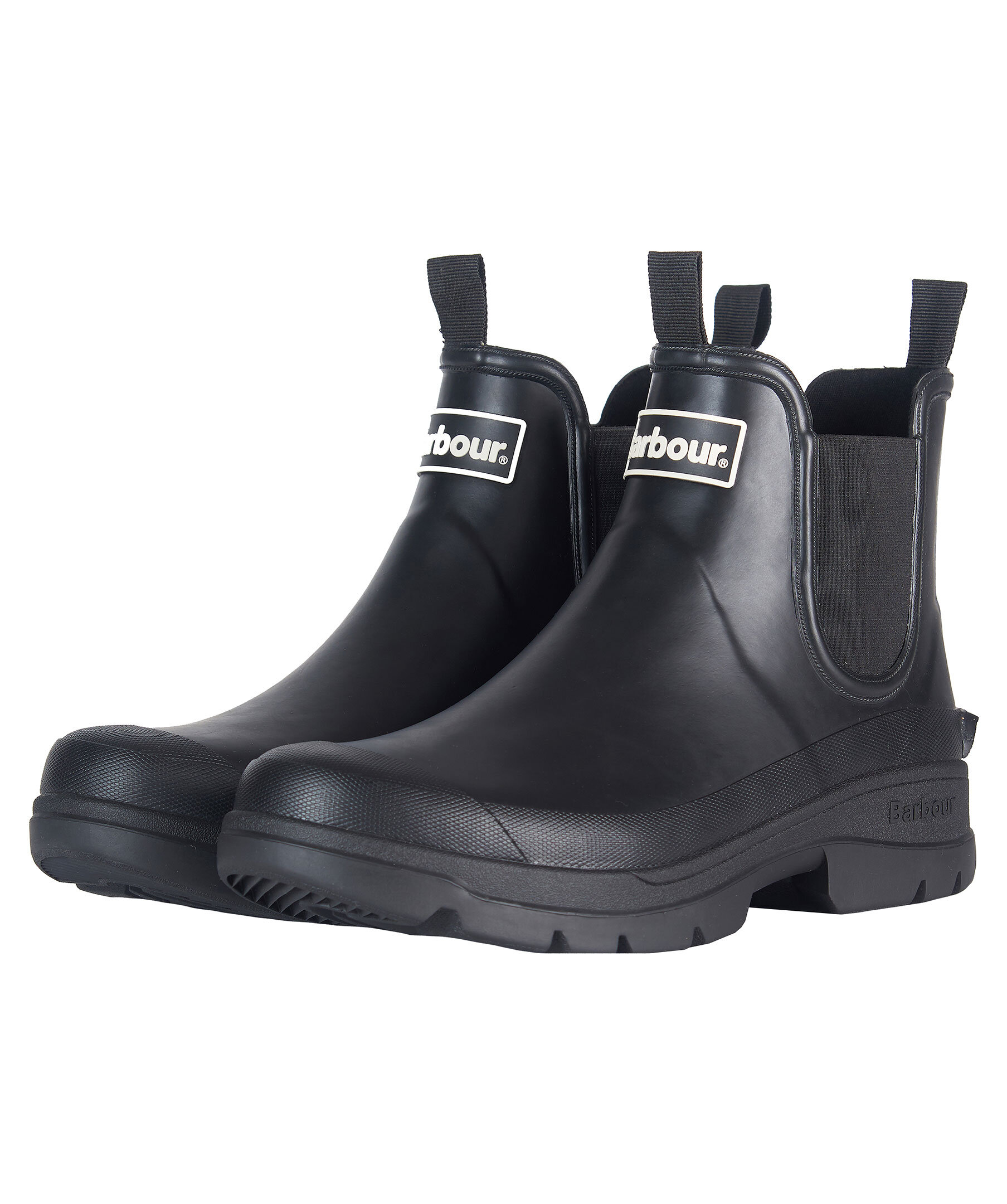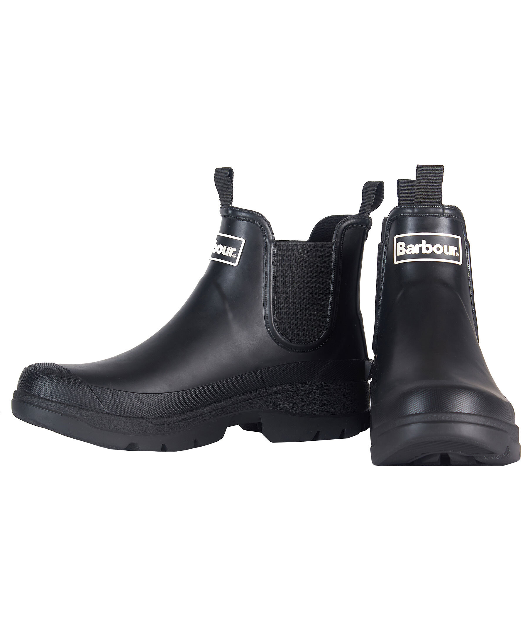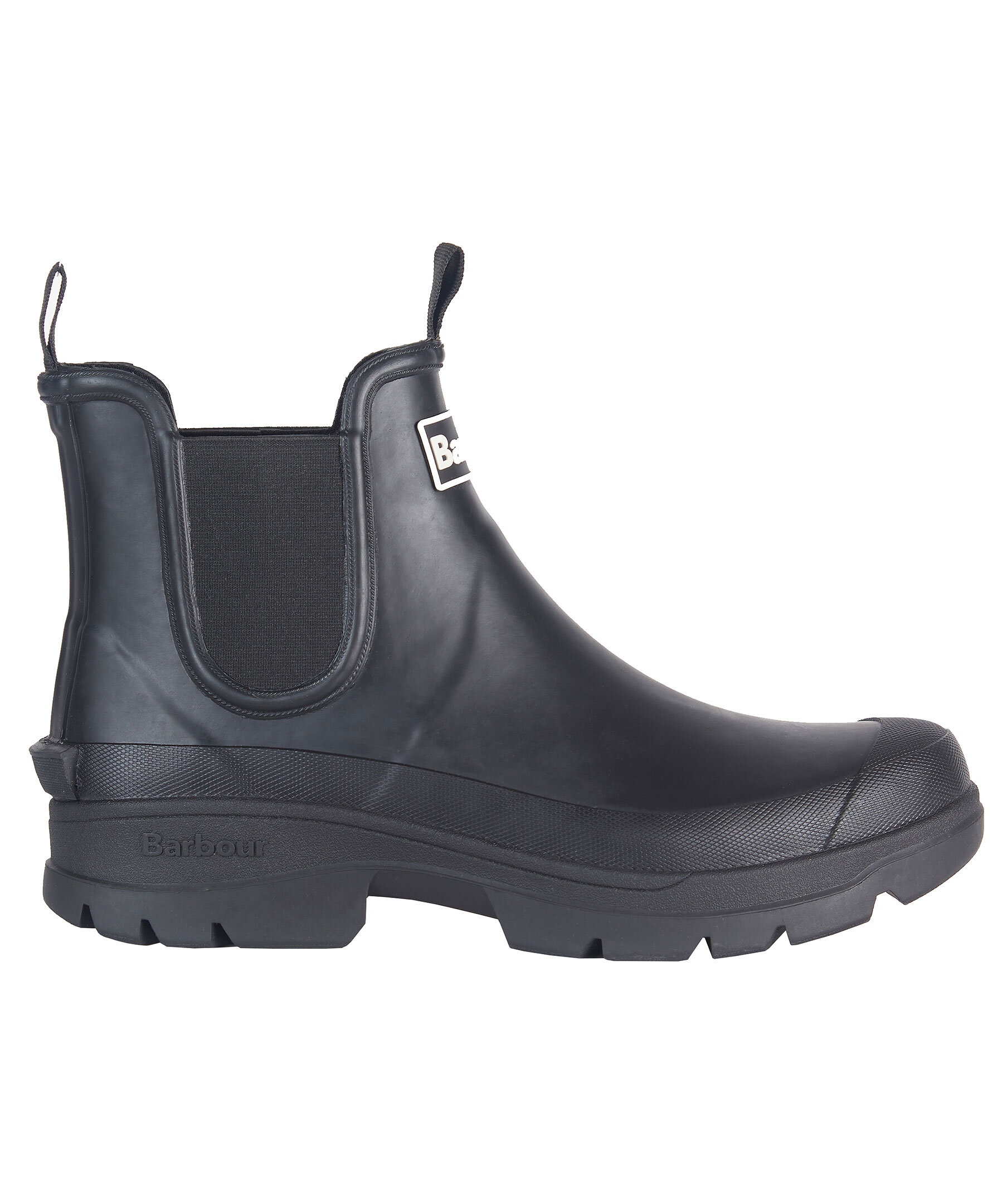 Svarta vattentäta chelseaboots från Barbour i gummi. Grov gummisula för ett stabilt och bra grepp. Logotyp framtill på skon. Resår i sidorna, öglor fram och bak.