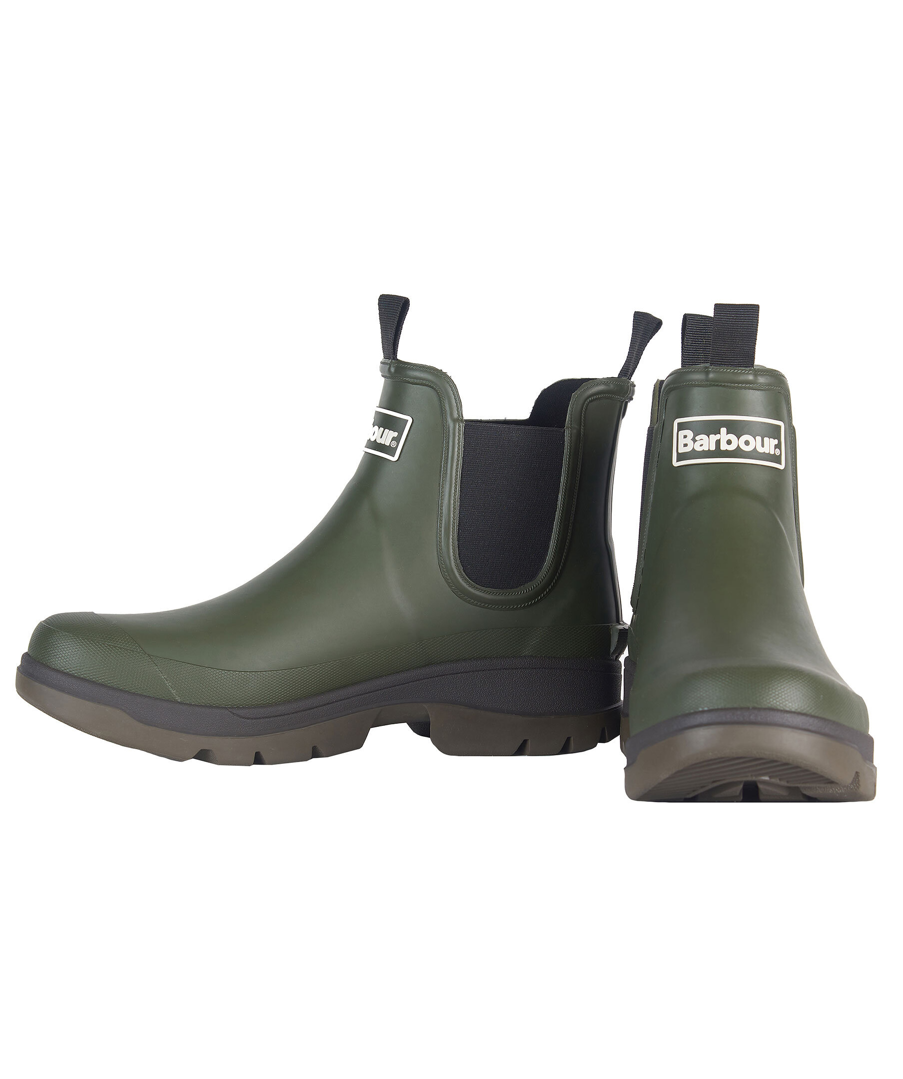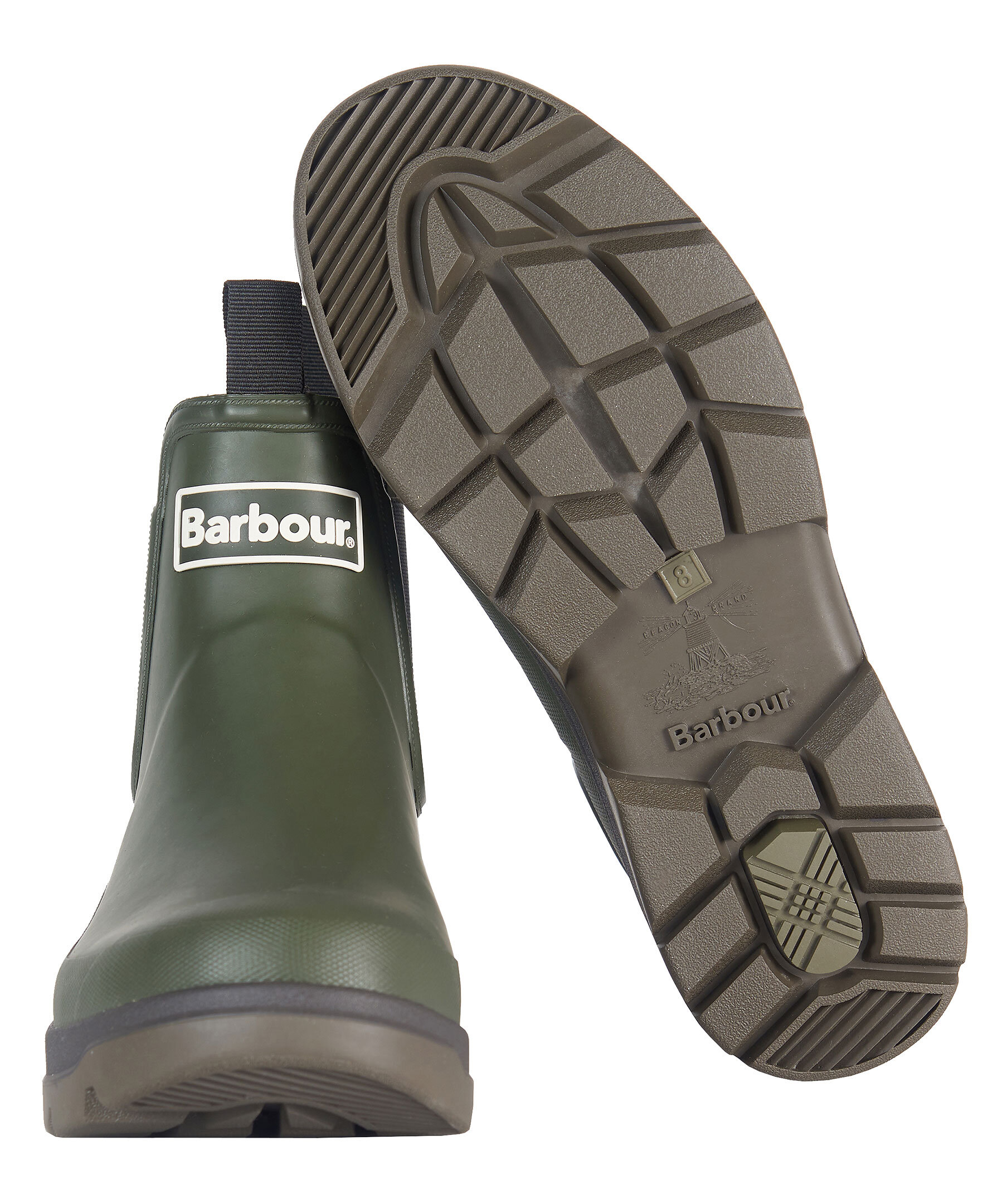 Gröna vattentäta chelseaboots från Barbour i gummi. Grov gummisula för ett stabilt och bra grepp. Logotyp framtill på skon. Resår i sidorna, öglor fram och bak.
