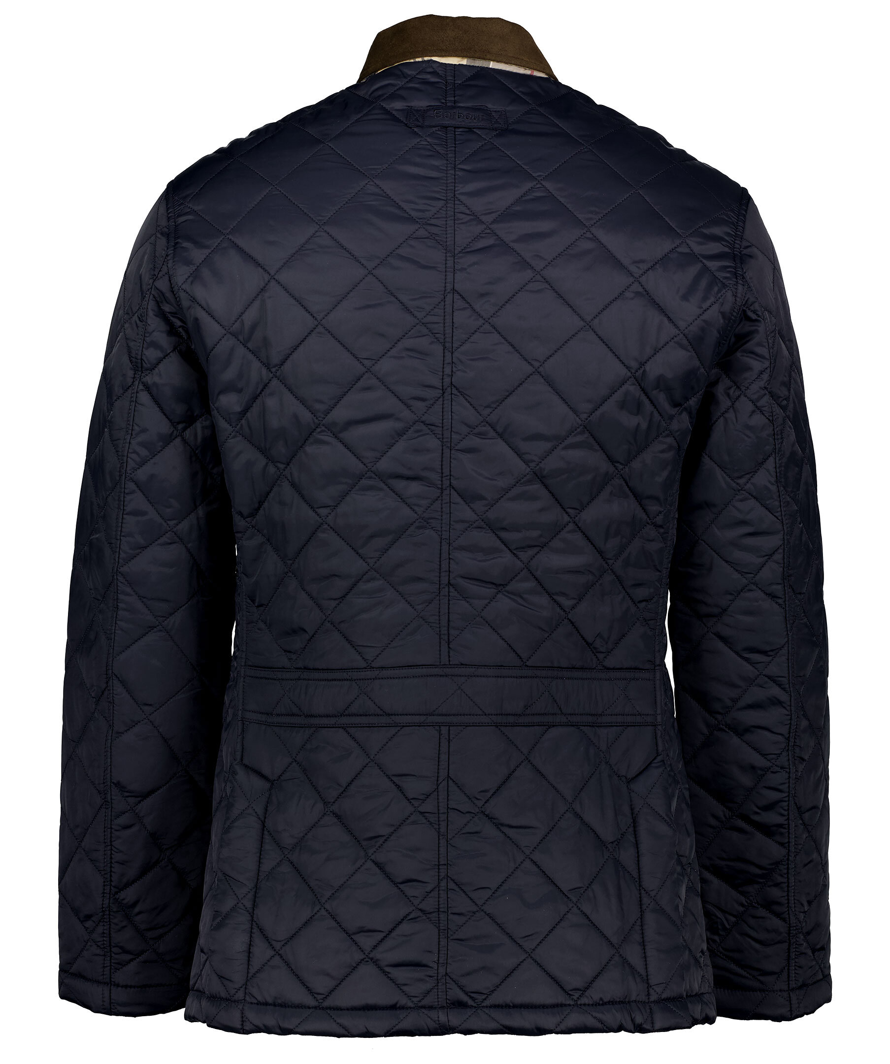 Marinblå quiltad jacka i 100% polyamid från Barbour. Fodrad i polyester, har en krage med brunt foder och rutig baksida samt ett spänne fram. Två fickor fram med ficklock och knapp, diskret logga på vänster ficklock och två innerfickor med dragkedja. Dubbla sprund bak med tryckknappar. Stängs med dold tvåvägsdragkedja och knappar.