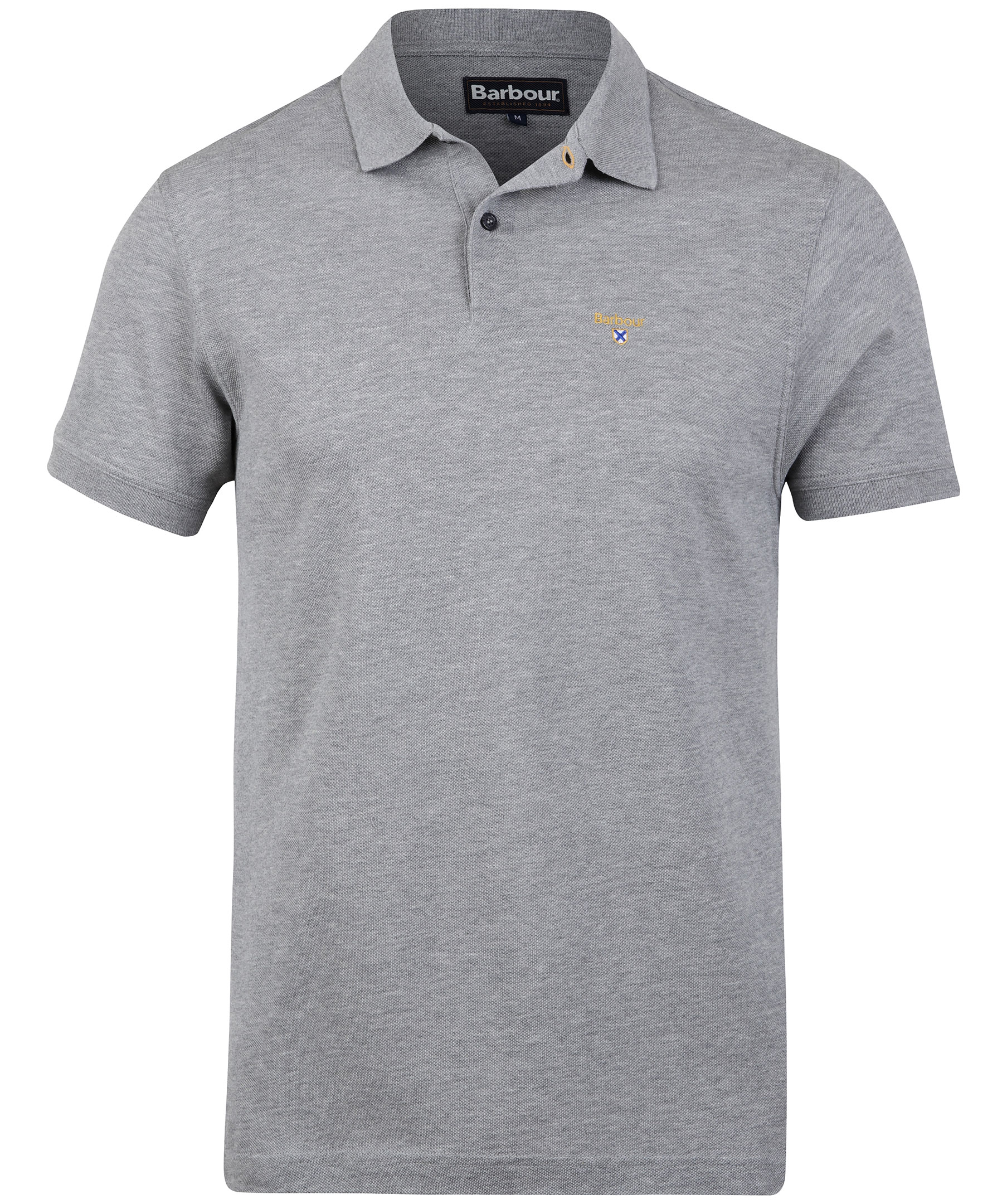 Grå pikétröja från Barbour. Tillverkad i 100% bomull. Broderad logotyp på bröstet, korta ärmar.