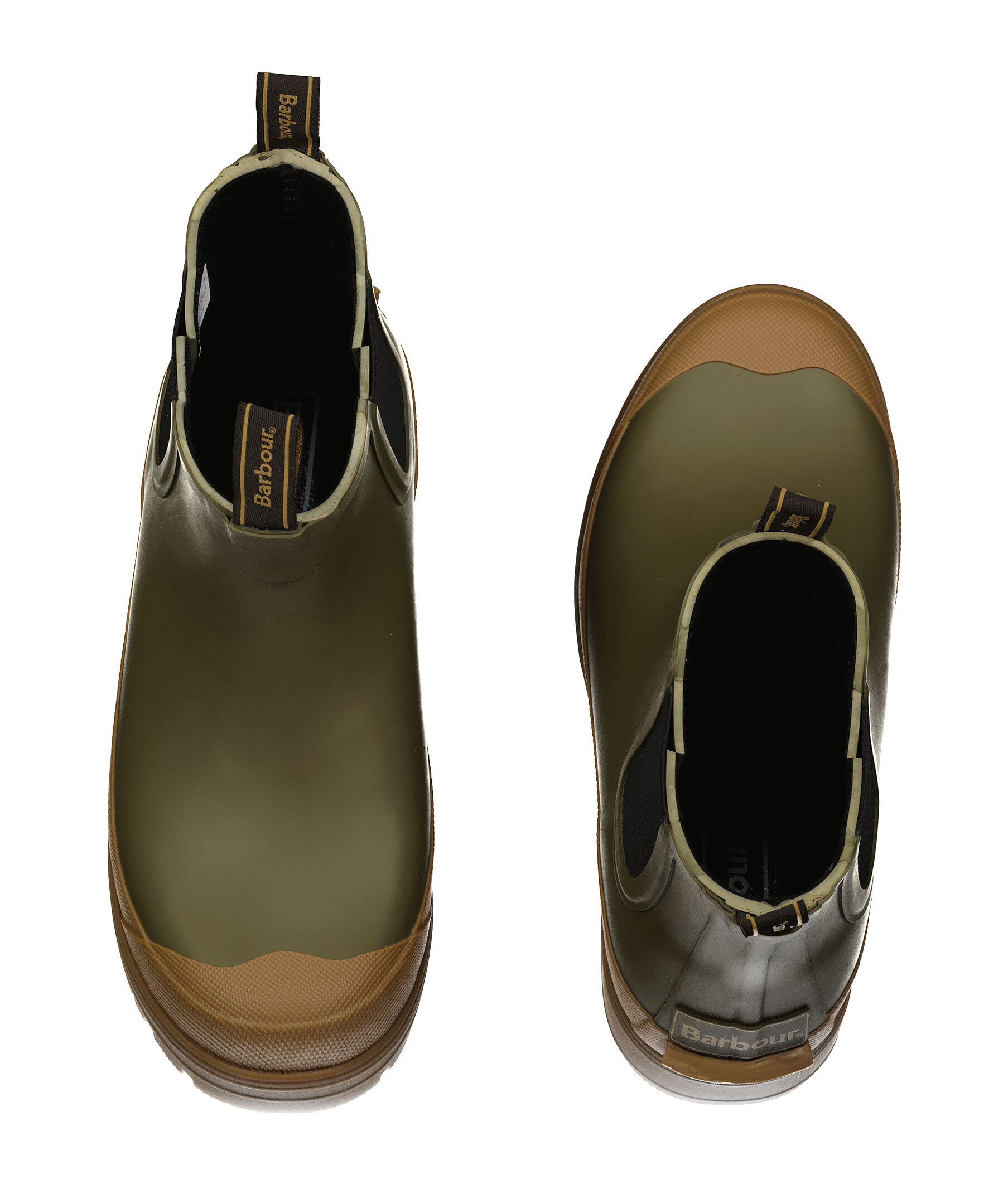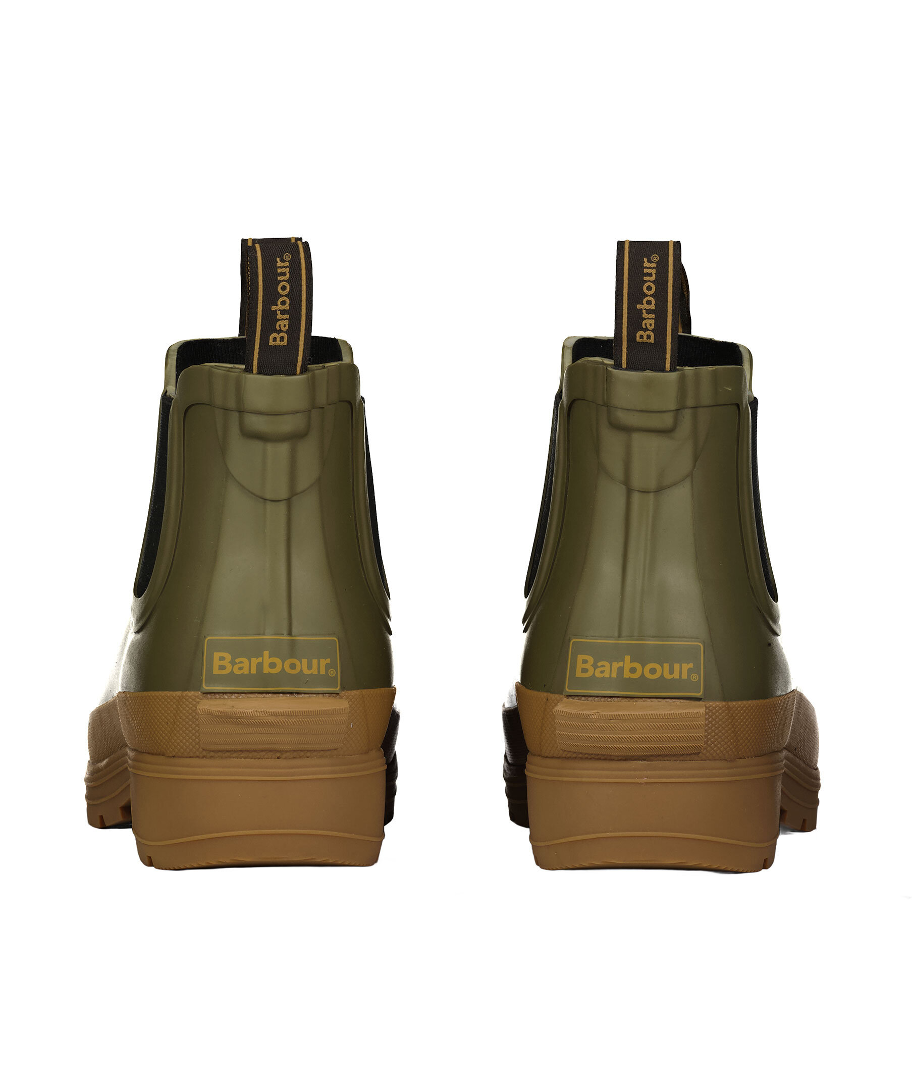 Militärgröna, låga gummistövlar från Barbour. Med elastiska sidopaneler och dragflikar är de lätta att ta av och på när du är på språng. Stövlarna har en beige sula och logotyp på dragflikarna.