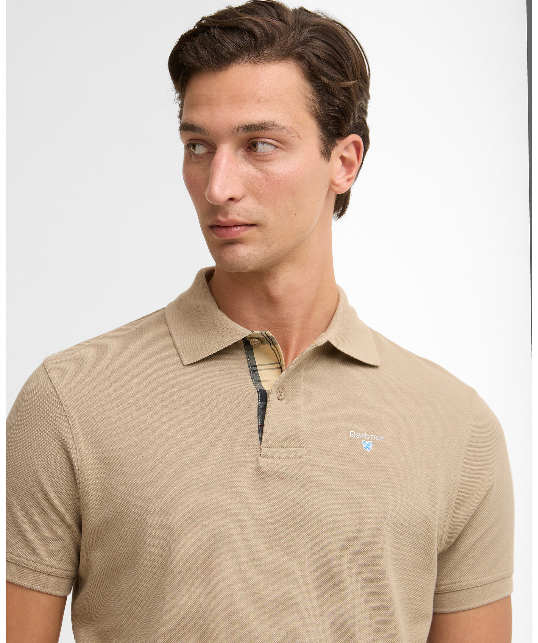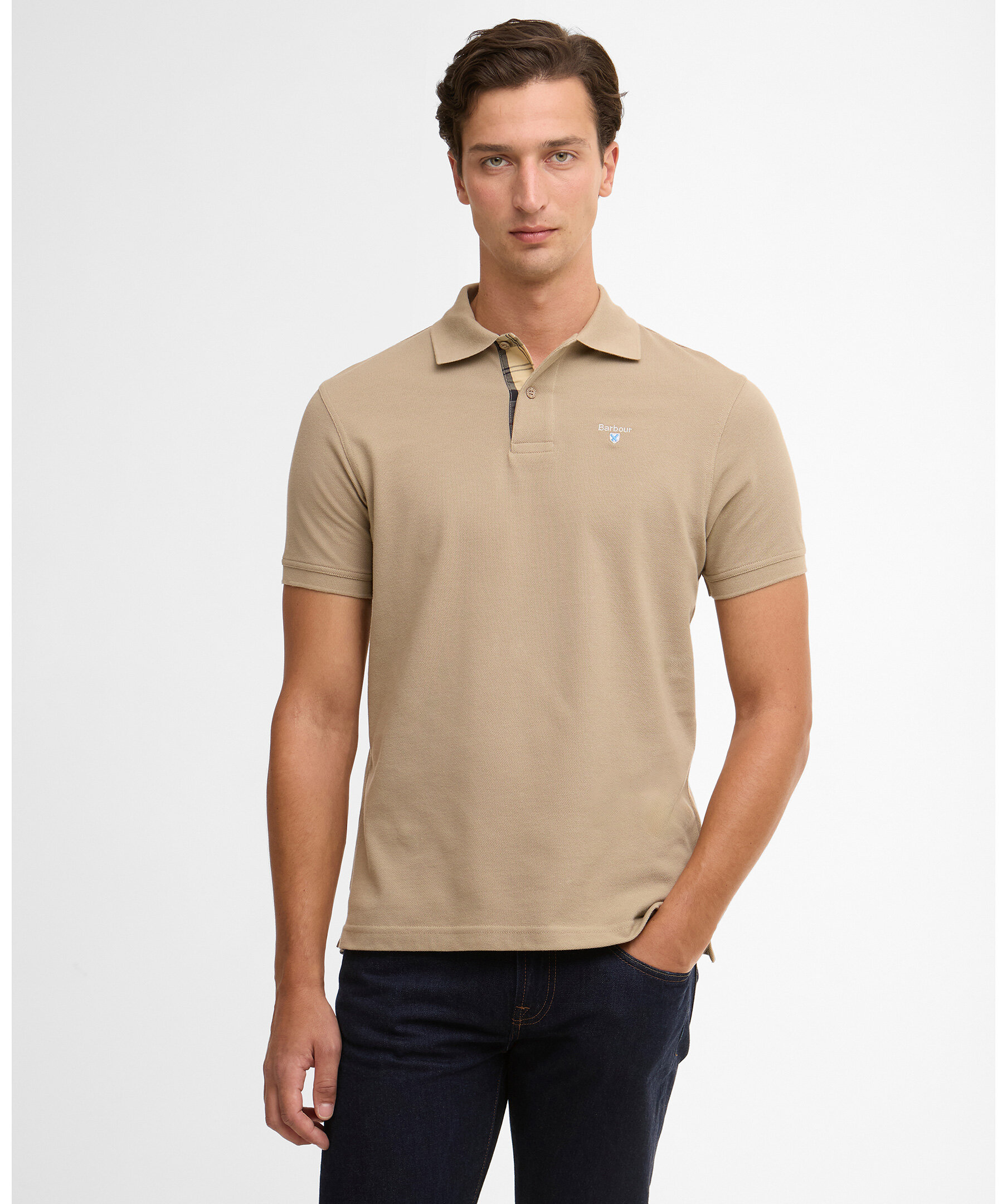 Beige piké från Barbour - en klassisk piké med kontrasttartan vid krage och manschetter samt subtil Barbour‑broderad logotyp på bröstet. En tidlös och mångsidig pikétröja som passar både smart casual och vardagsstil.