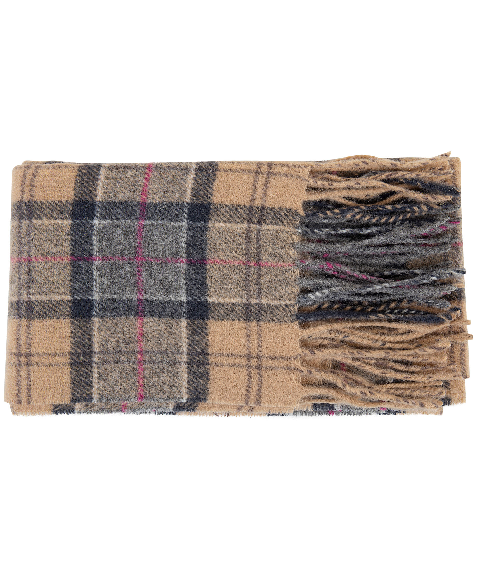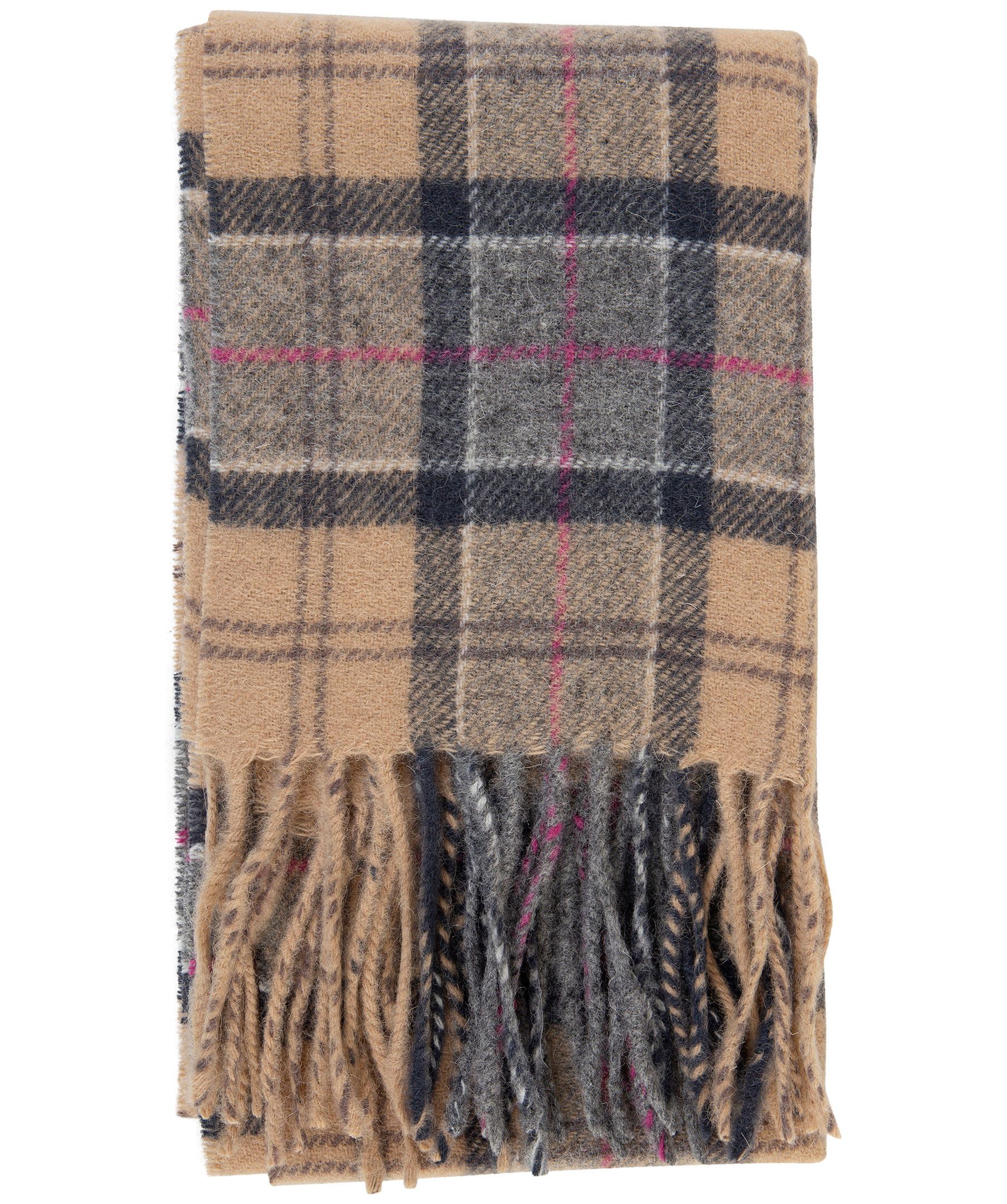 Beige, klassiskt rutig scarf i ull från Barbour. Fransar i kanterna och tillverkad i 100% ull. Mått: 25 cm bredd, 180 cm längd.