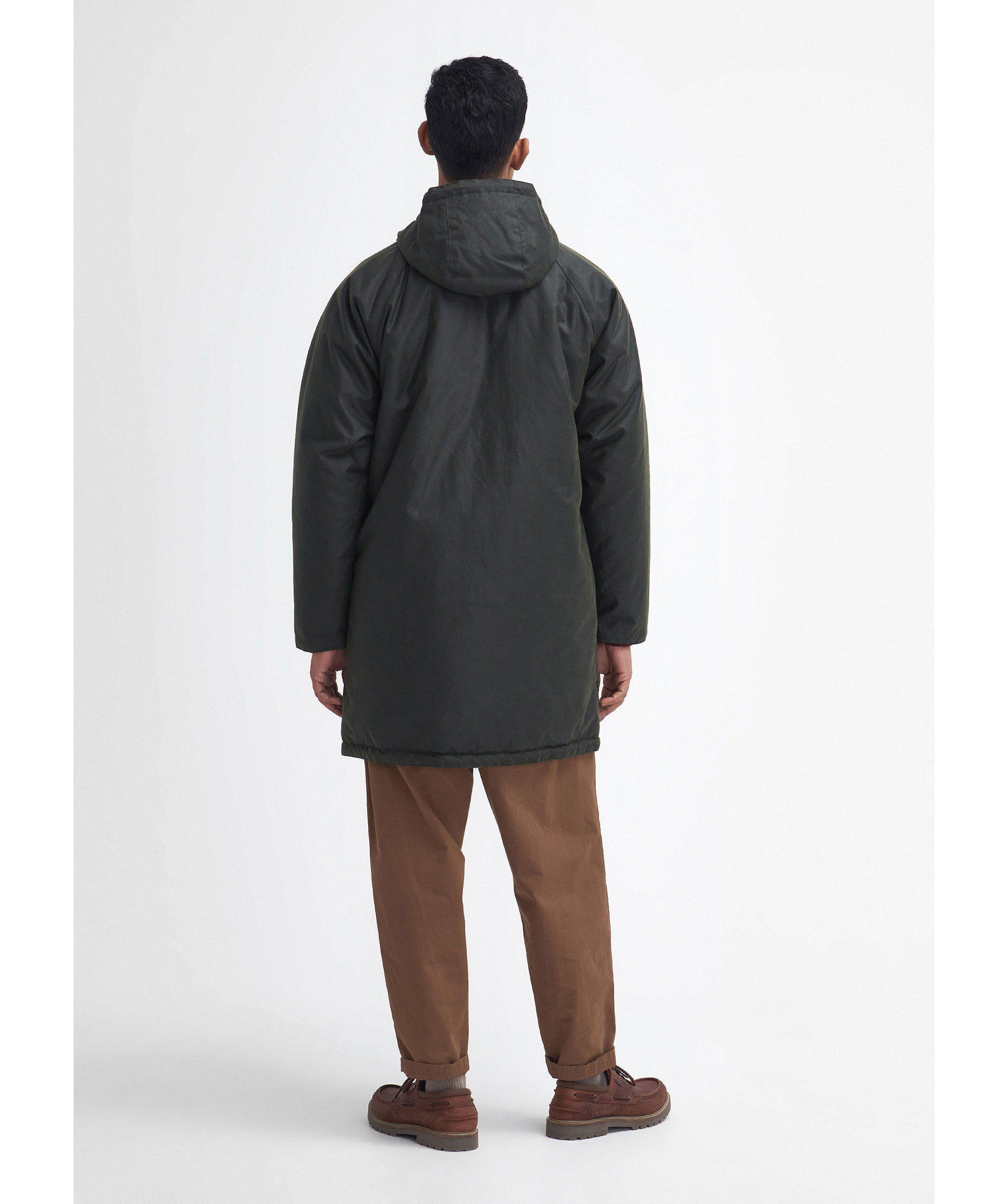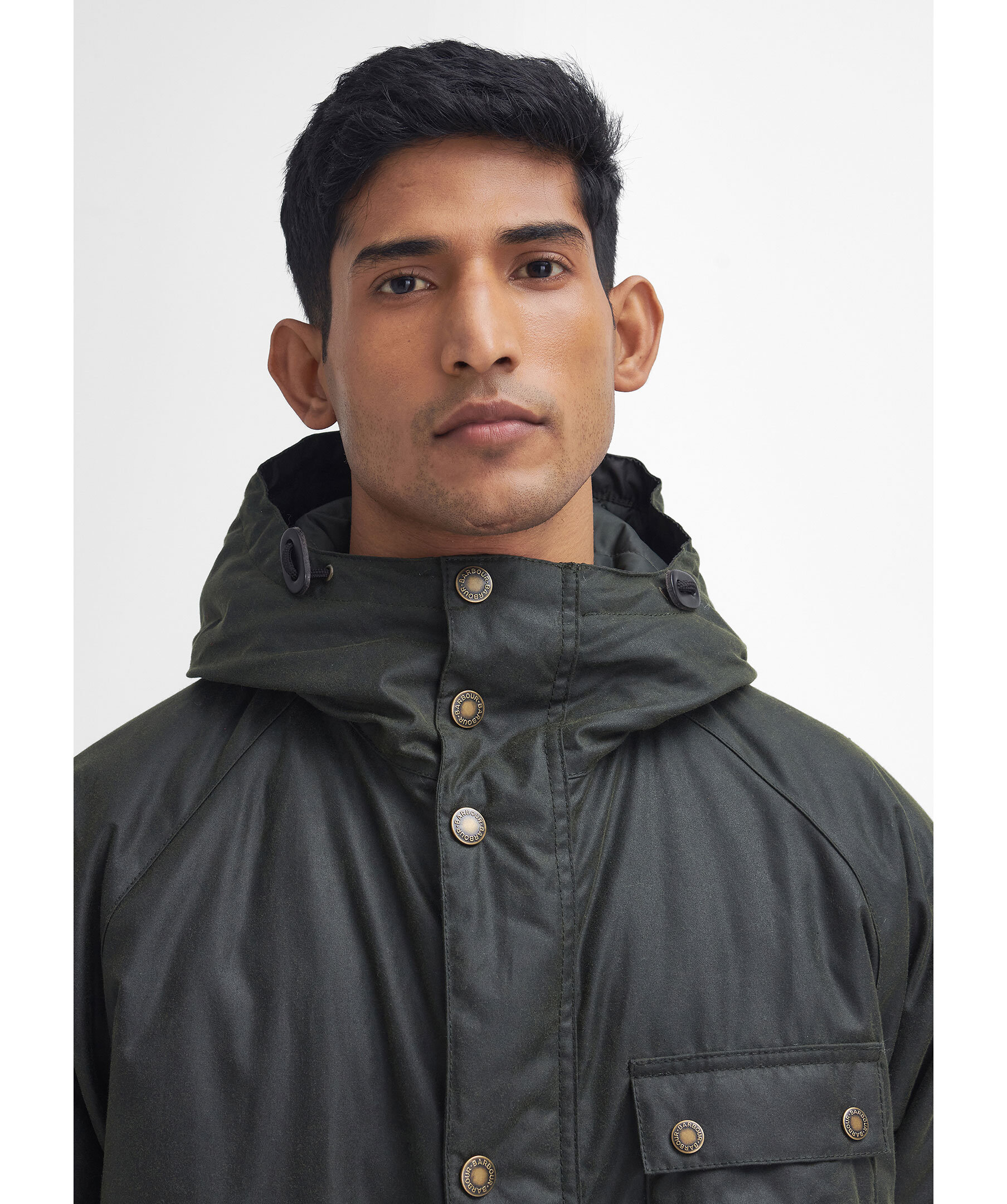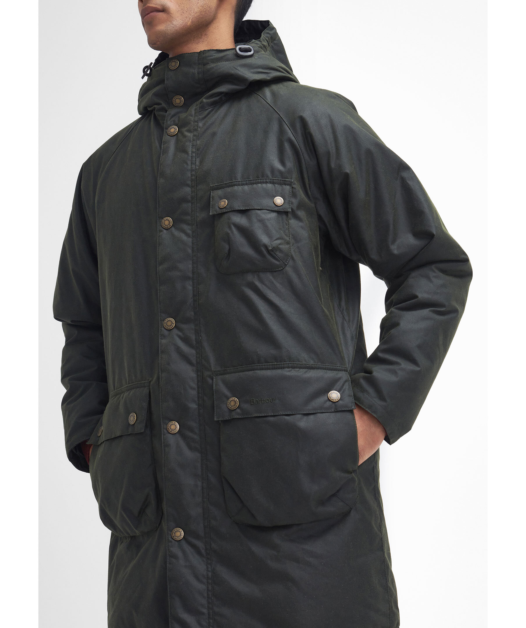 Mörkgrön vaxad parka från Barbour. Jackan stängs med dold dragkedja och tryckknappar och har huva, två stora, patchade fickor med tryckknappar samt en bröstficka med tryckknappar. Tillverkad av slitstark Barbour-vaxad bomull.