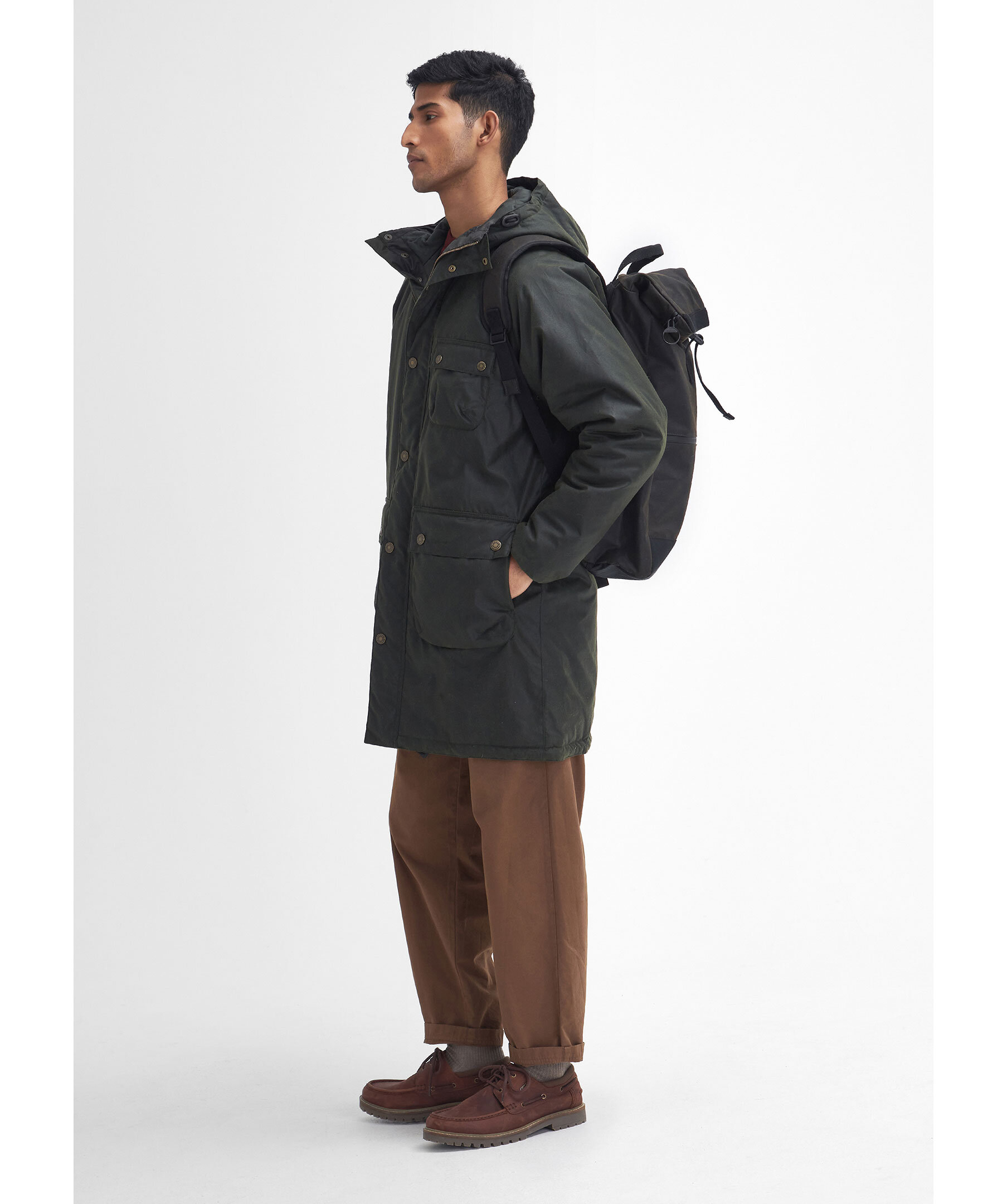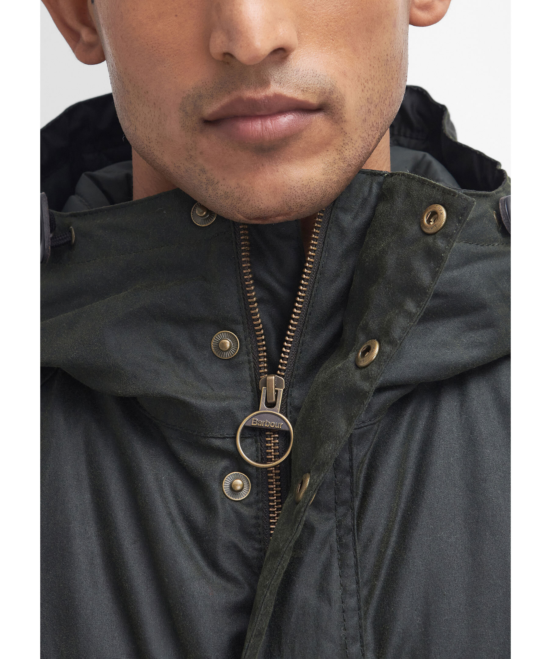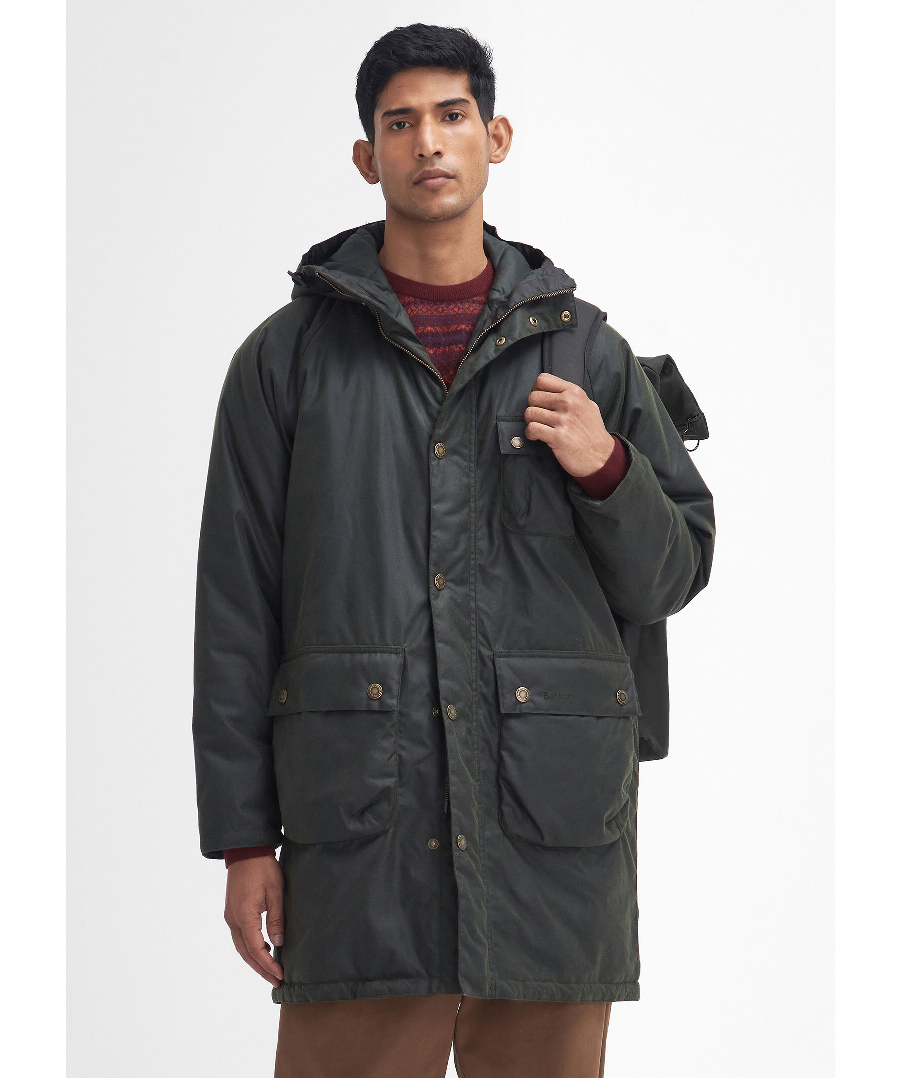 Mörkgrön vaxad parka från Barbour. Jackan stängs med dold dragkedja och tryckknappar och har huva, två stora, patchade fickor med tryckknappar samt en bröstficka med tryckknappar. Tillverkad av slitstark Barbour-vaxad bomull.