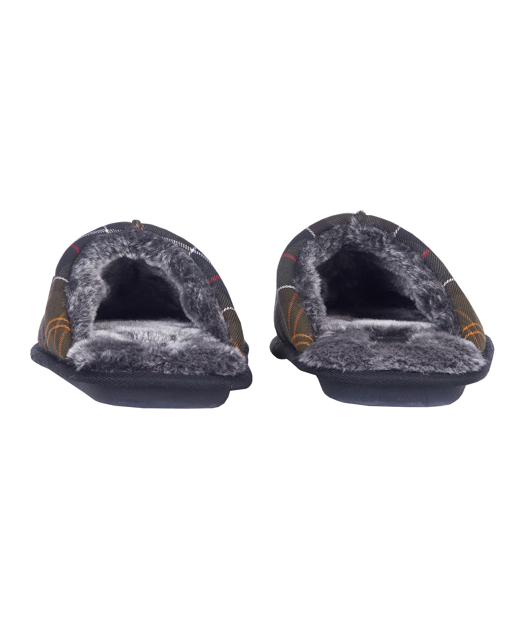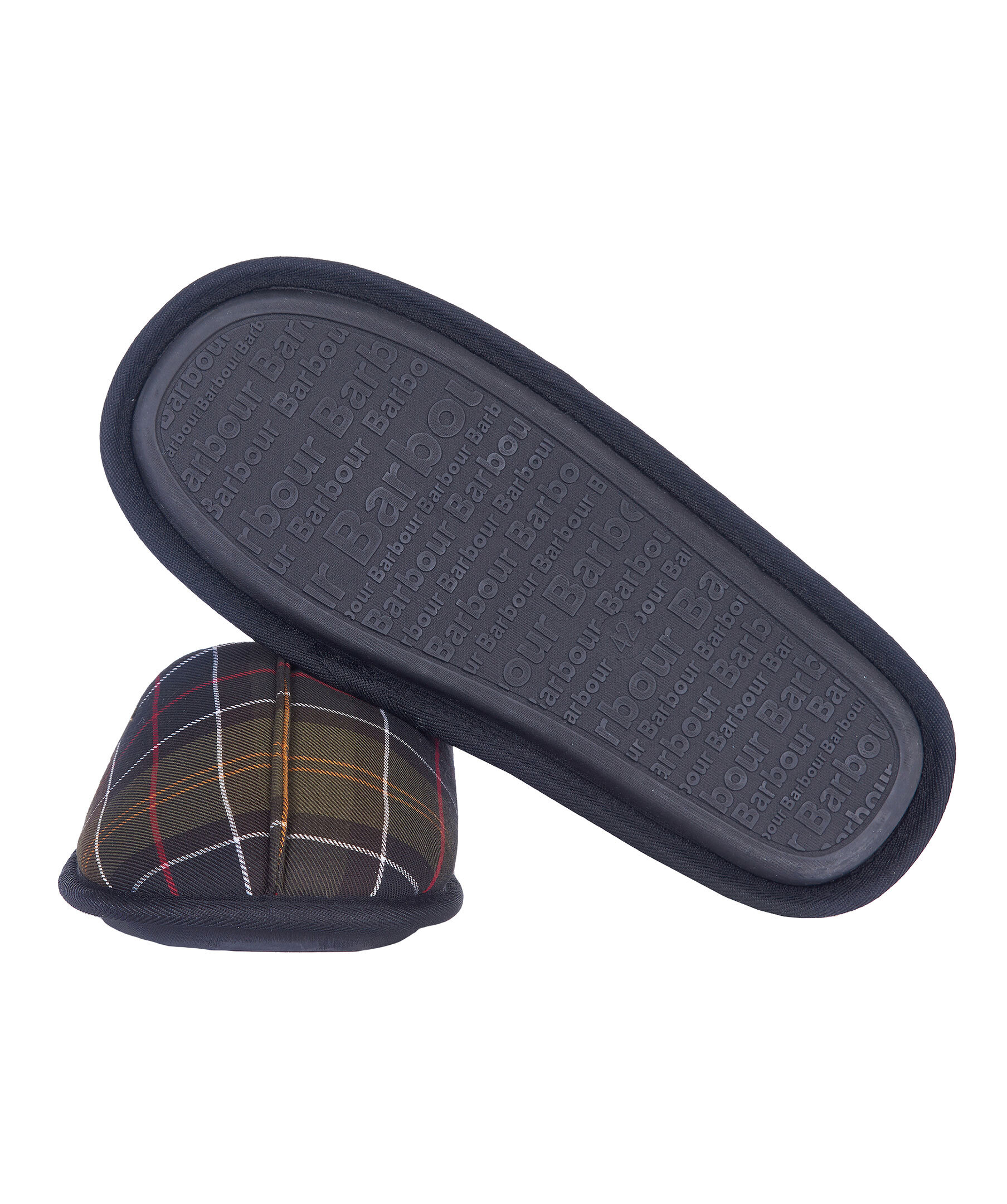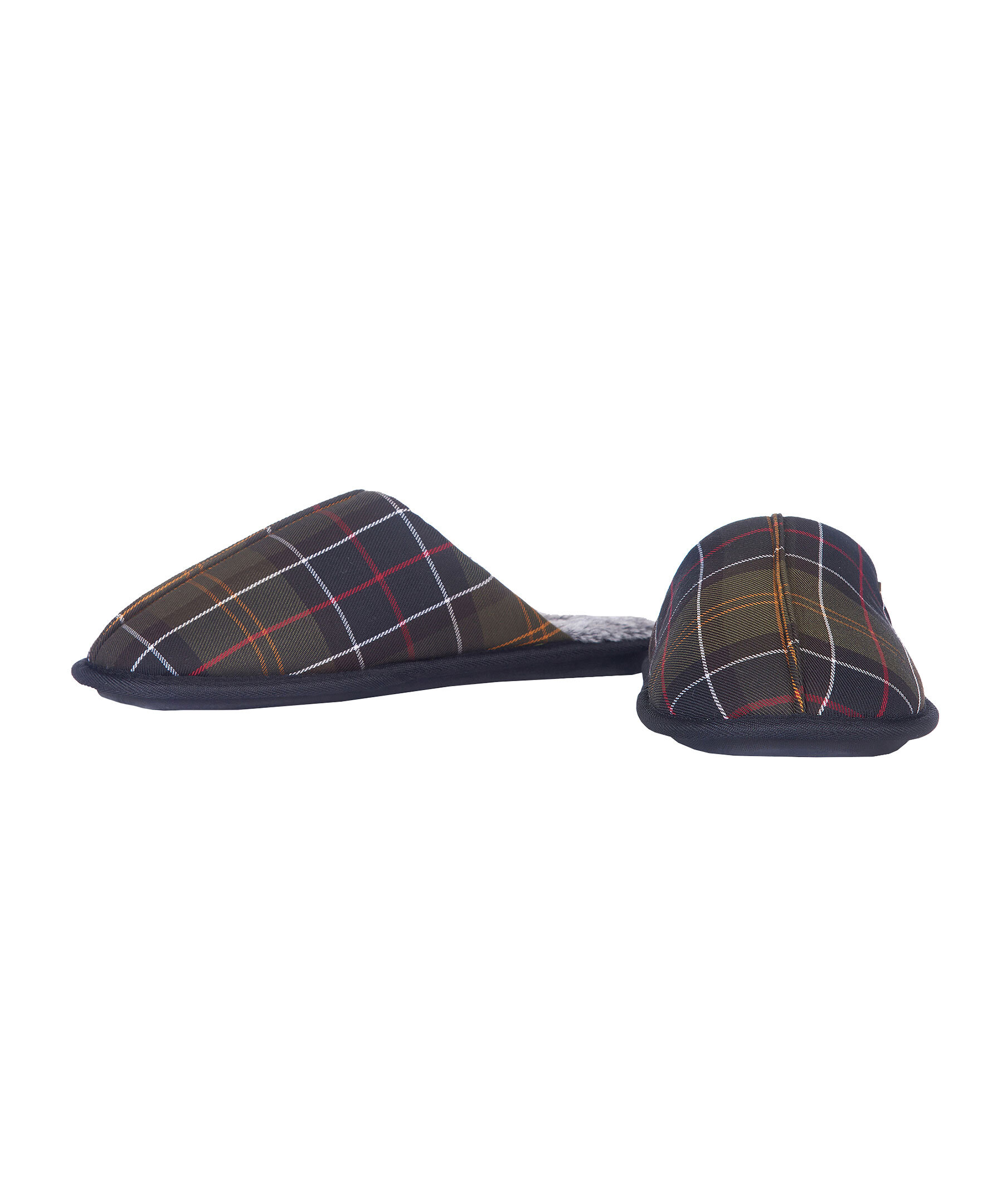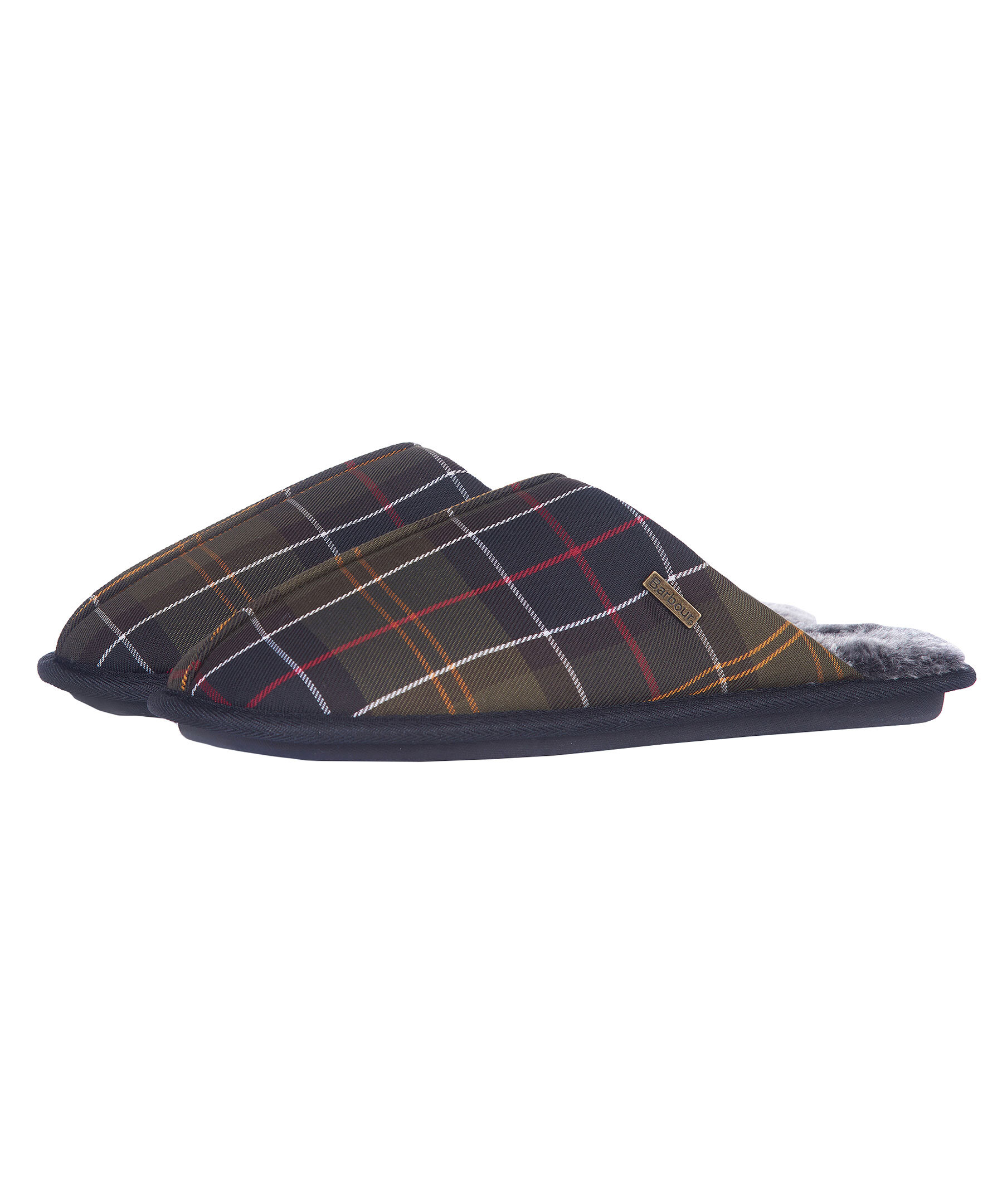 Militärgröna, rutiga innetofflor från Barbour. Yttertyg med Barbours klassiska rutmönster, mysigt faux-shearling foder, lätt sula och ett Barbour-märke i metall på ovansidan.