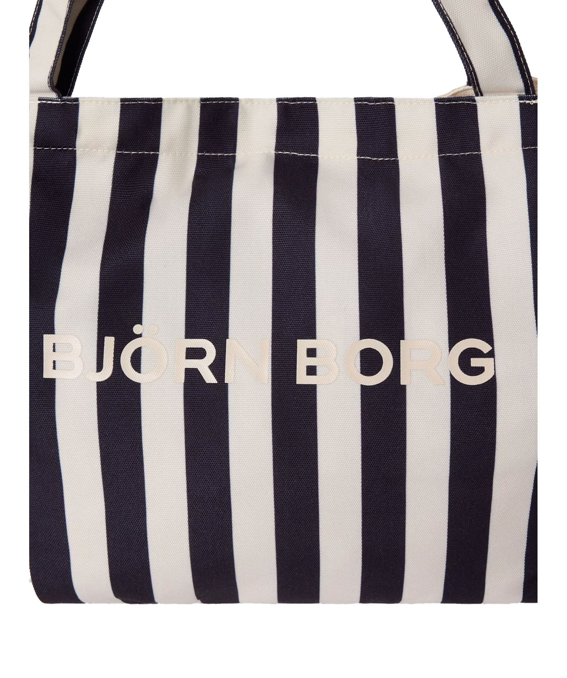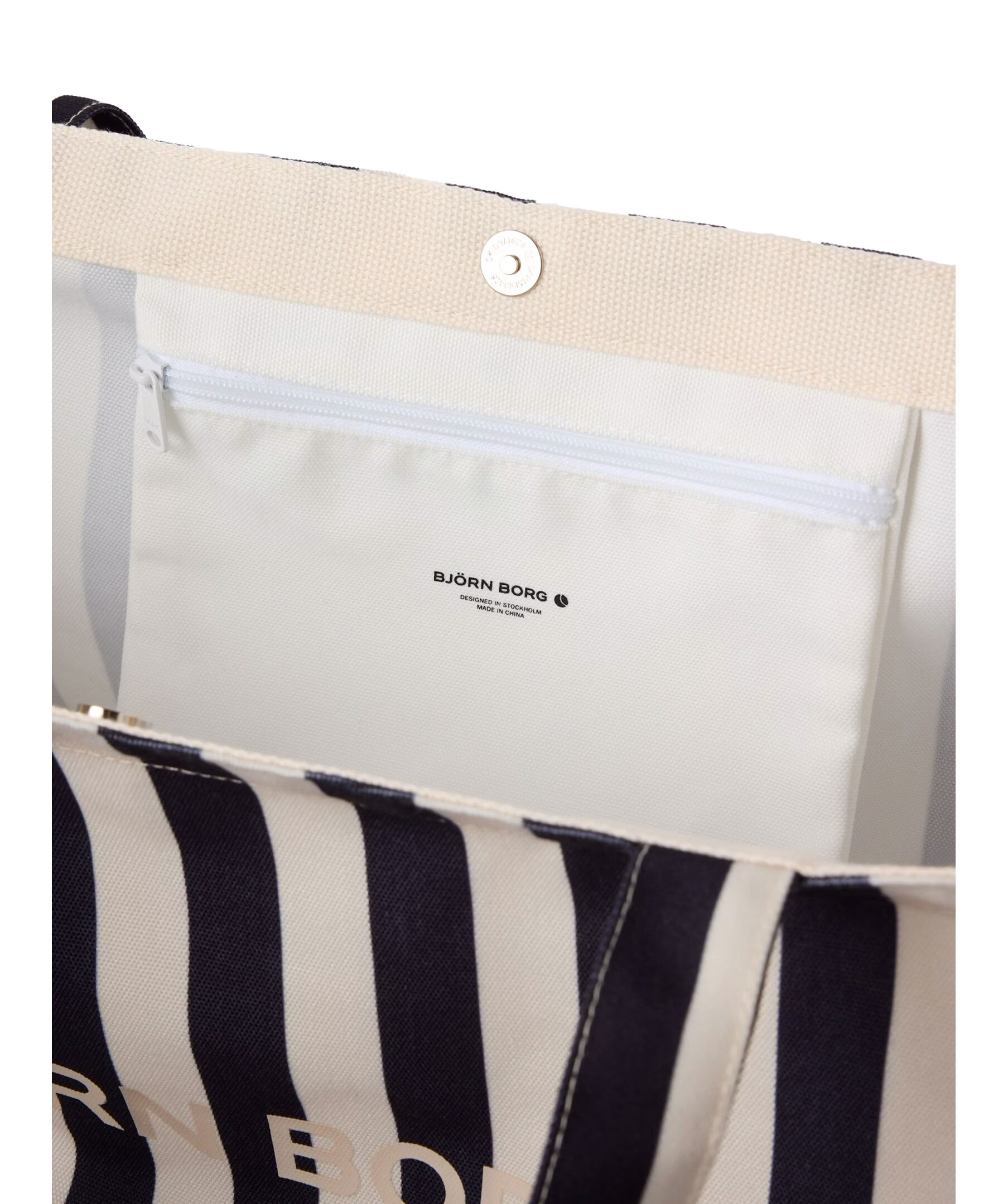 Randig, stor tote bag från Björn Borg. Väskan har en magnetisk knappöppning, två långa handremmar för enkel bärning, en ficka med dragkedja på insidan för dina värdesaker och ett litet logotryck på framsidan. Rymmer 48 liter. Tillverkad i slitstarkt kvalitetstyg av 100% återvunnen polyester.