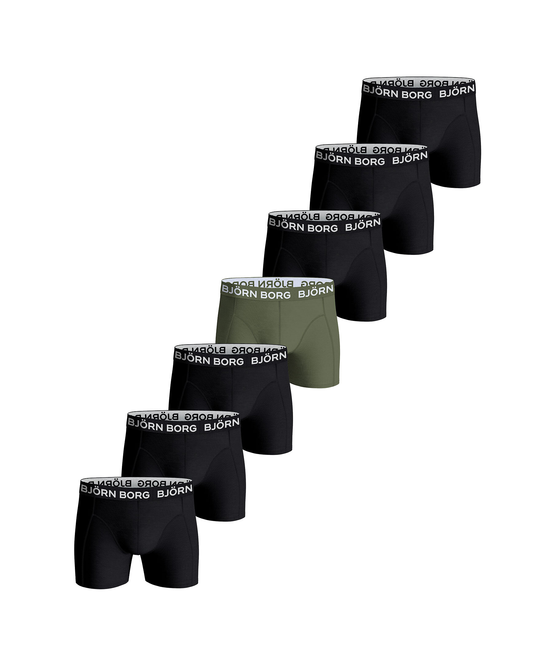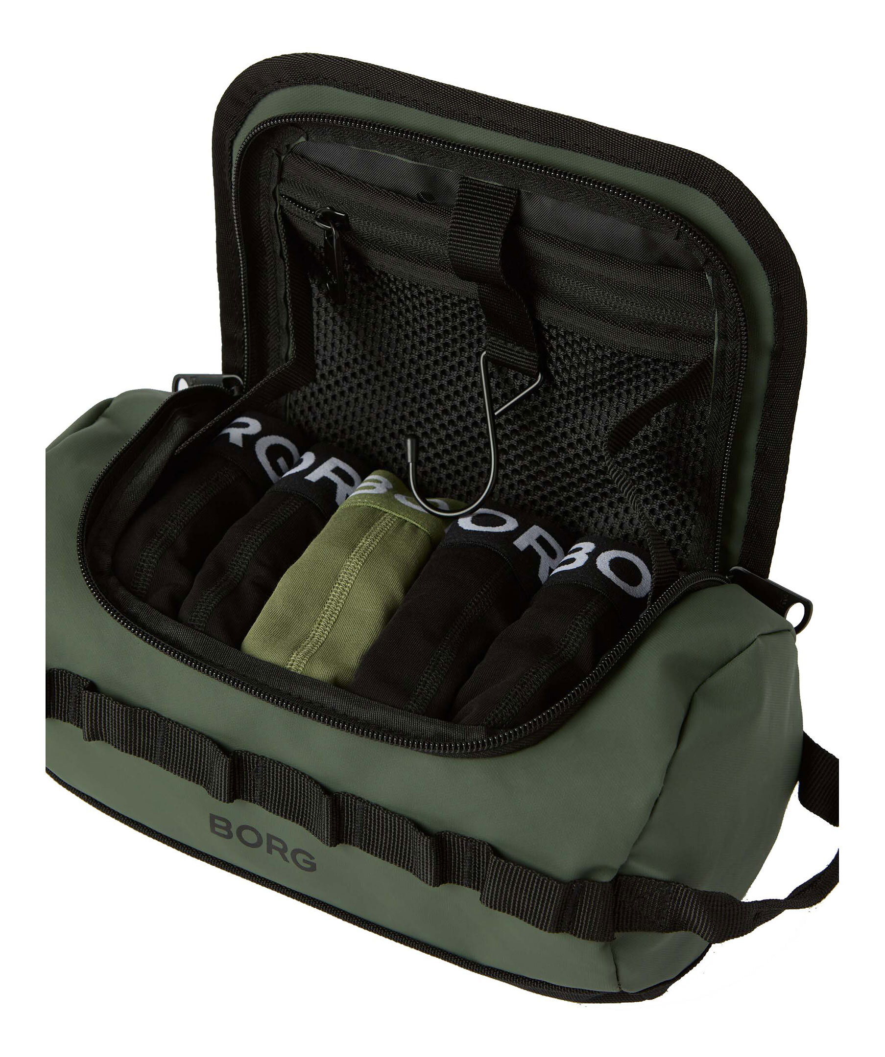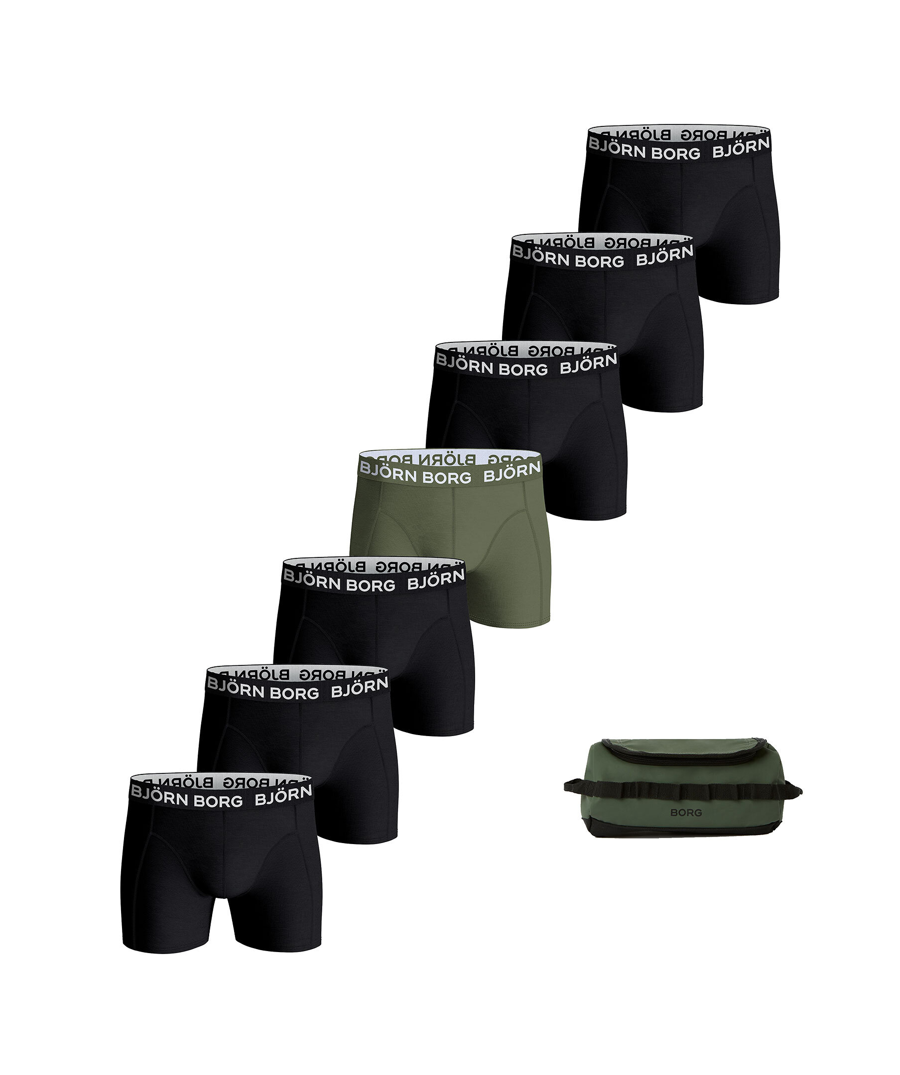 Militärgrön necessär med 7-pack boxerkalsonger i svart samt ett par gröna från Björn Borg. Necessären har en krok på insidan för enkelt upphängning, ett stort invändigt fack samt en meshficka med dragkedja. Logotyp på utsidan. Kalsongerna har logotyp längs linningen och är tillverkade i en stretchig bomullsblandning.