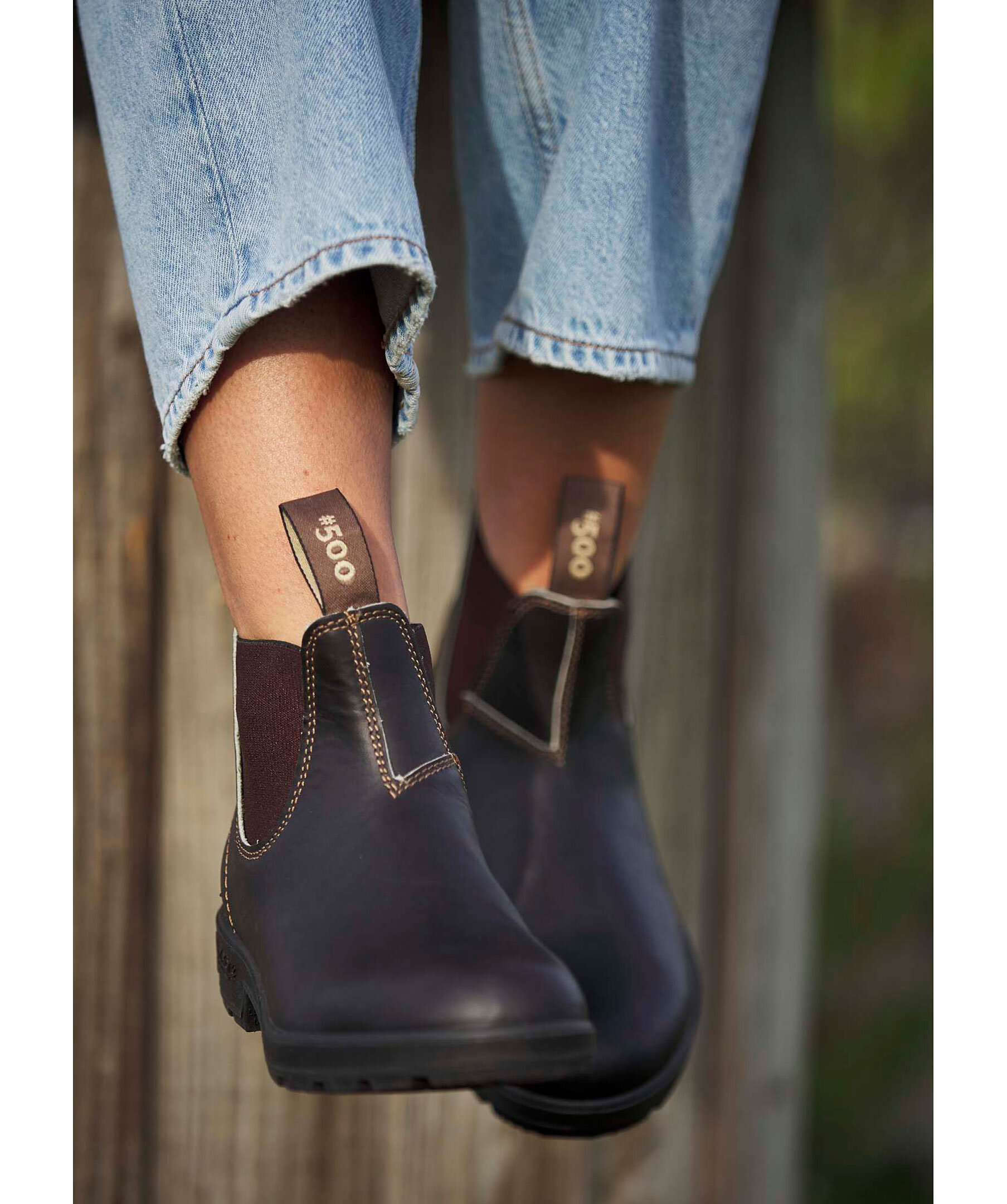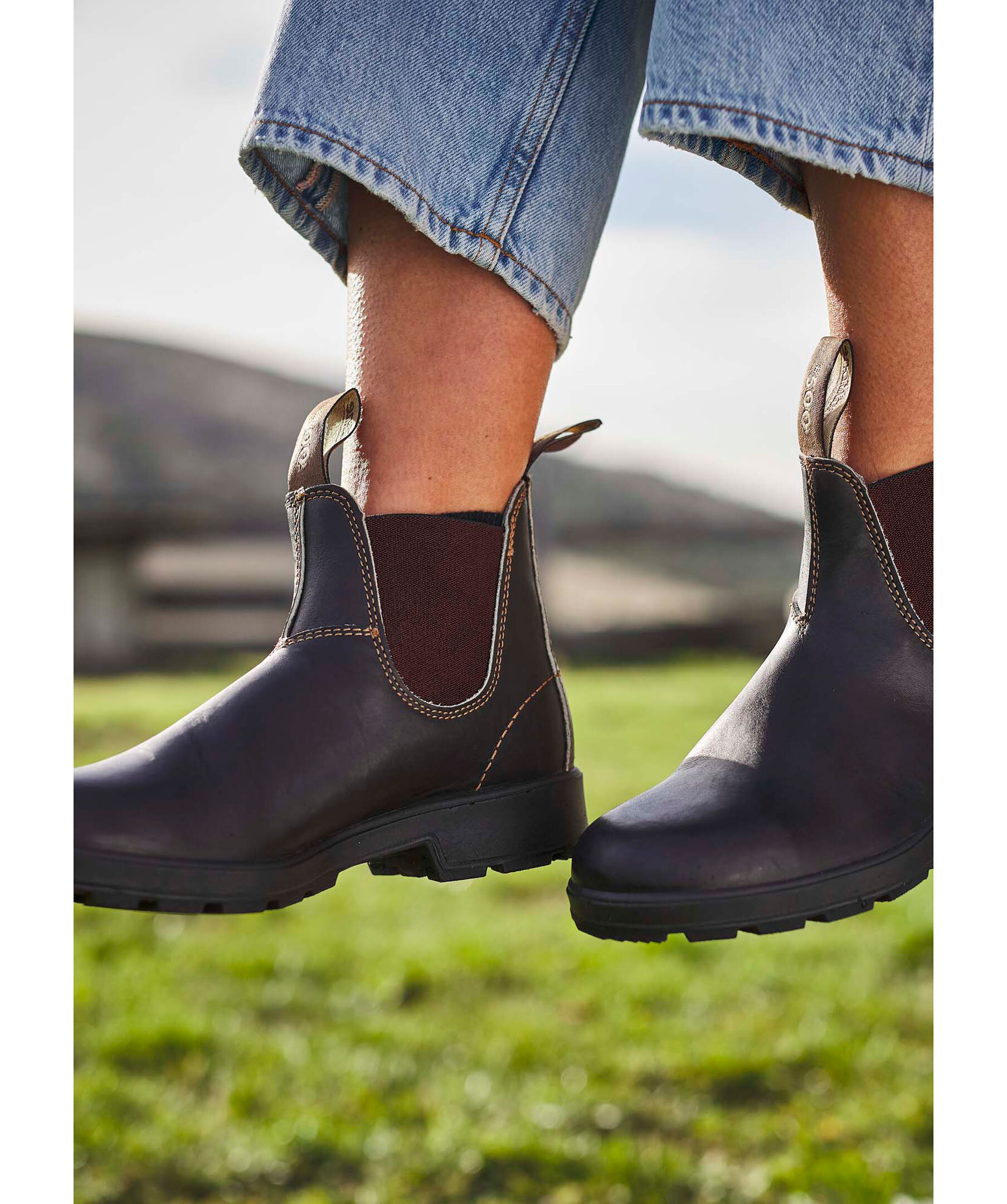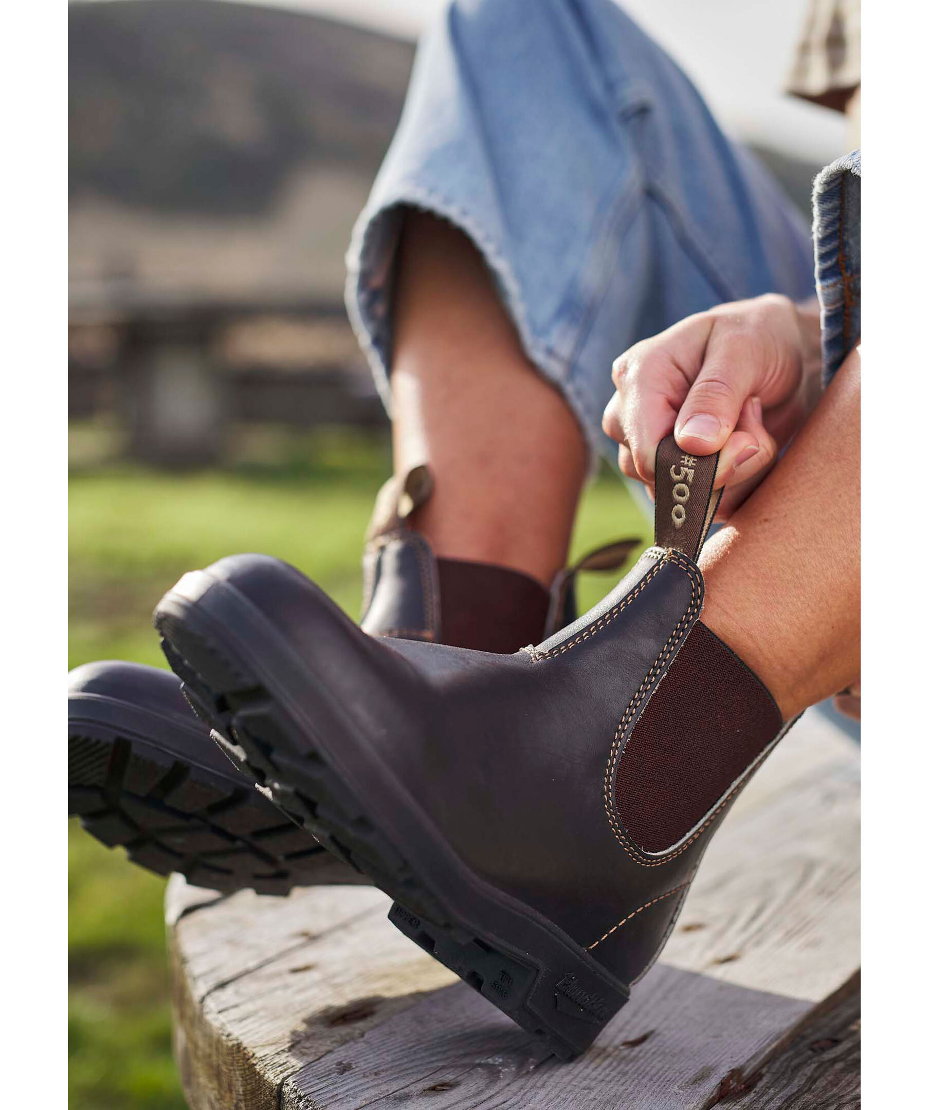 Bruna chelsea boots från Blundstone. Flik fram och baktill för enkel av- och påtagning. Logotyp på utsidan samt på flikarna. Tillverkade i premiumläder.