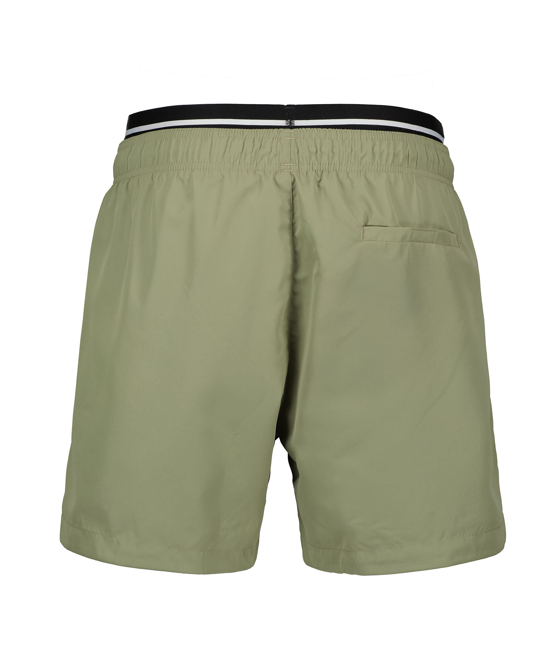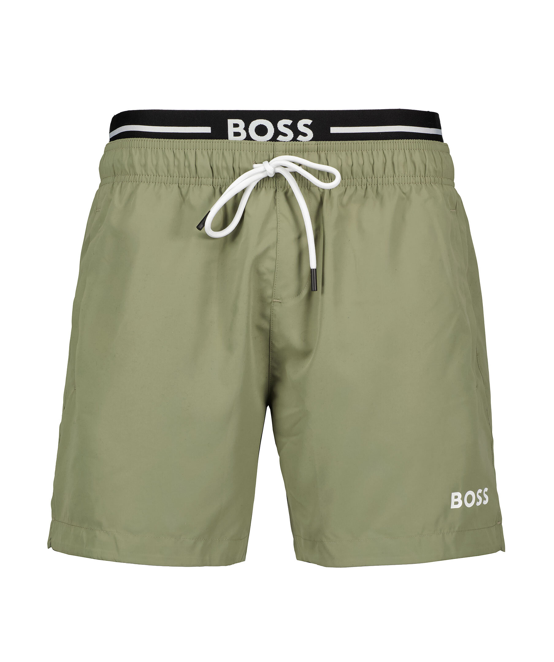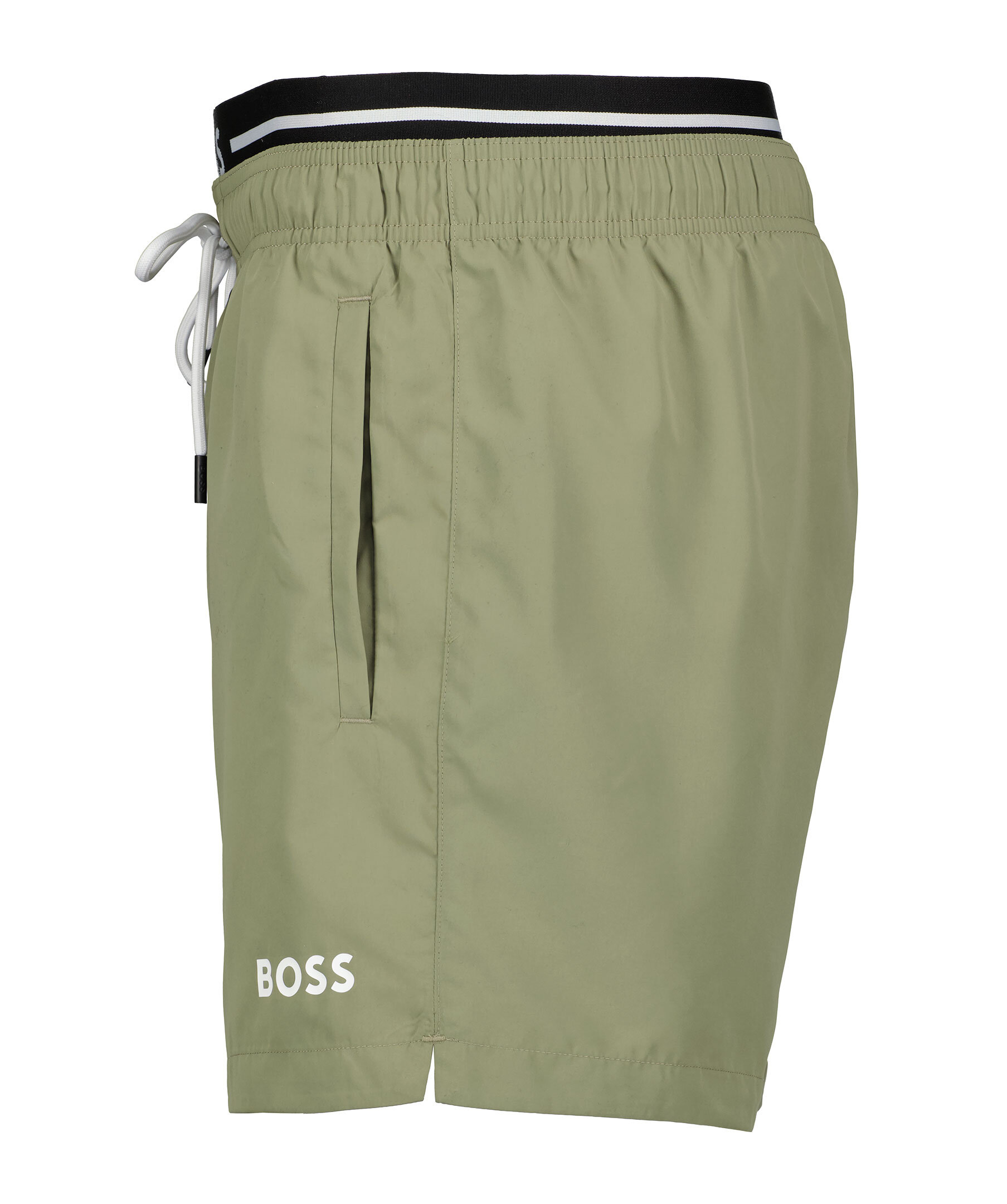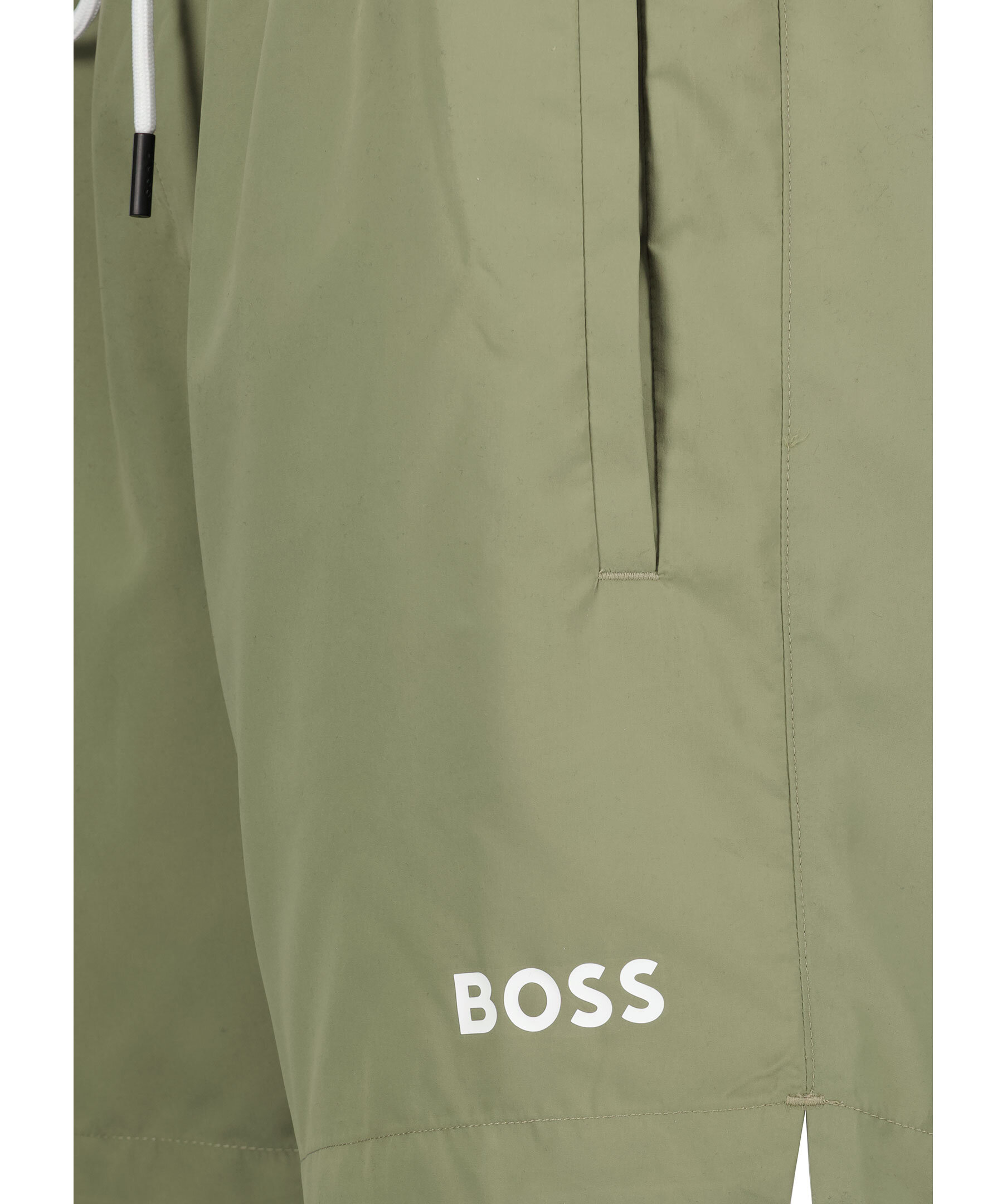 Gröna badshorts från BOSS Black. Logotyp i midjan samt på vänster ben. Två sidfickor samt en bakficka som stängs med resår. Elastisk midja med snörning. Normal passform.