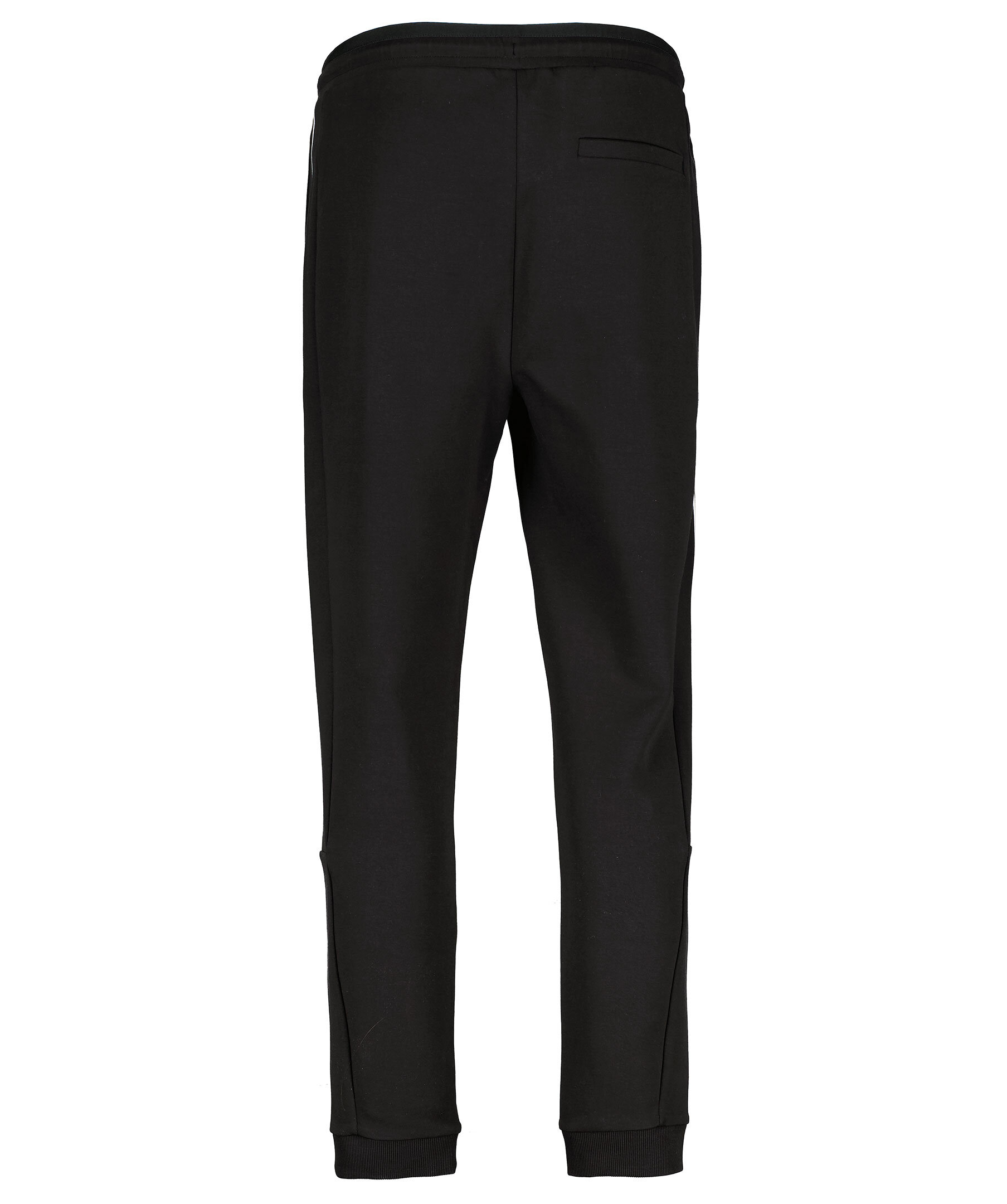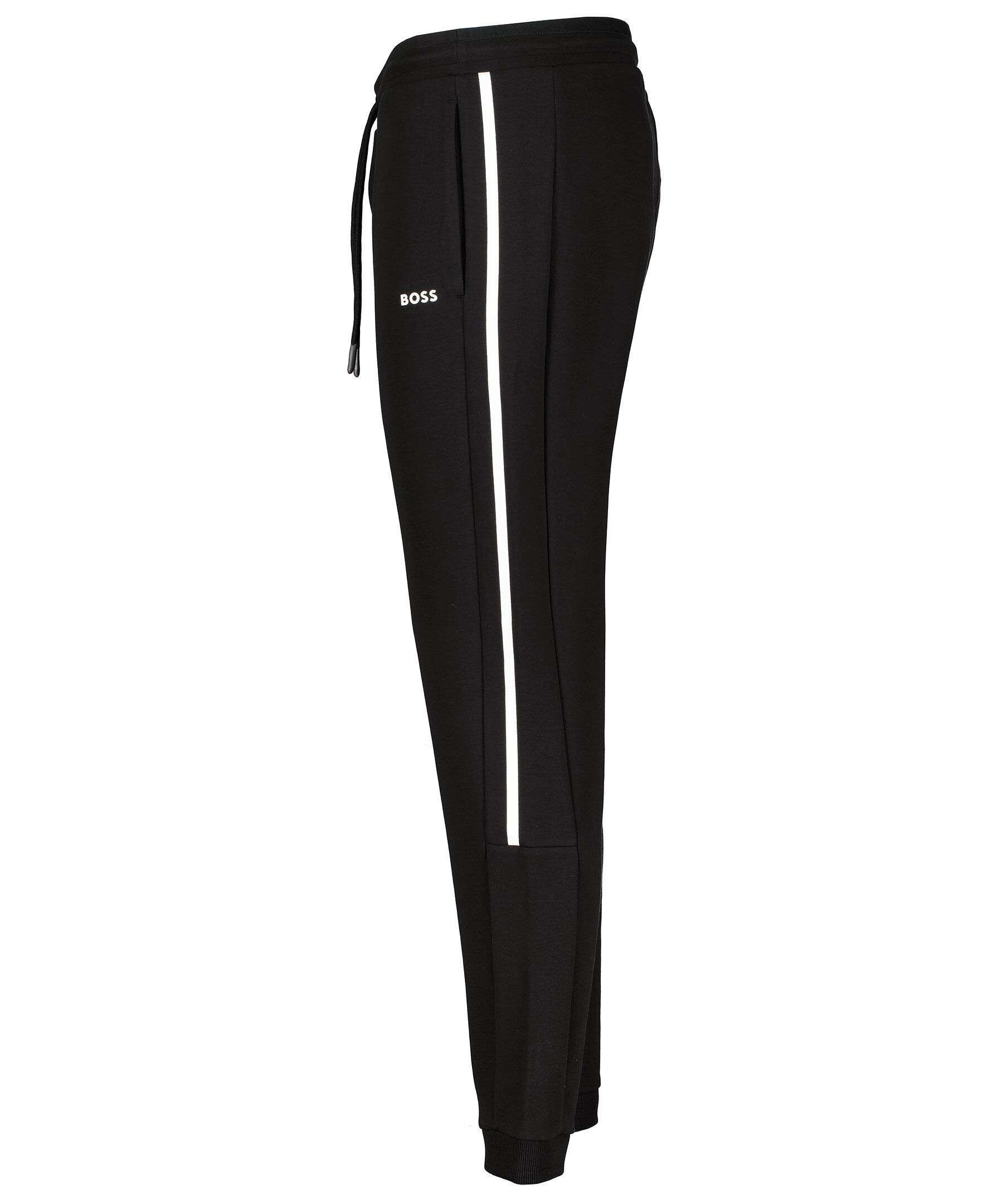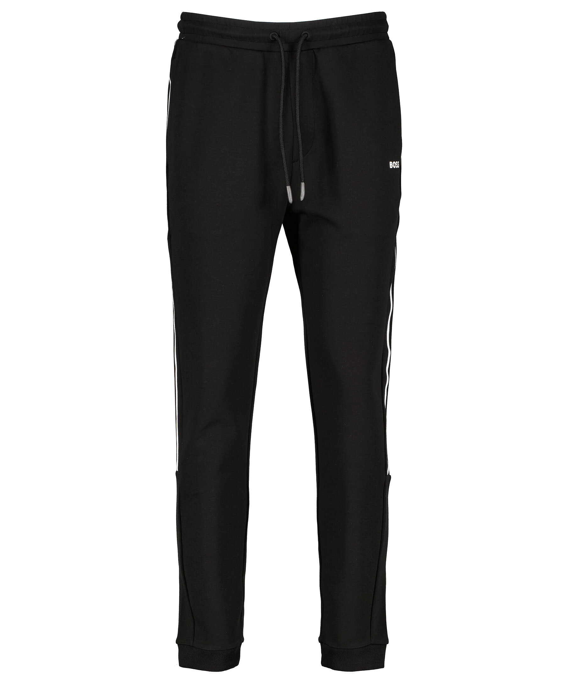 Svarta mjukisbyxor från BOSS GREEN. Byxorna är gjorda i en mjuk och stretchig bomullsblandning. Två sidfickor och en bakficka, ribbad elastisk mudd vid benslut. Vit logotyp på ena benet samt vita revär på benens sida. Snörning i midjan.
