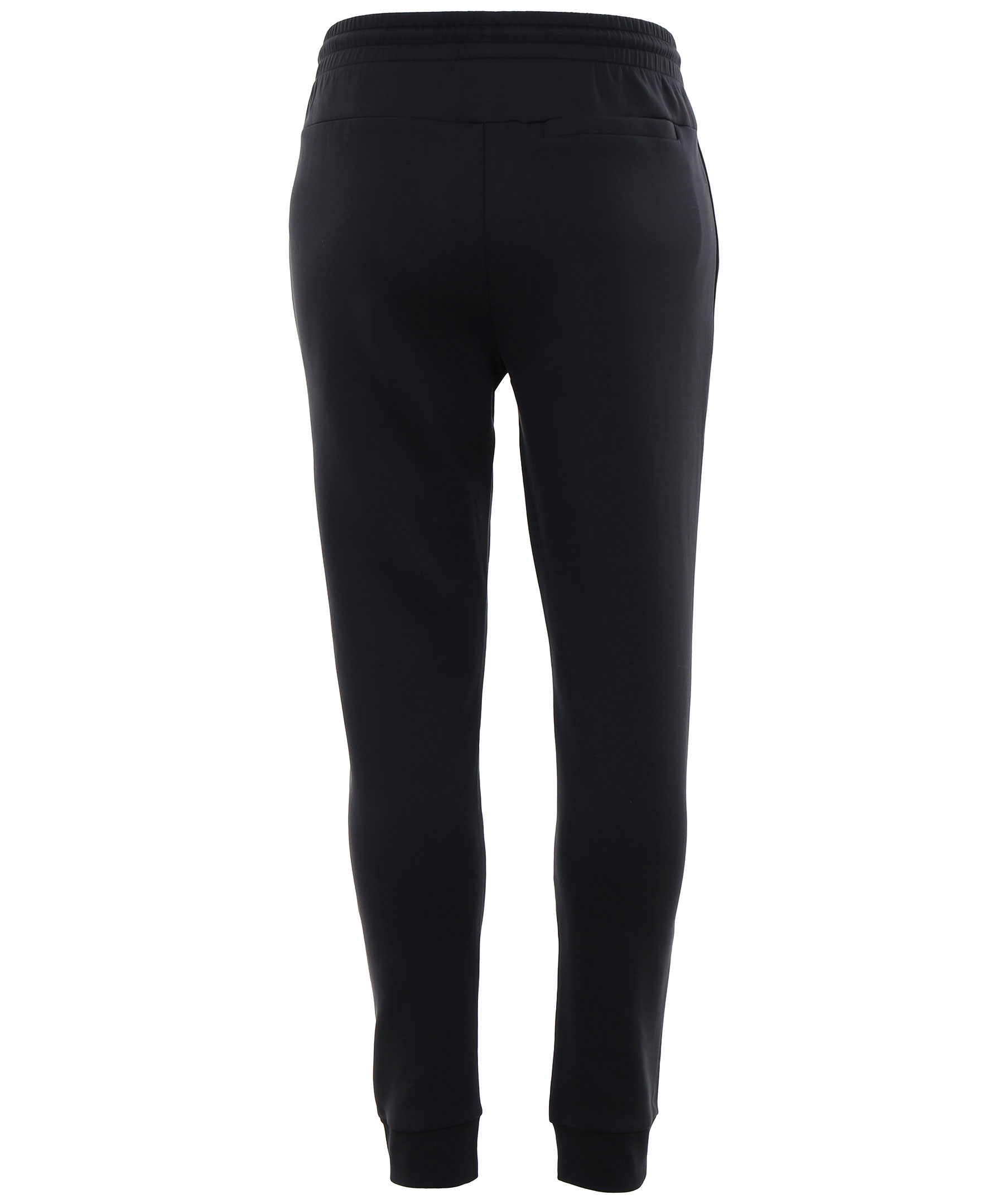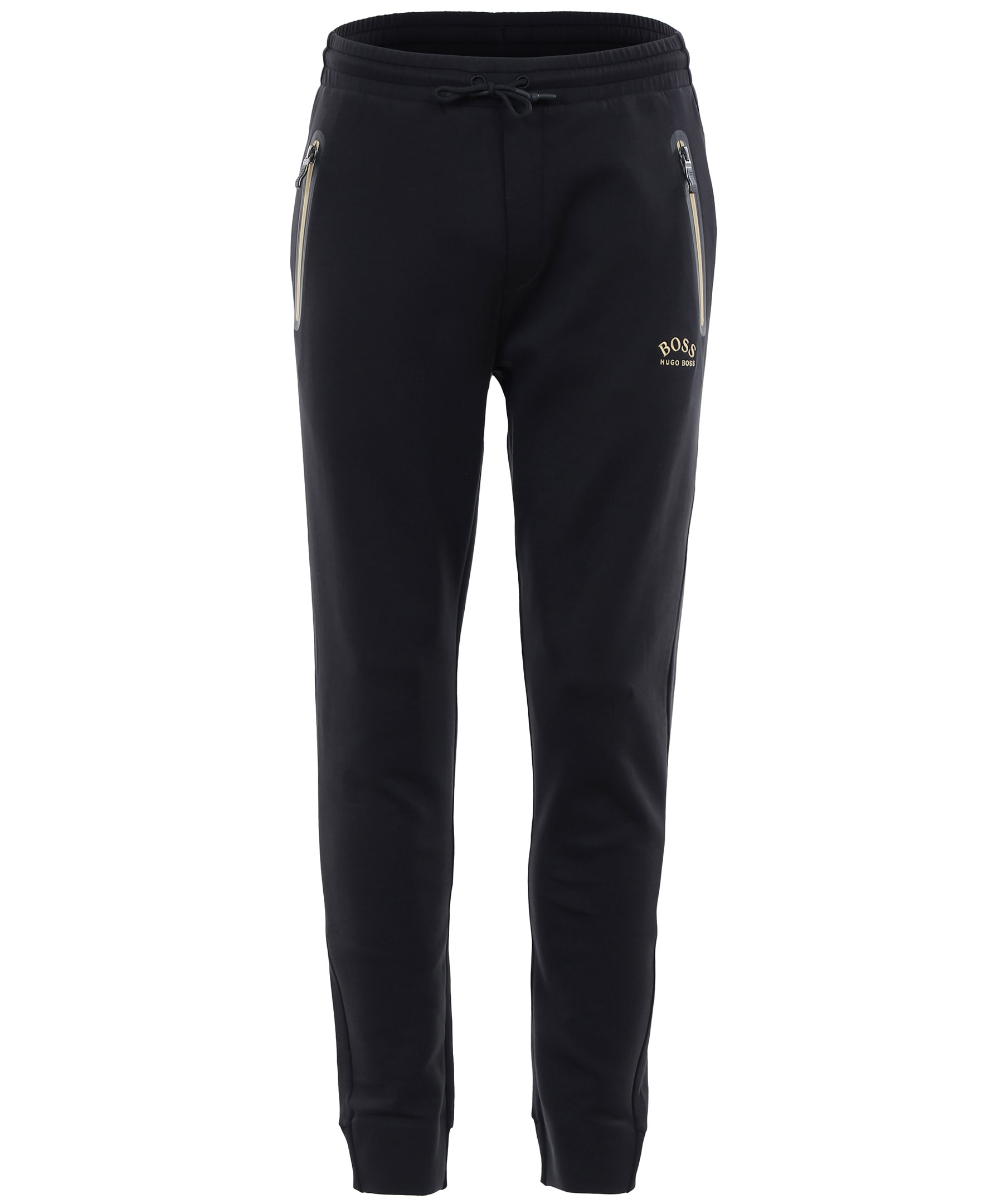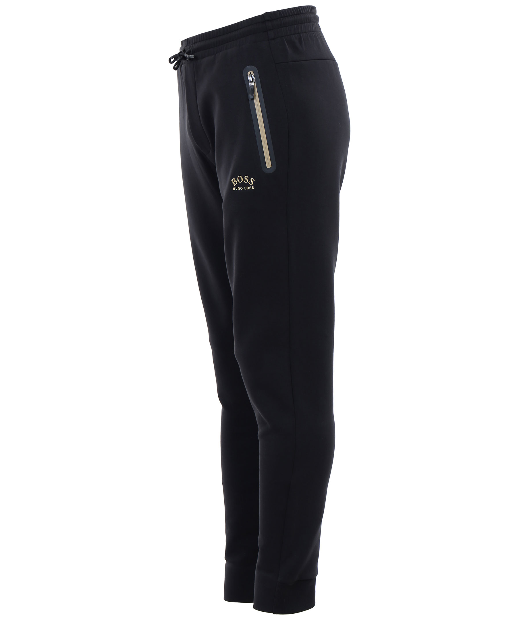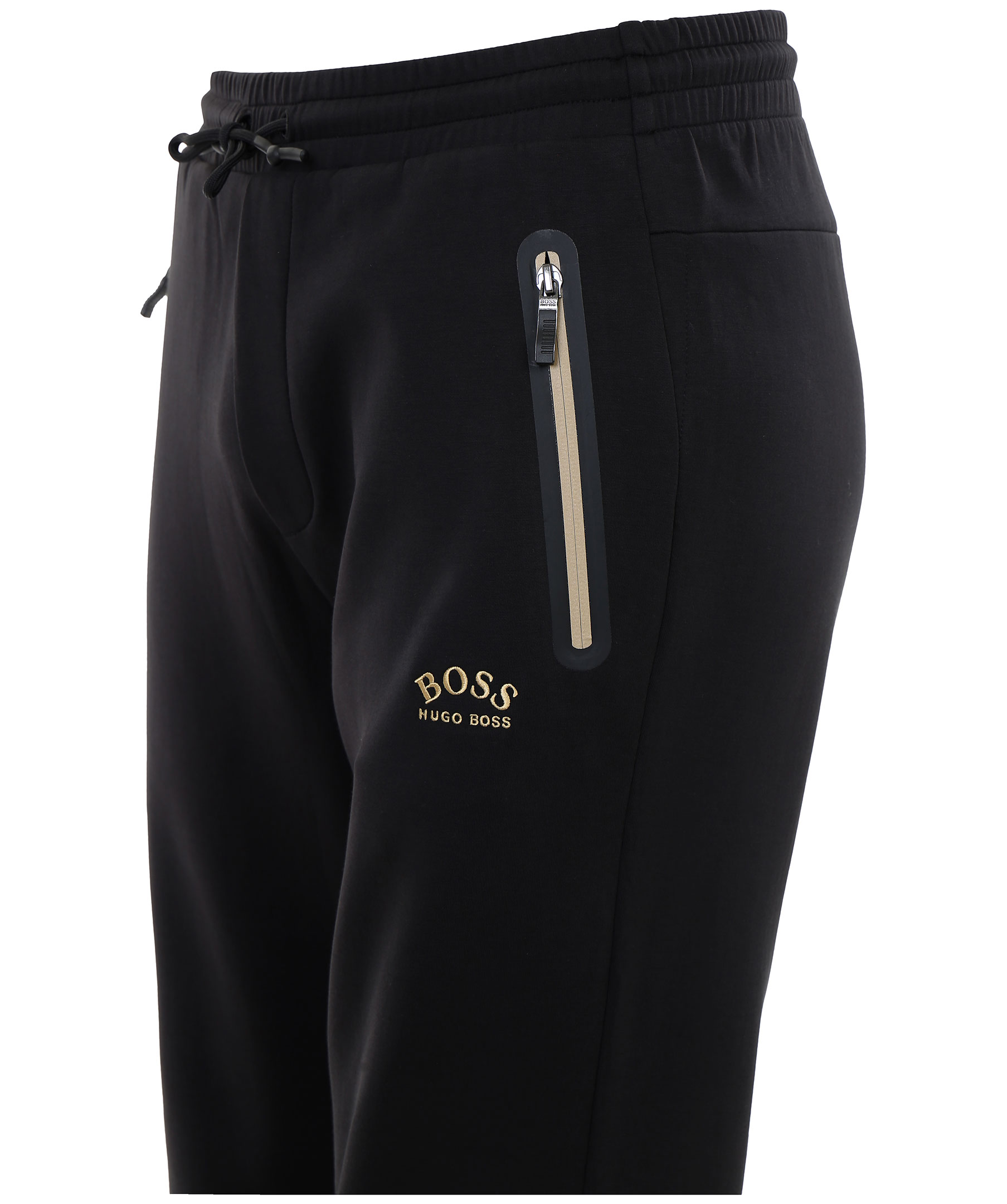 Svarta byxor i bomullsblandning från Boss Athleisure. Två framfickor med dragkedja samt en bakficka. Mudd med dragsko i midjan och muddar i benslut. Liten guldfärgad broderad logotyp på vänster sida.