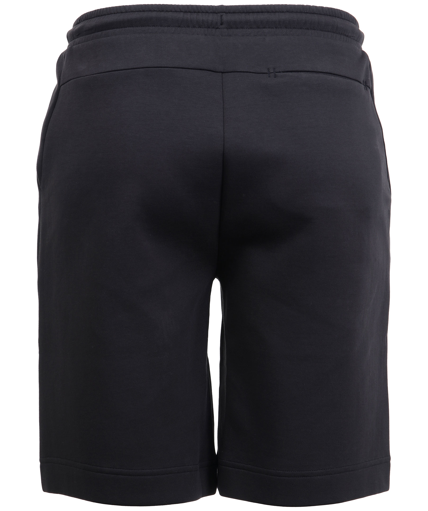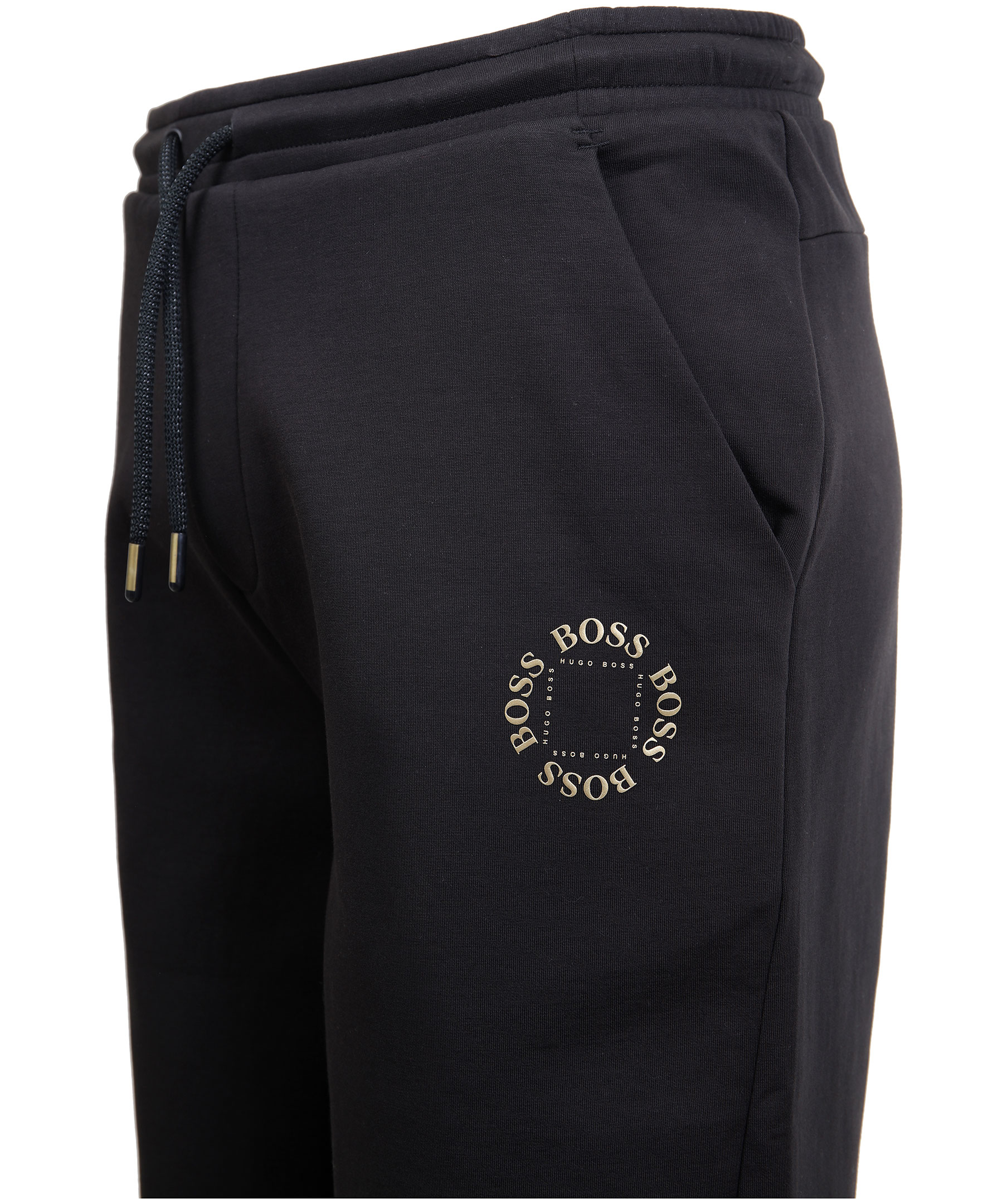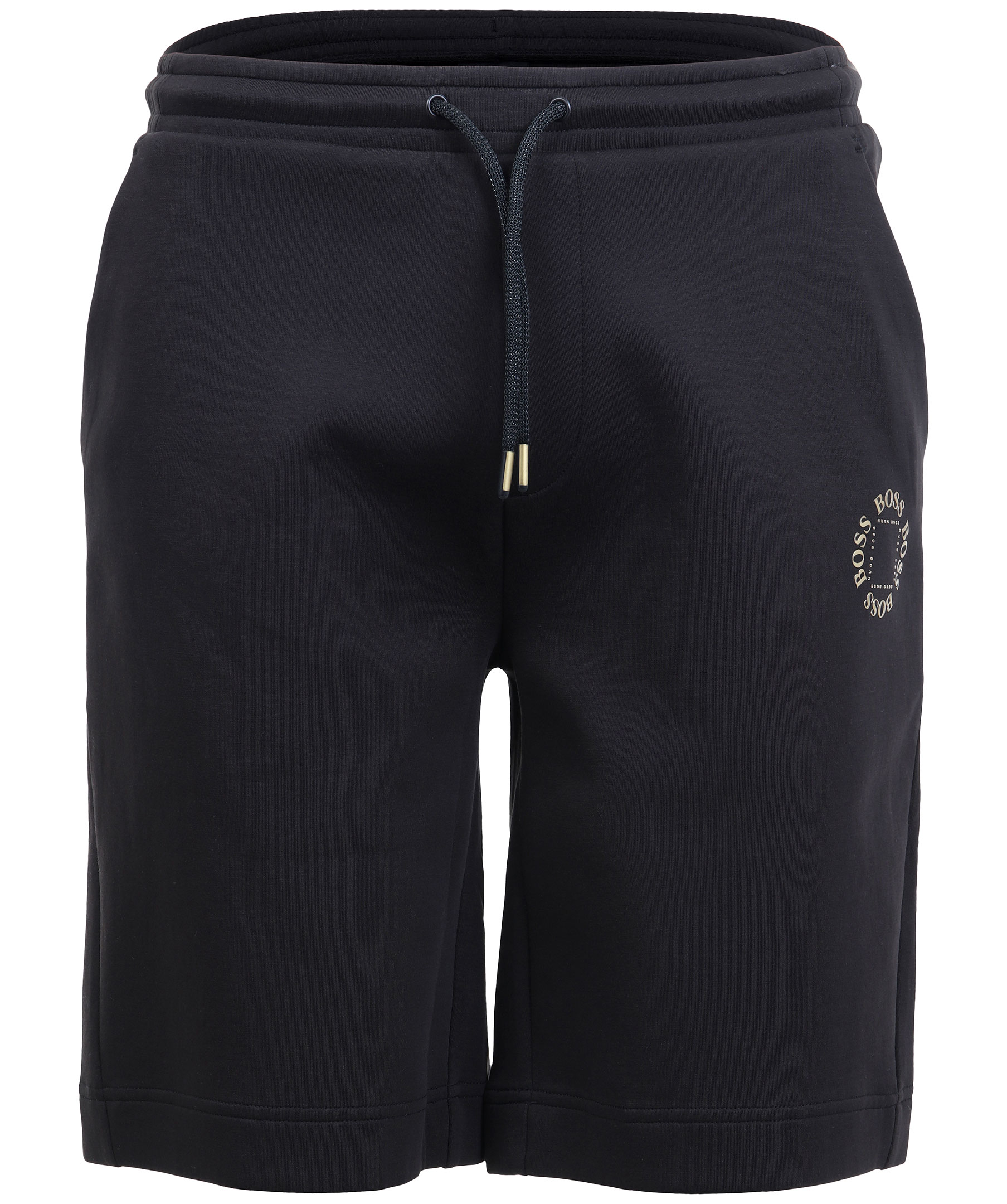 Svarta mjukisshorts från boss Athleisure. Två fickor fram, en bakficka, dragsko i midjan och guldfärgad, tryckt logotyp på ena benet. Tillverkade i bomull och polyester.