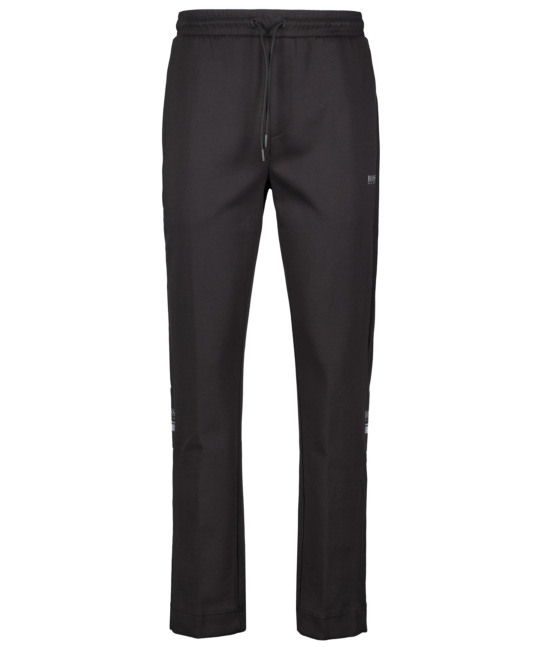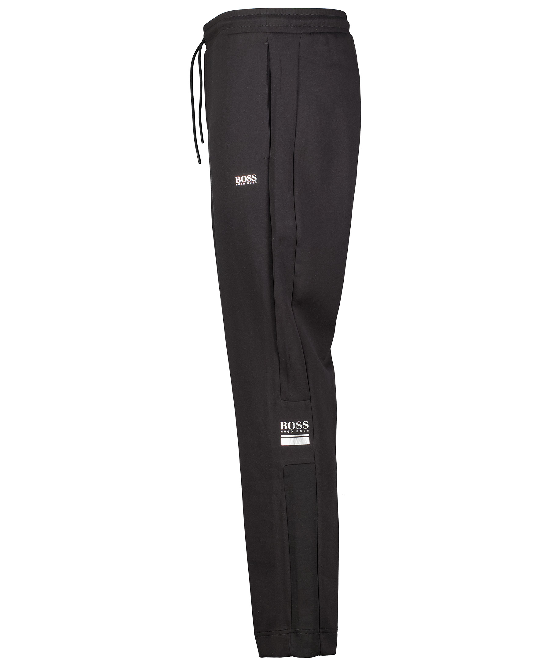 Svart mjukisbyxor från Hugo Boss. Tillverkade i bomulls och polyesterblandning. Snörning i midjan, mudd i midja och benslut. Tryckt, silverfärgad logotyp på vänster ben och på vänster vad samt två sneda fickor fram.