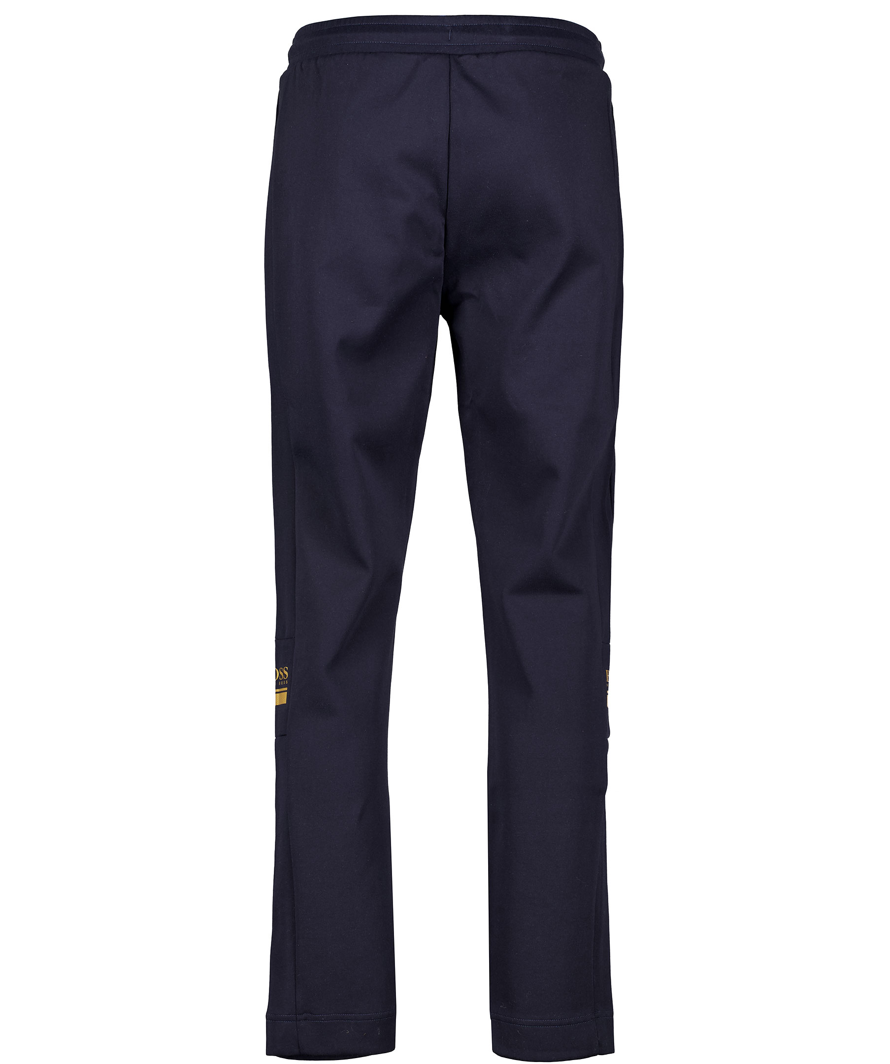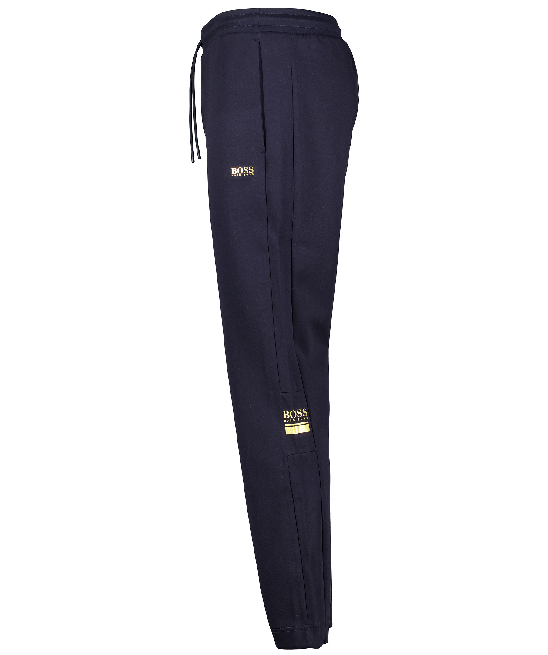 Marinblåa mjukisbyxor från Hugo Boss. Tillverkade i bomulls och polyesterblandning. Snörning i midjan, mudd i midja och benslut. Tryckt, guldfärgad logotyp på vänster ben och på vänster vad samt två sneda fickor fram.