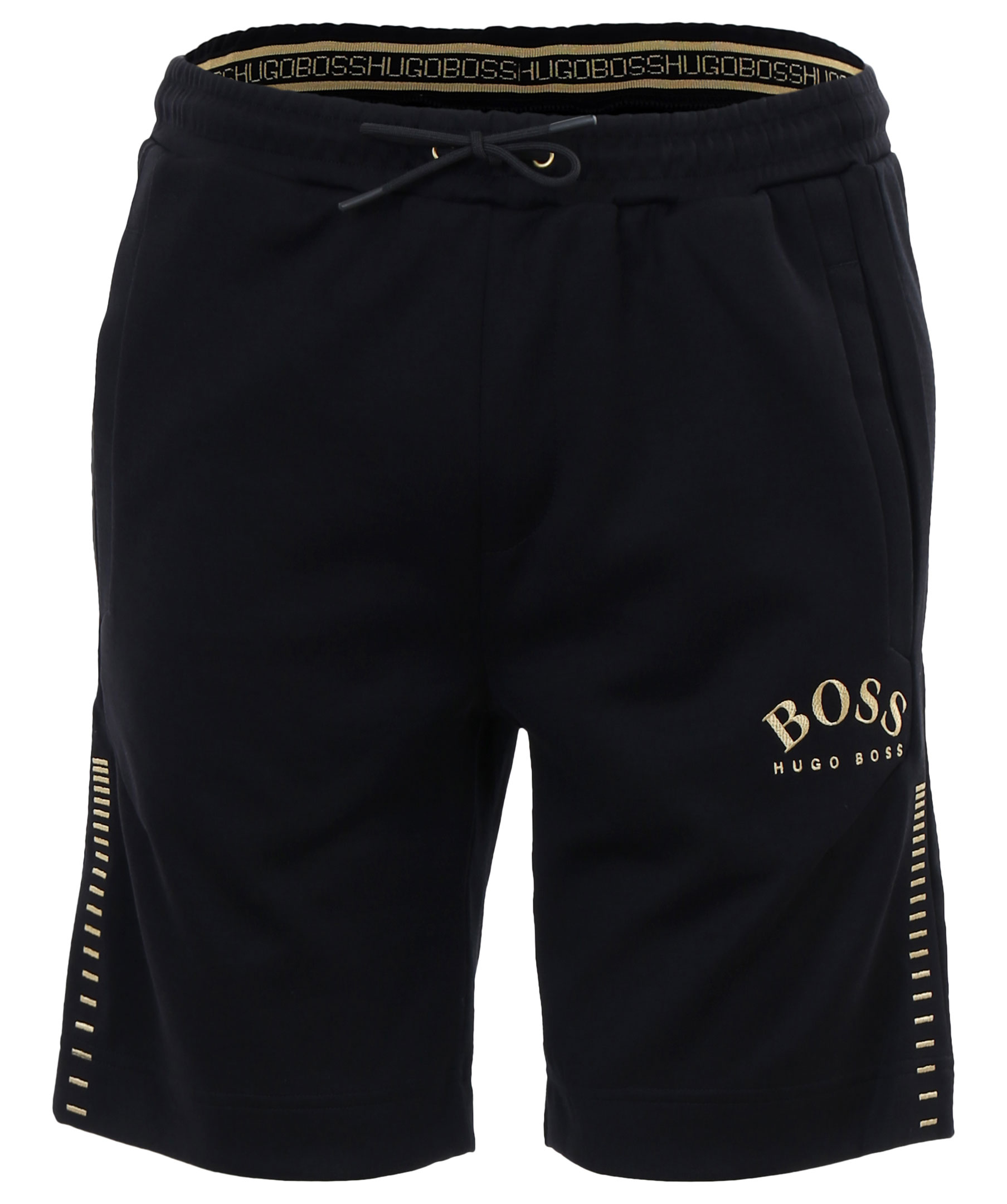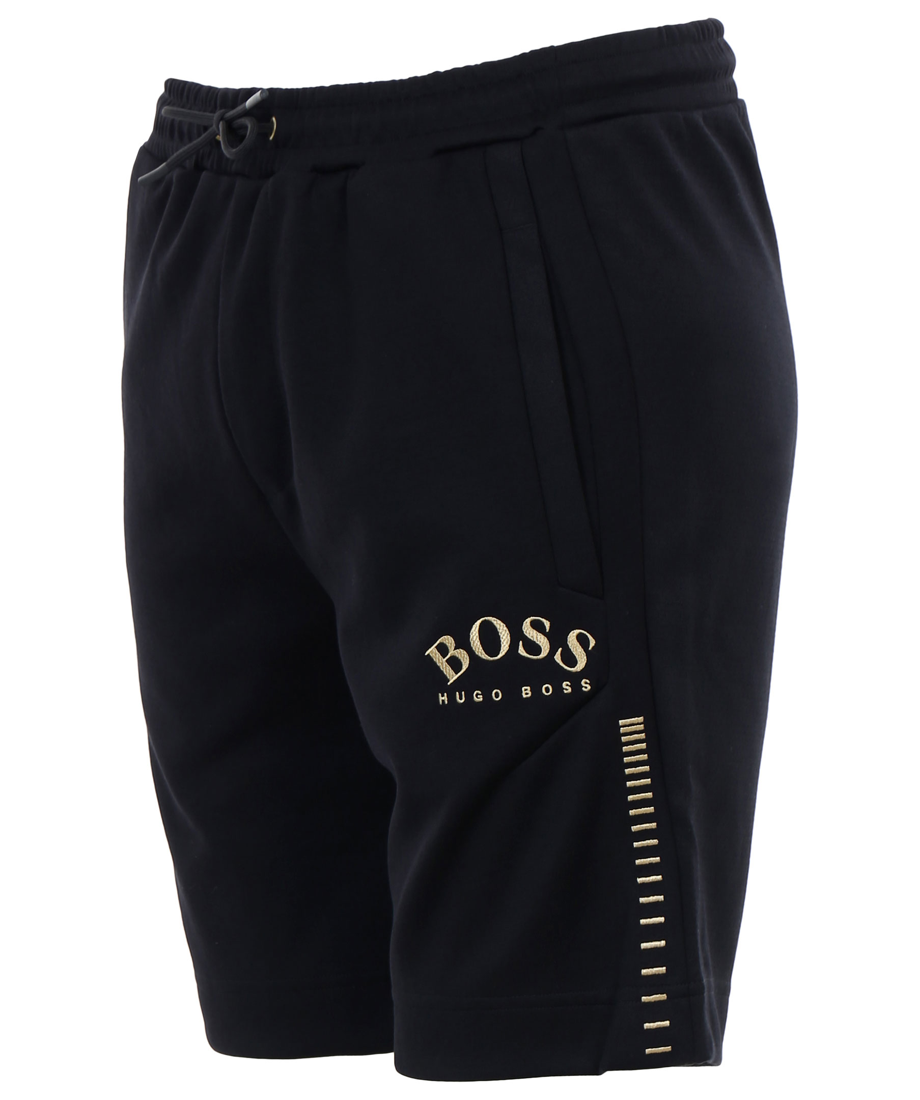 Svarta shorts i bomullsblandning från Boss Athleisure. Två framfickor samt en bakficka. Mudd med dragsko i midjan. Guldfärgad broderad logotyp på vänster sida och broderat mönster längs byxbenen.