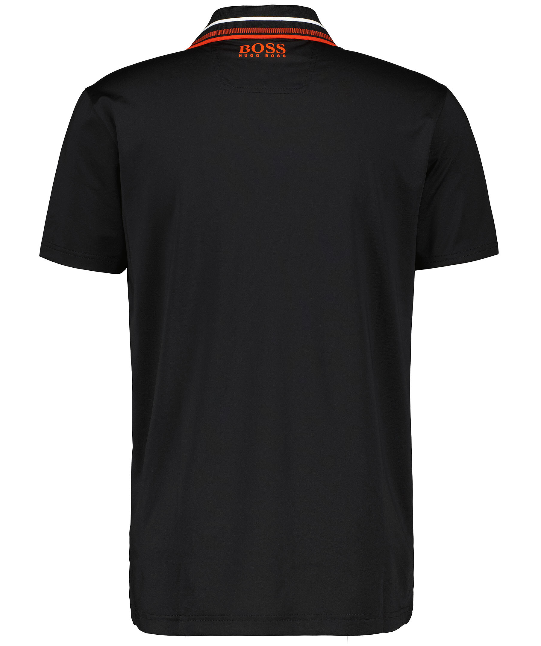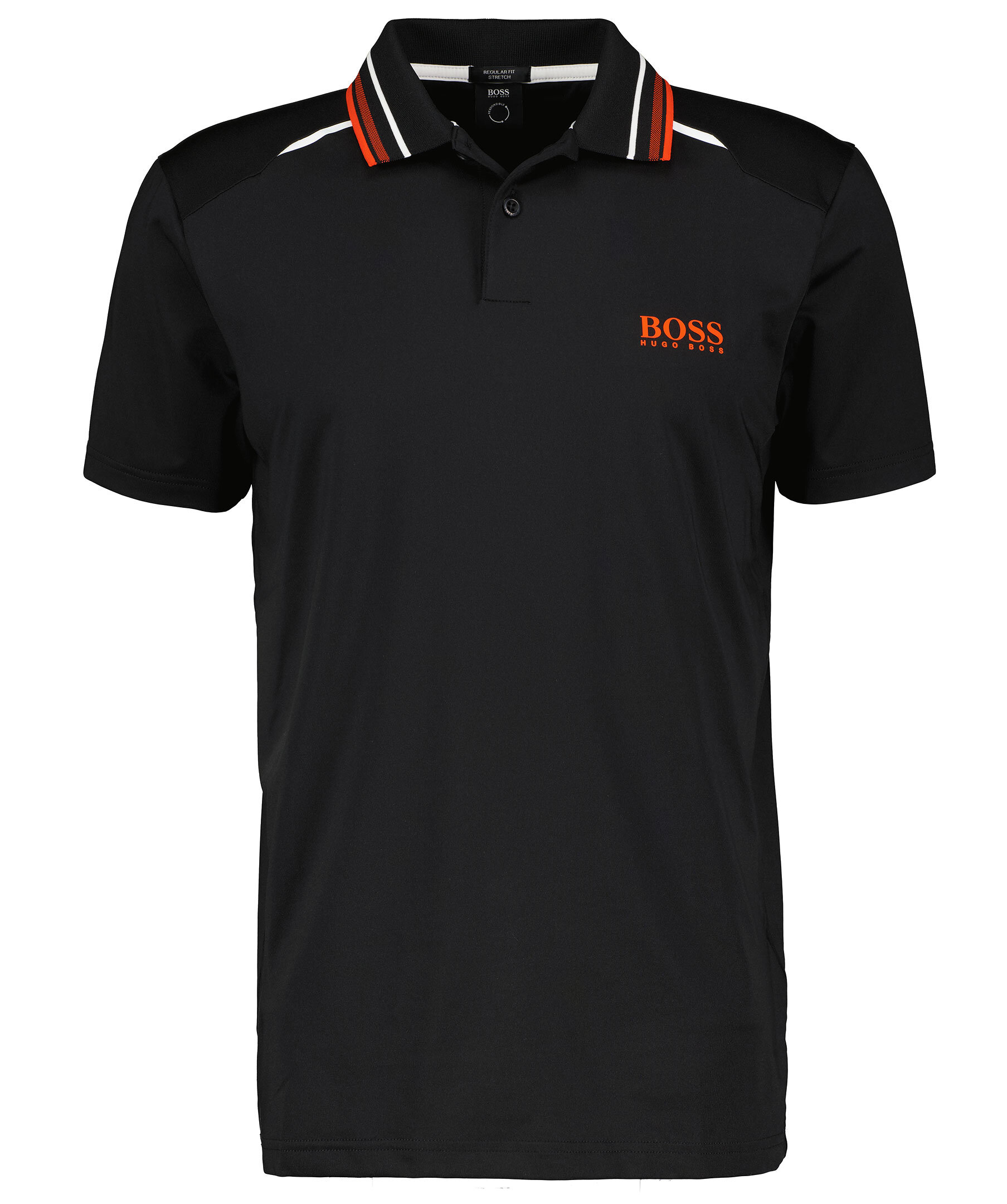 Svart golfpiké från Boss Athleisure i stretchmaterial. Två knappar fram, ränder i vitt och rött på kragen samt logotyp på bröstet. Tillverkad i stretchig polyester.