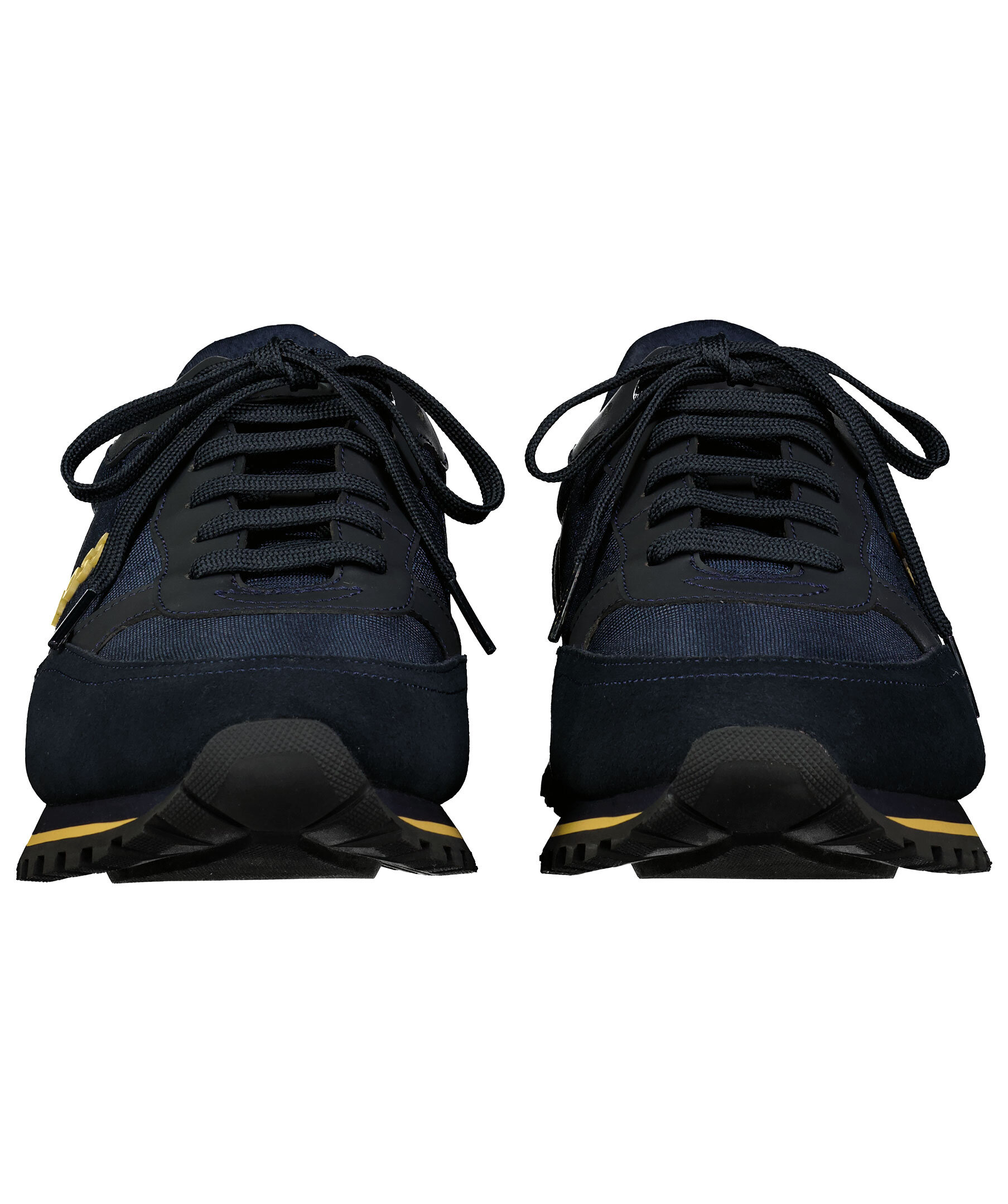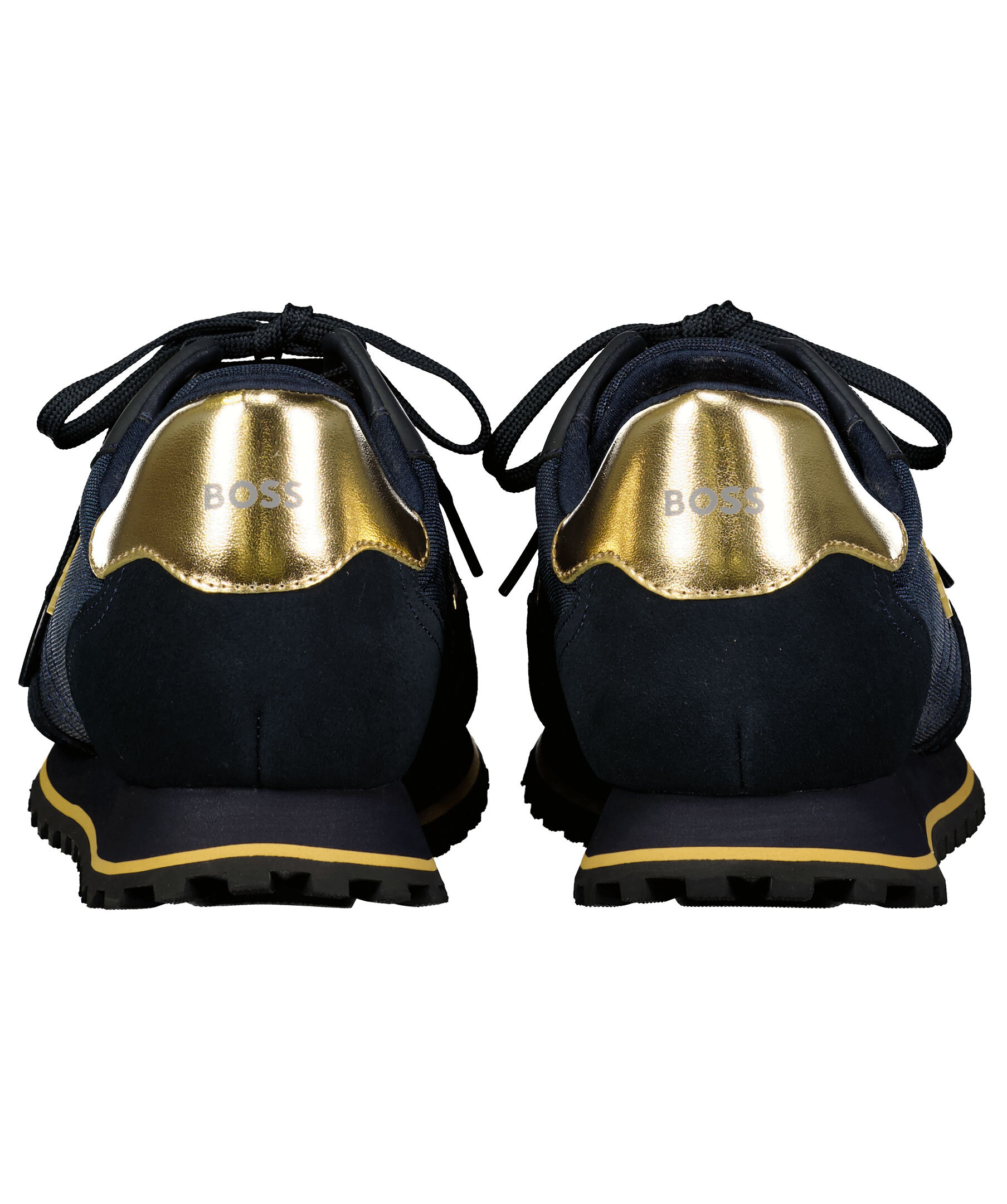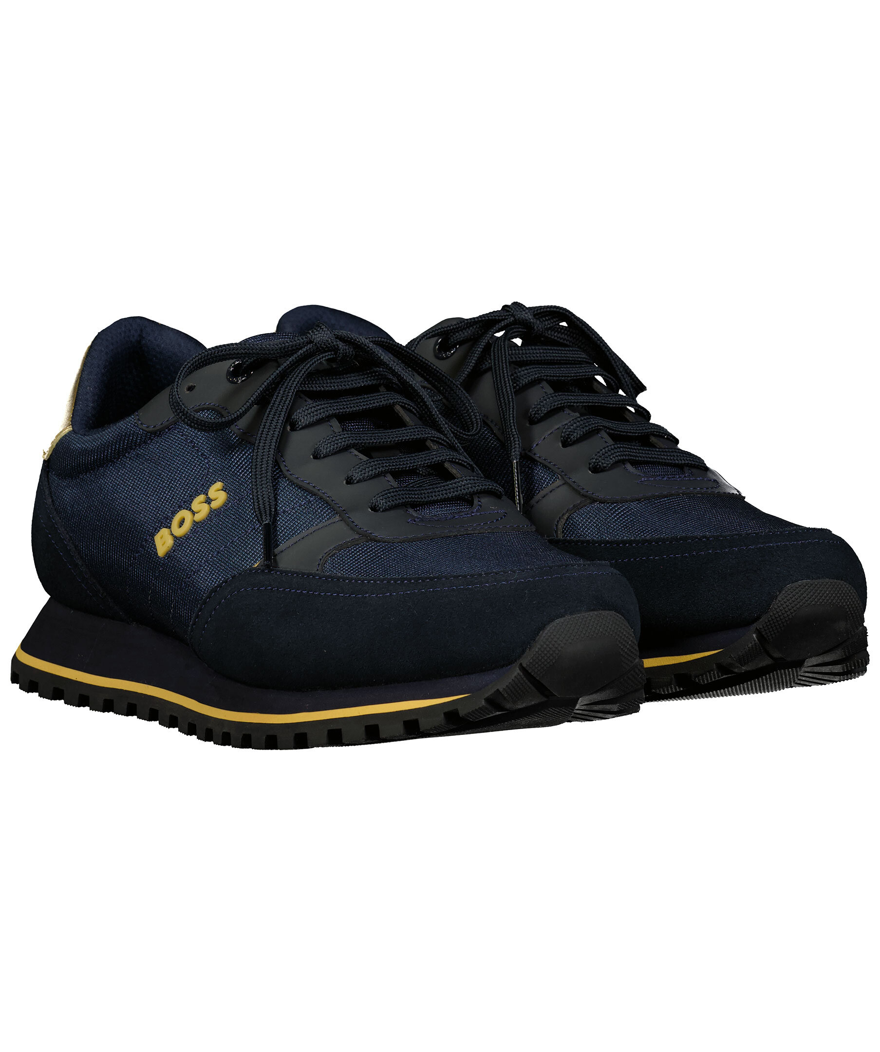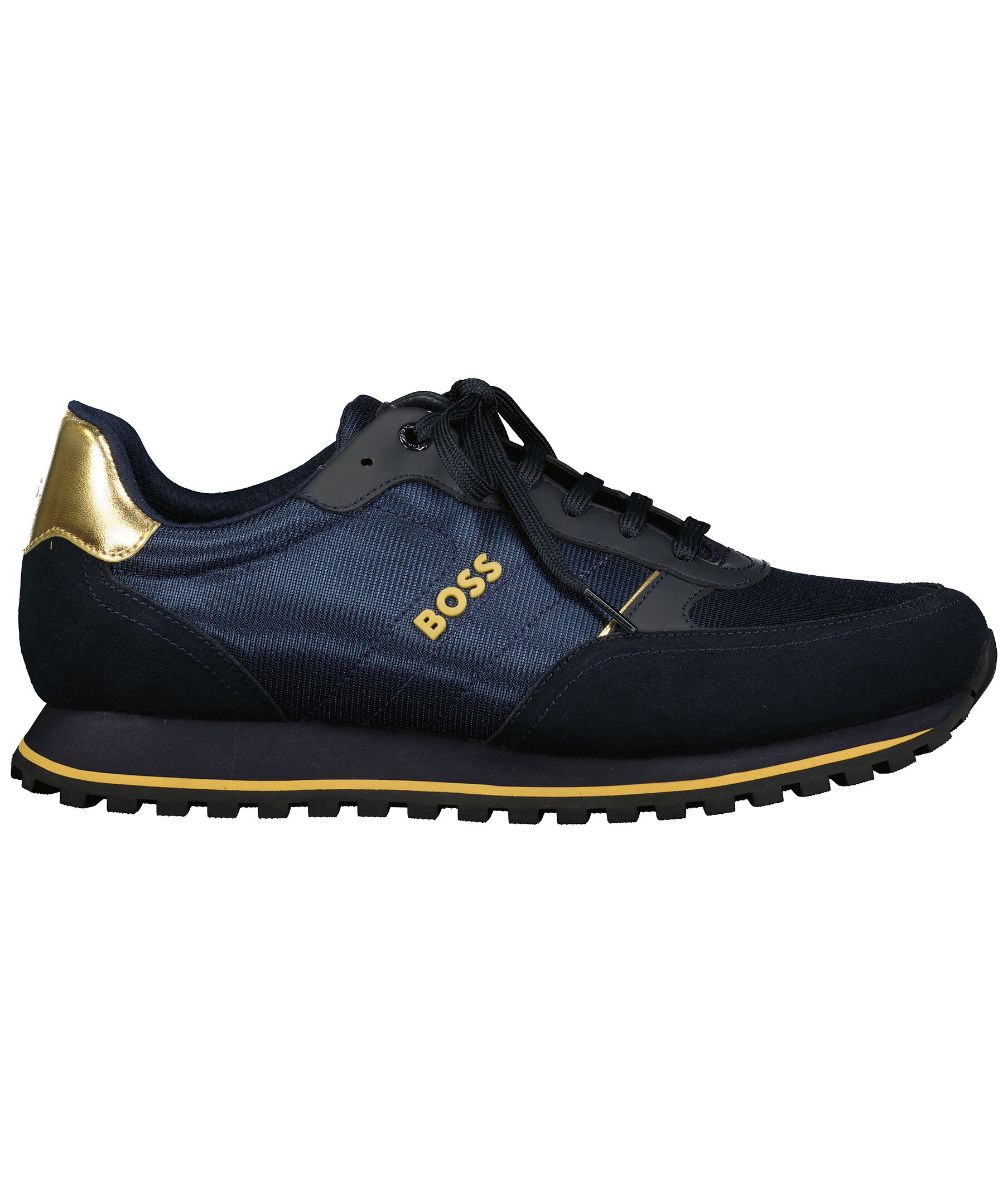 Marinblå sneakers i nylon, mesh och läder från BOSS GREEN. Lätt sula i marinblått med ett beige tunt streck längs med en marinblå undersula. Innersula i memory foam för optimal komfort samt tunt material med fuktavvisande prestanda på sidorna. Marinblå snörning, guldfärgade detaljer på hälen och på sidorna. Logotyp på häl, på flärpen och på utsidan av skon.