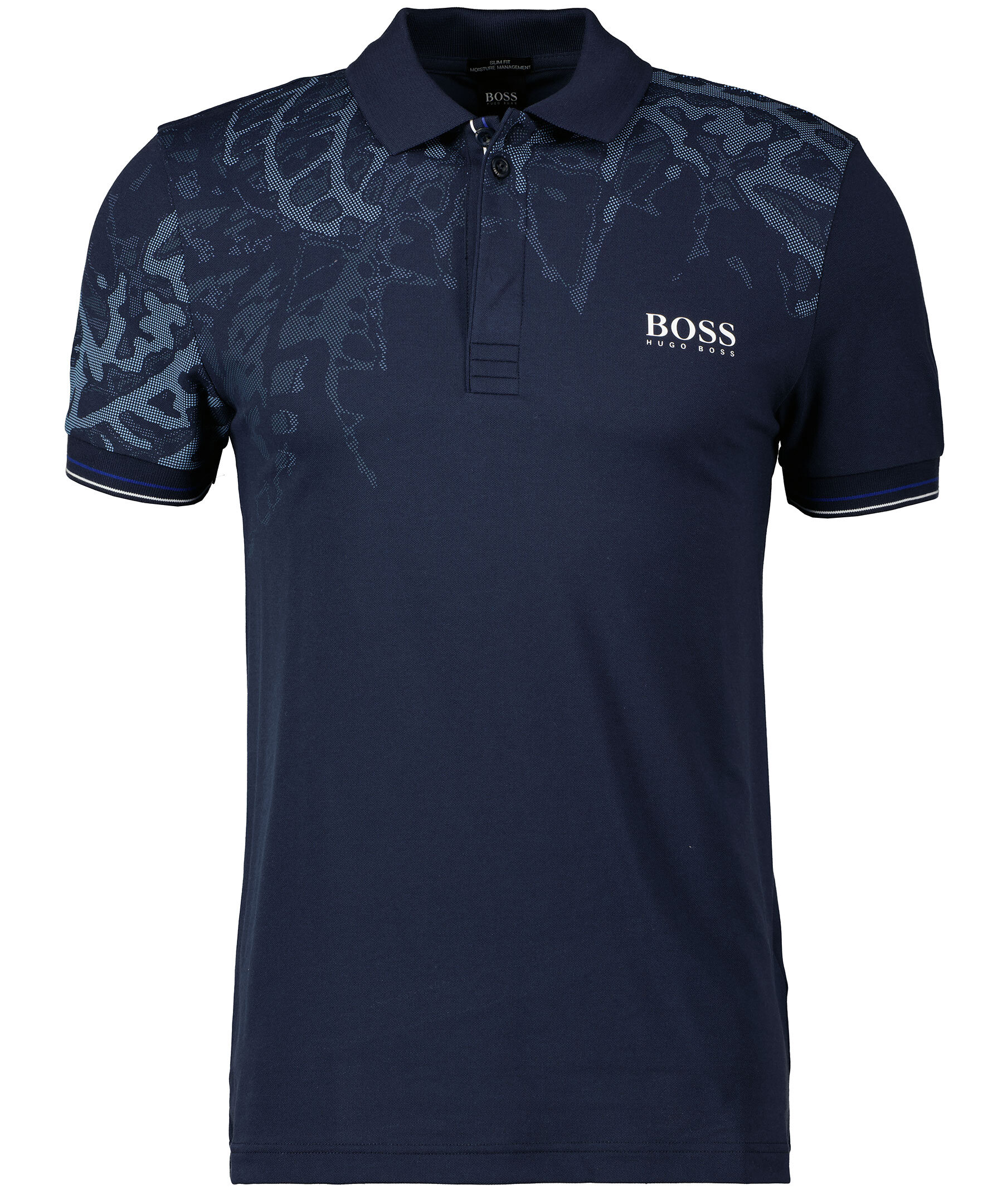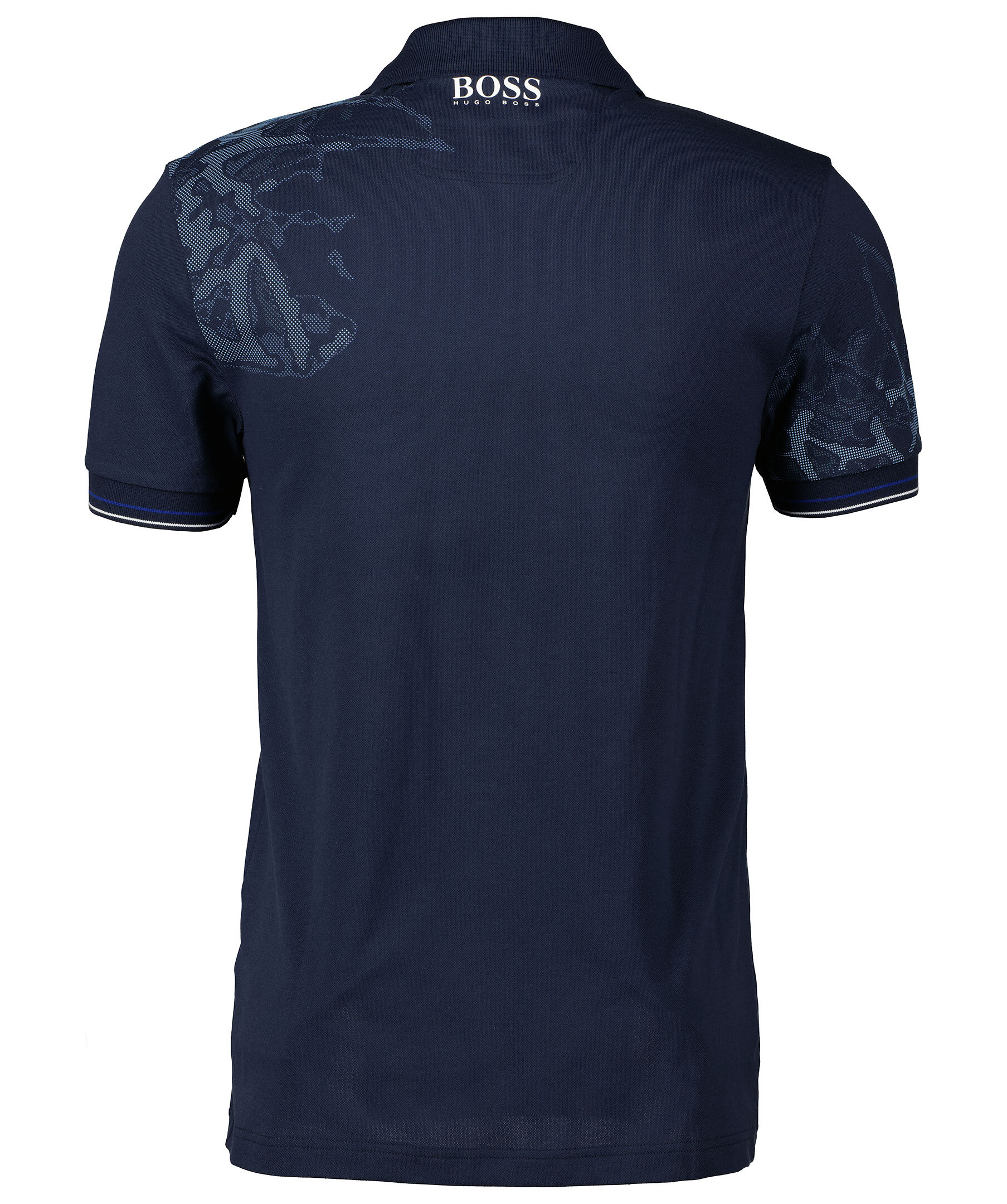 Mörkblå pikétröja från Hugo Boss Athleisure. Två synliga och en dold knapp fram samt tryckt mönster på övre delen av pikén. Vit, tryckt logotyp på vänster sida på bröstet och två tunna ränder på muddarna i ärmslutet. Tillverkad i bomullsblandning.