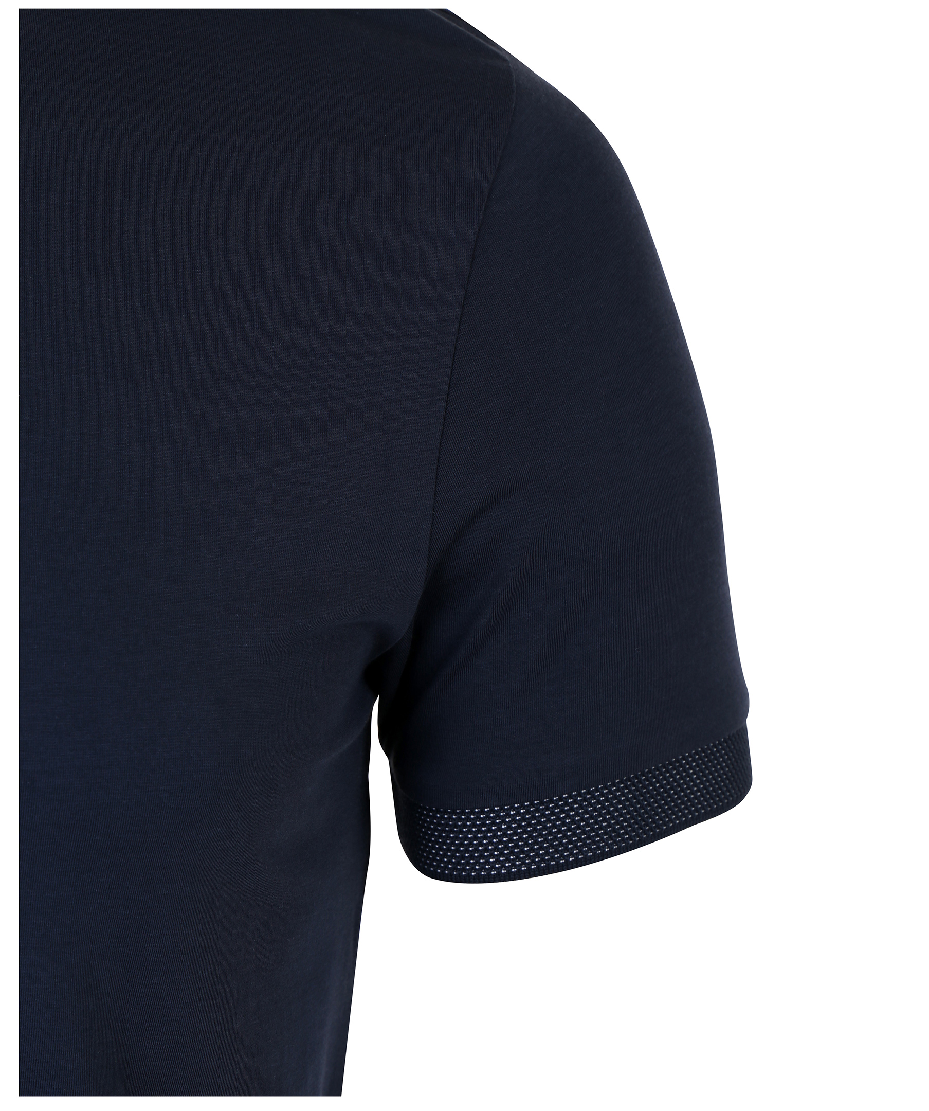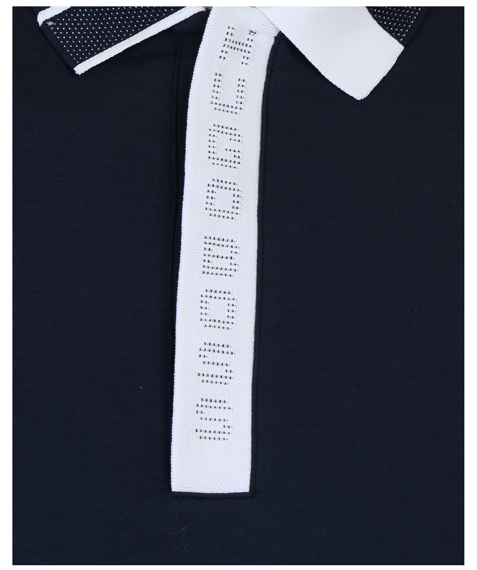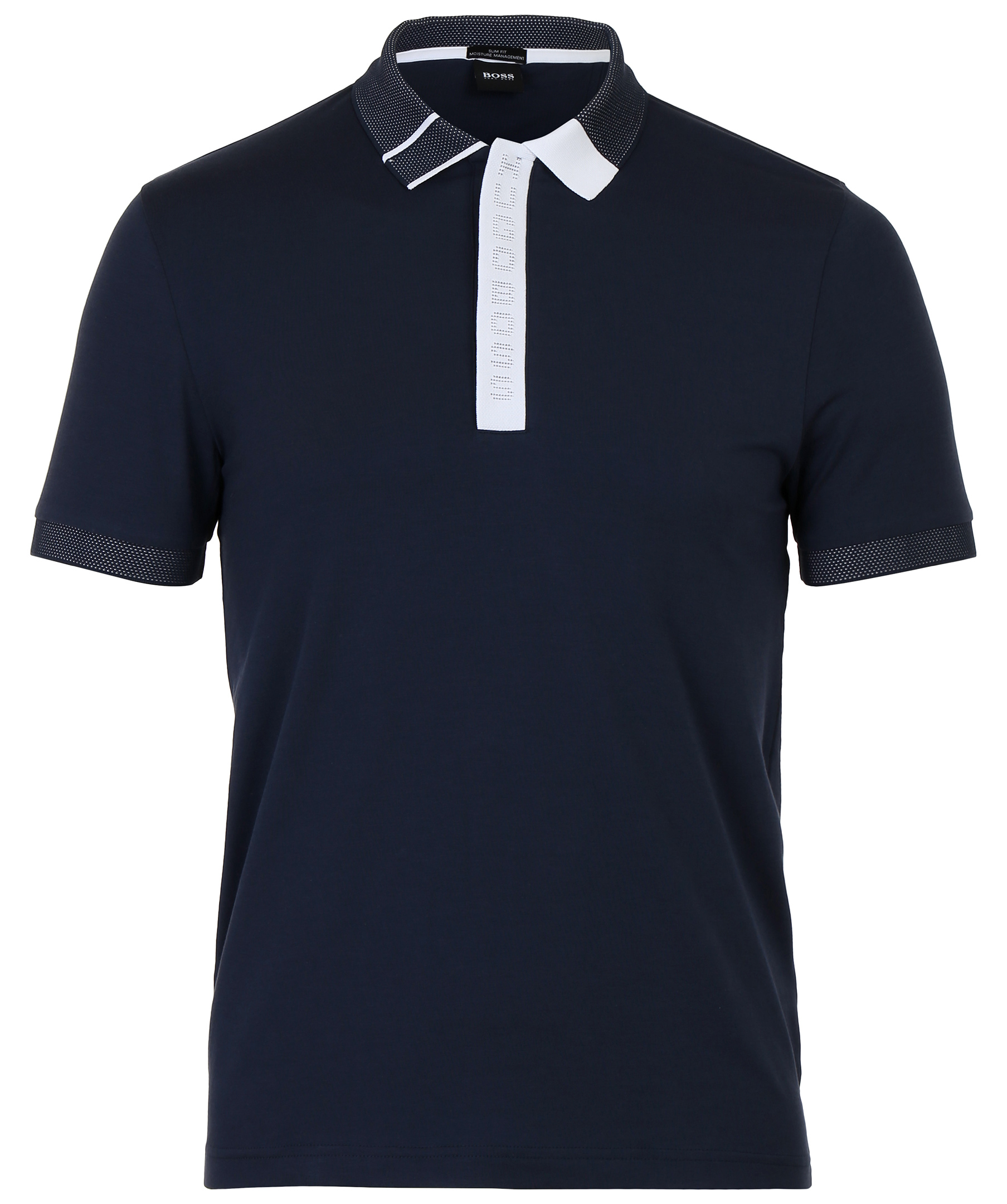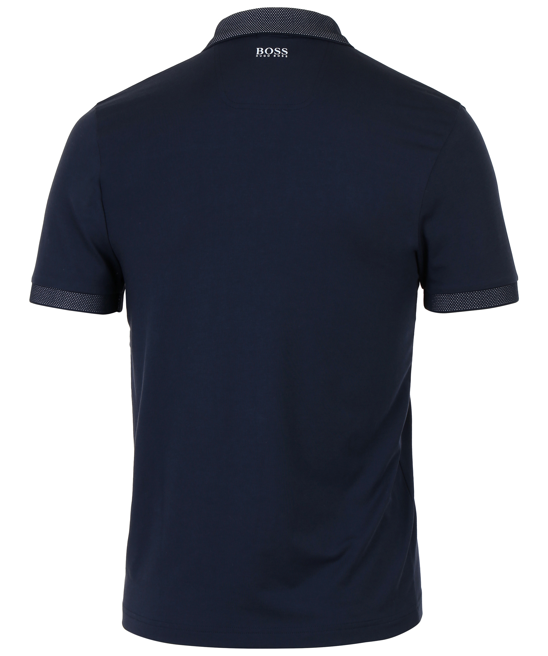 Marinblå, mjuk pikétröja från Boss Athleisure. Vita, prickiga detaljer. Tillverkad i bomull och polyester.