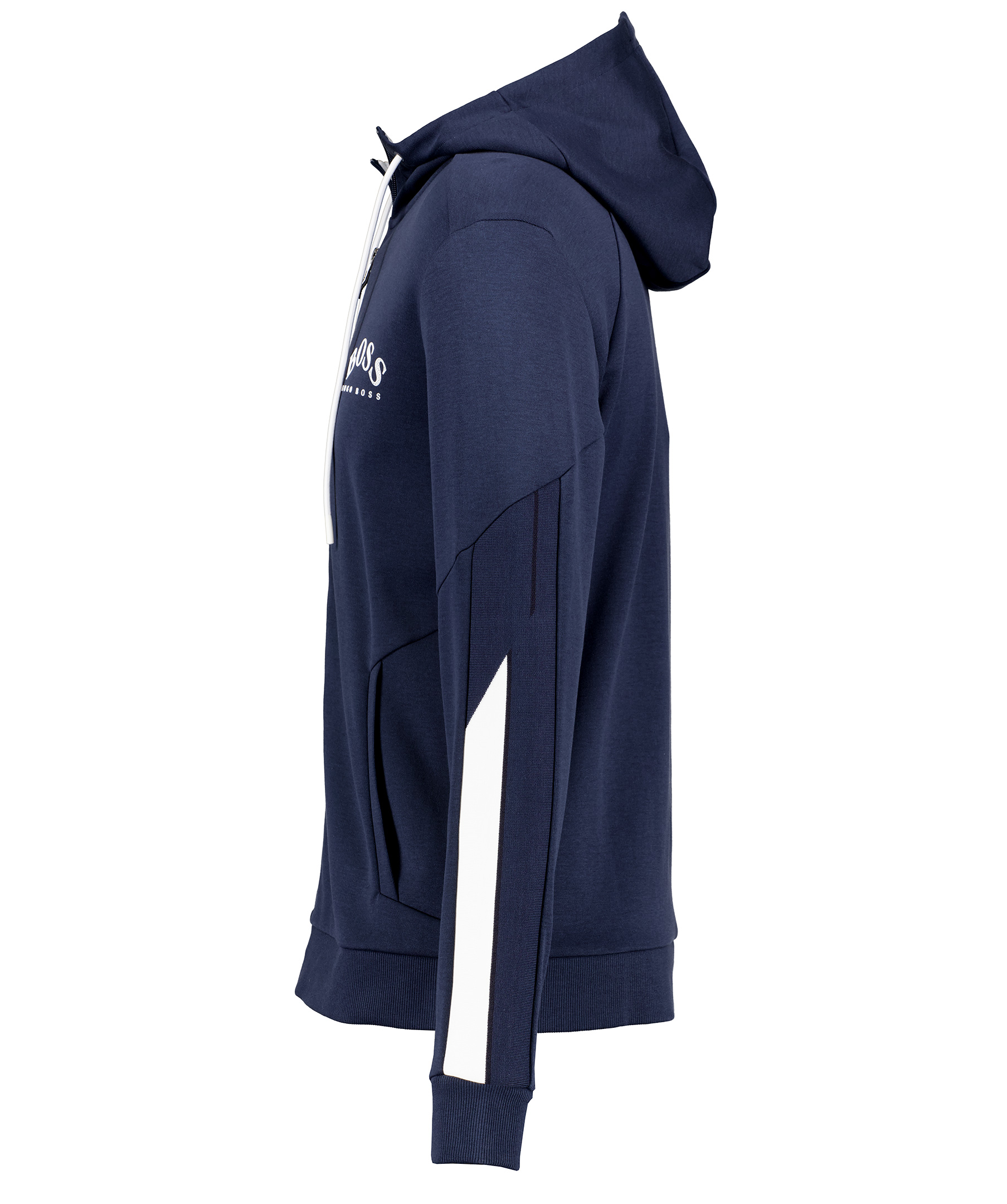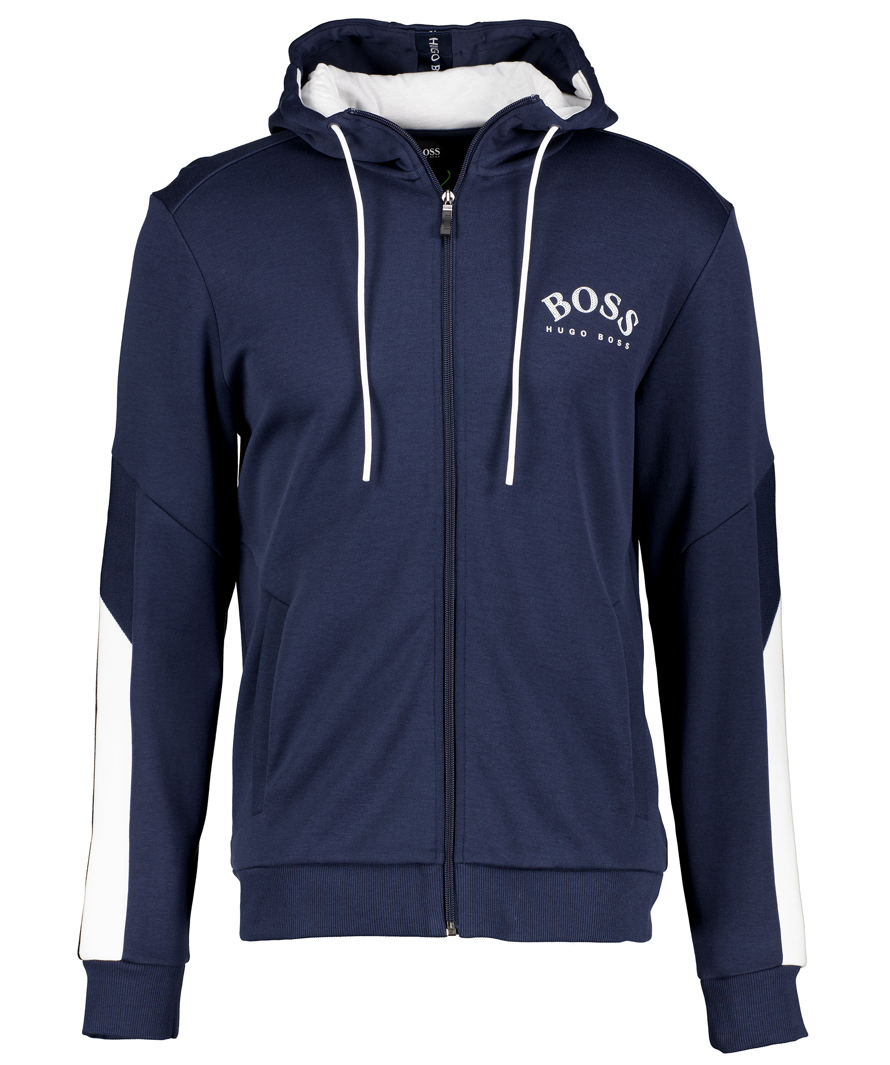 Mörkblå hoodie i bomullsblandning från Hugo Boss. Vit gummerad logga på vänster sida på bröstet och revärer från armbågen ner till ärmslutet i blått med vit bred rand med en tunn svart rand på sidan. Fickor på magen, stängs med dragkedja och har och ribbade muddar på ärmslut och i plaggslut. Luva med vit snörning.
