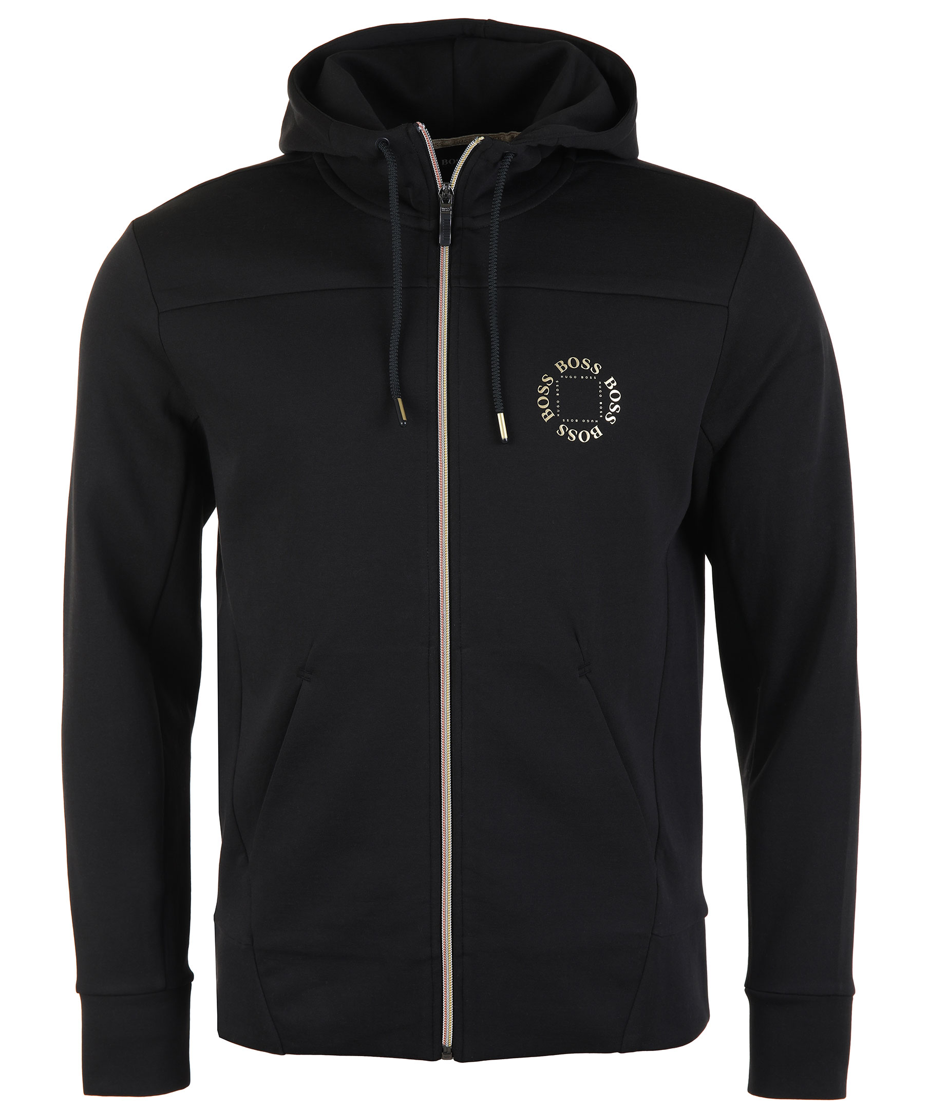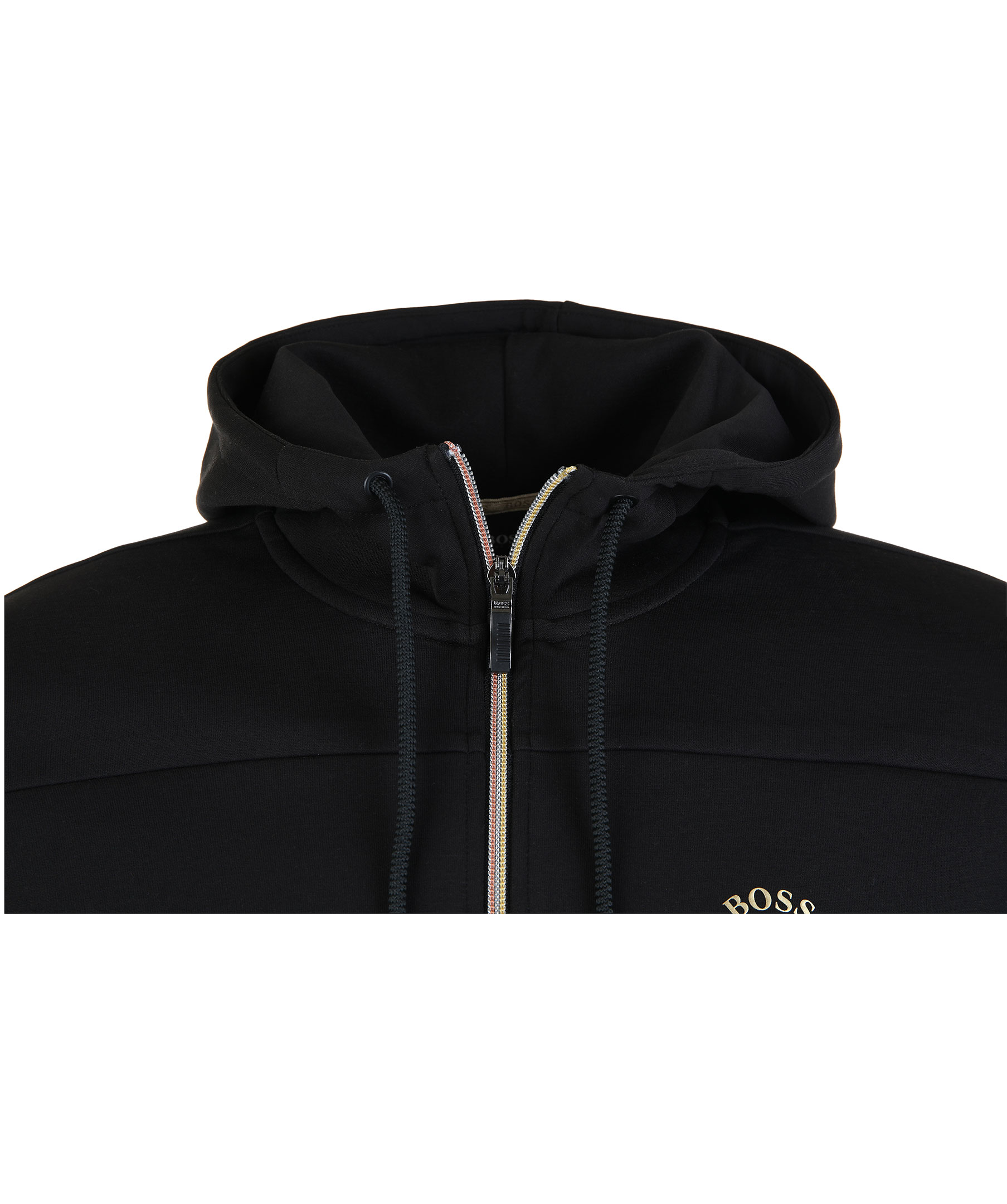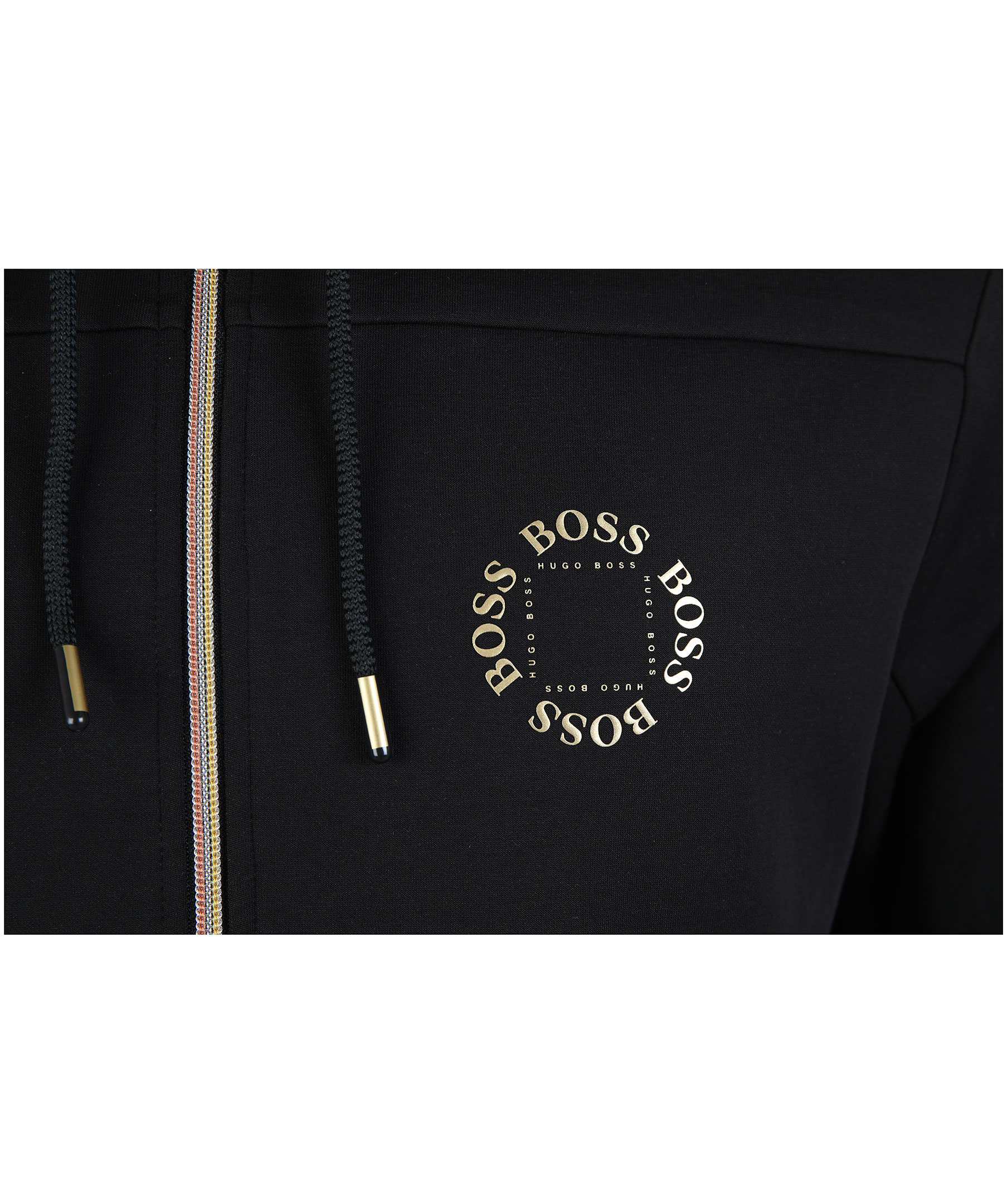 Svart hoodie från Hugo Boss Athleisure. Tillverkad i bomullsmix. Guldfärgade detaljer, logotyp på bröstet, två fickor fram samt muddar i ärmslut.