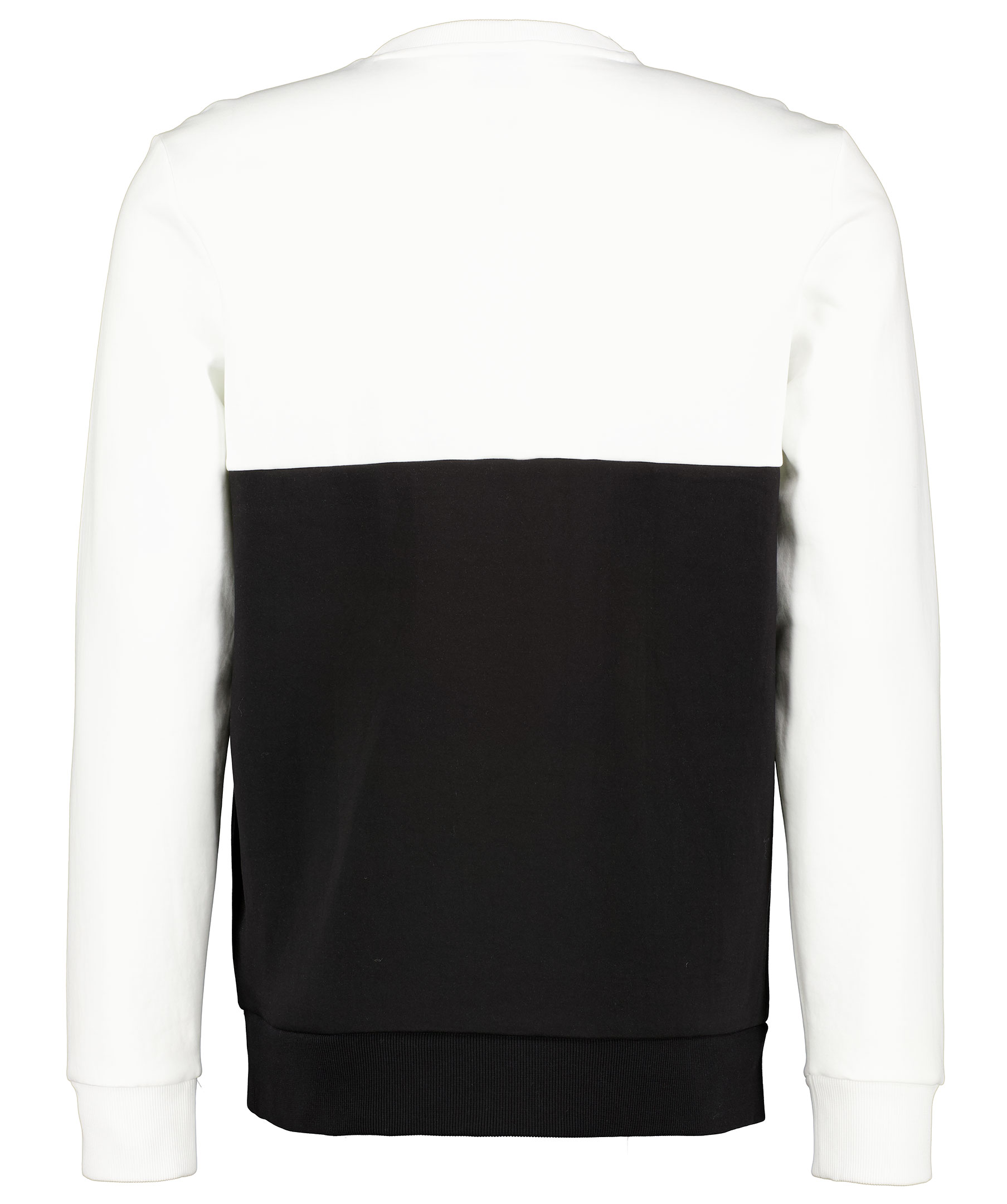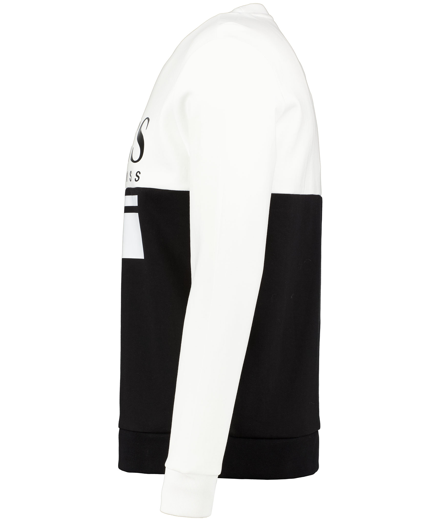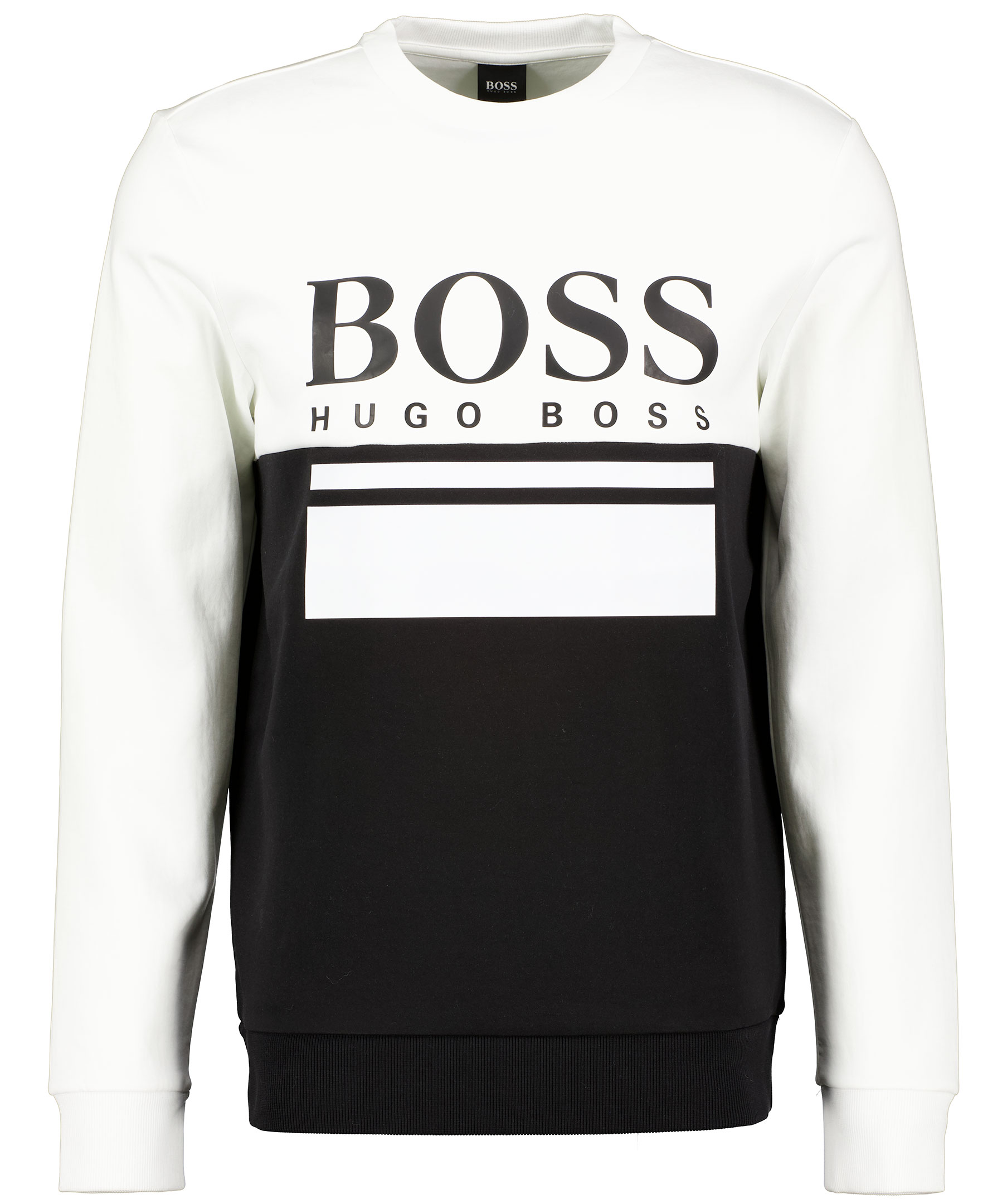 Svart och vit sweatshirt från Hugo Boss Athleisure. Tillverkad i bomullsmix. Tvådelad, vit överdel och svart underdel. Stor svart och vit logotyp på bröstet och ribbade muddar i ärmslut och plaggslut och en slät mudd i halsringning. * Crew neck * Stretchig * Svart och vit logga