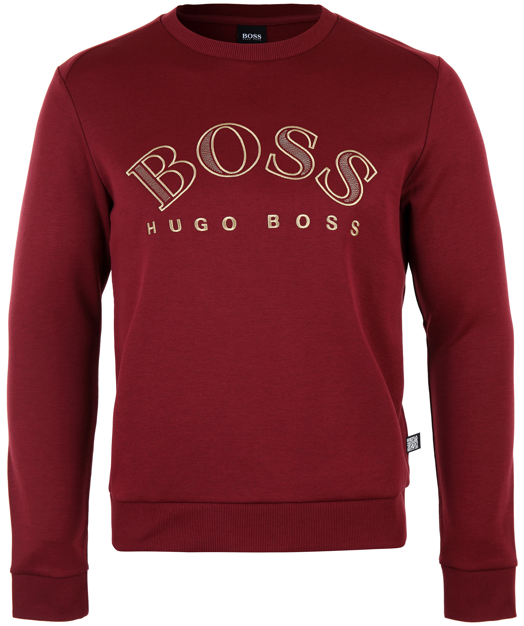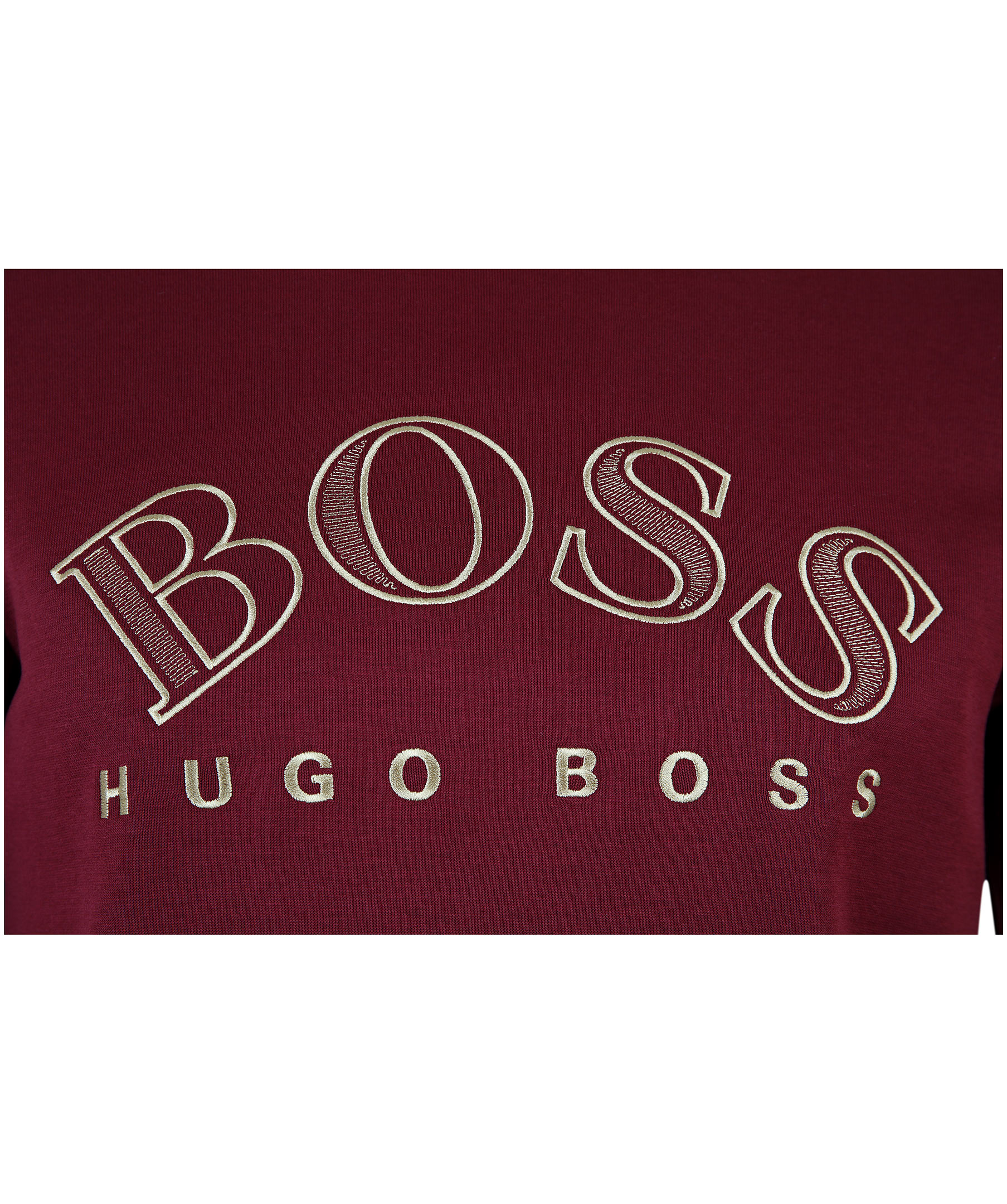 Mörkröd sweatshirt i bomullsblandning från Hugo Boss med broderad logga på bröstet. Normal passform, rundad hals, långa ärmar och ribbstickade muddar.