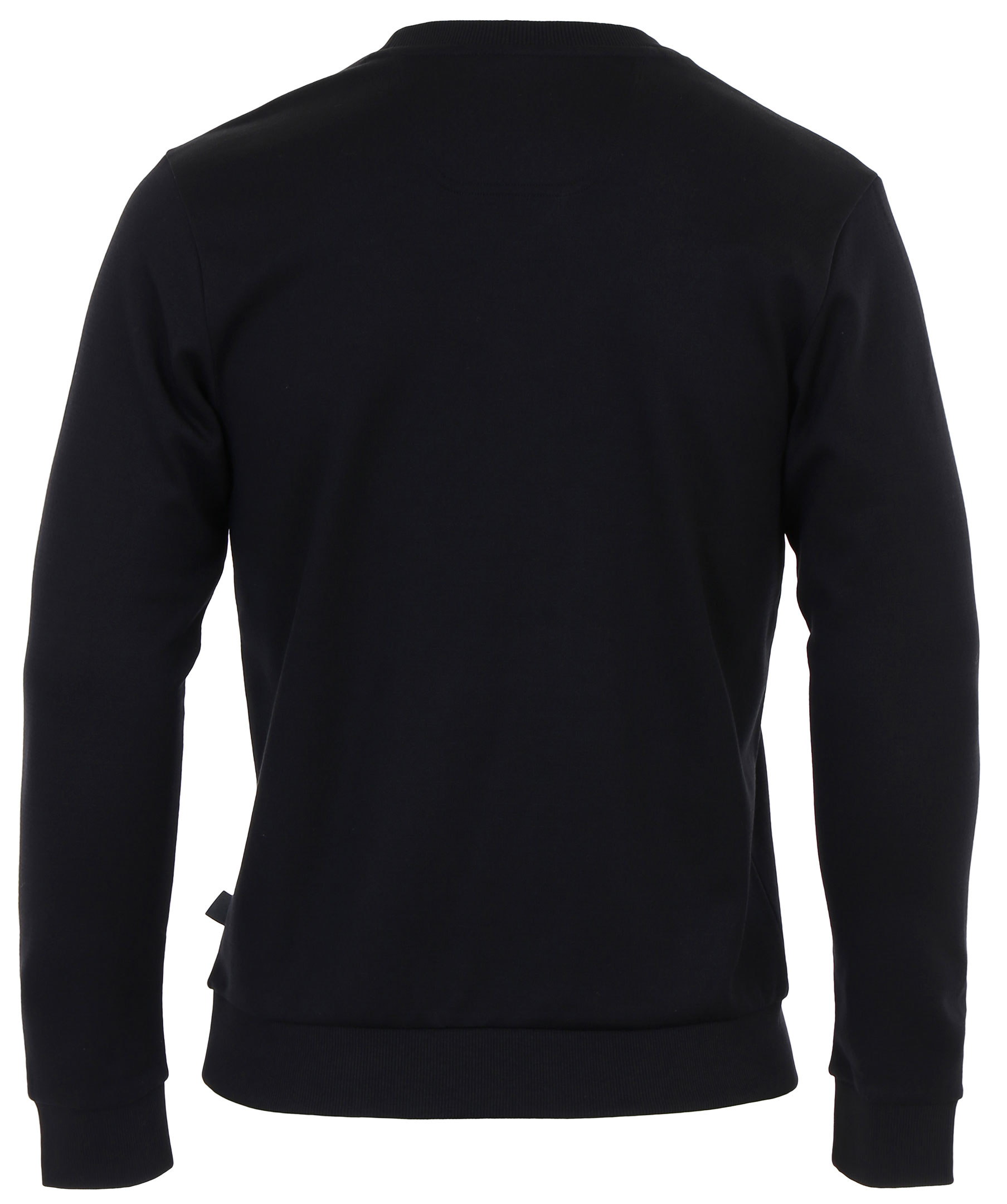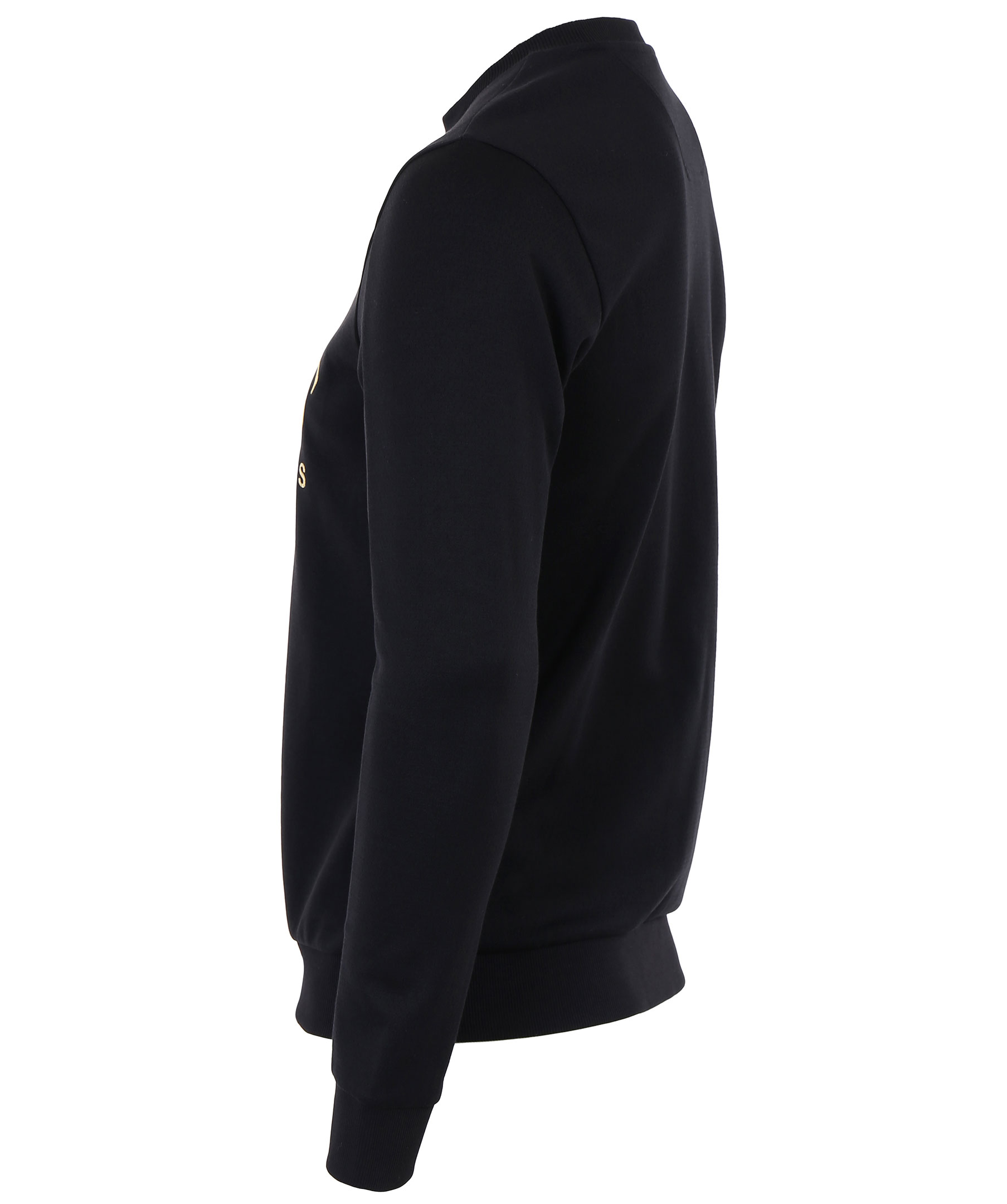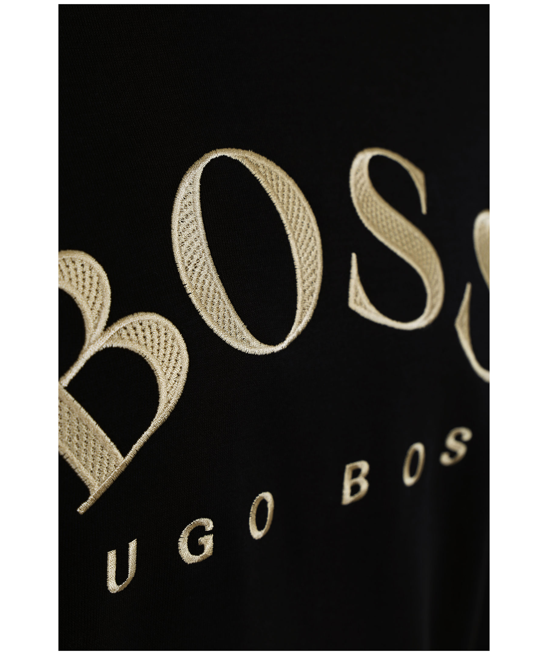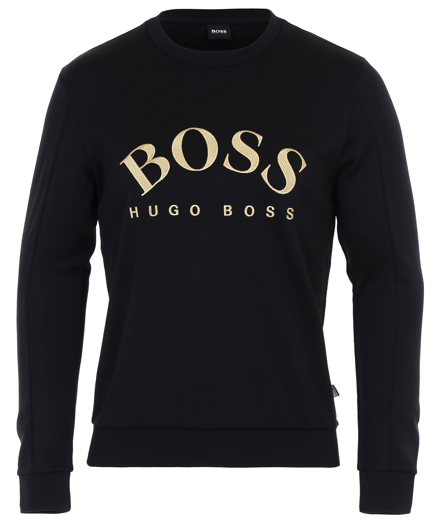 Svart sweatshirt i bomullsblandning från Hugo Boss. Broderad guldfärgad logga på bröstet och småmönstrat tyg på ryggen och ärmarna. Normal passform, rundad hals, långa ärmar och ribbstickade muddar.