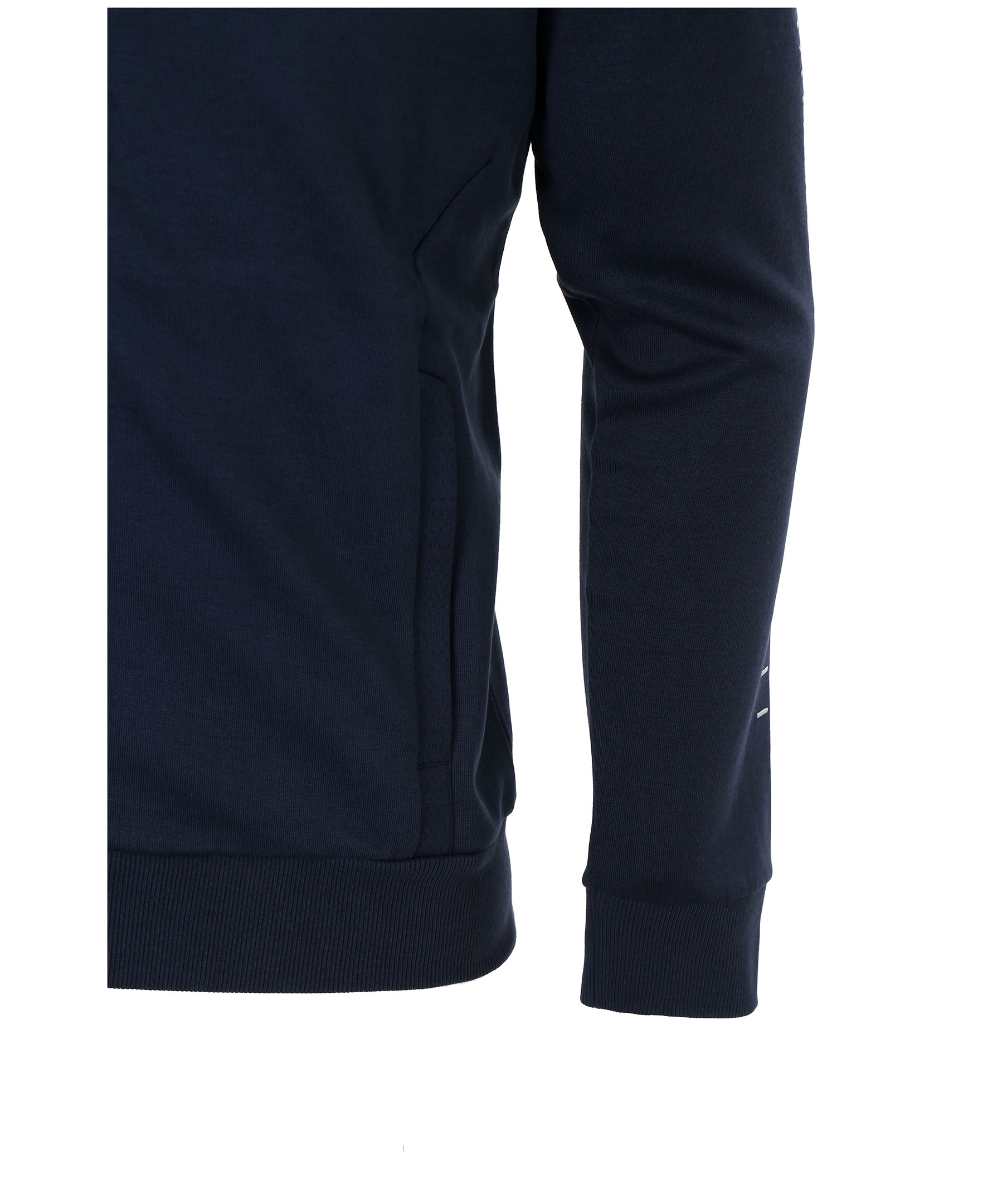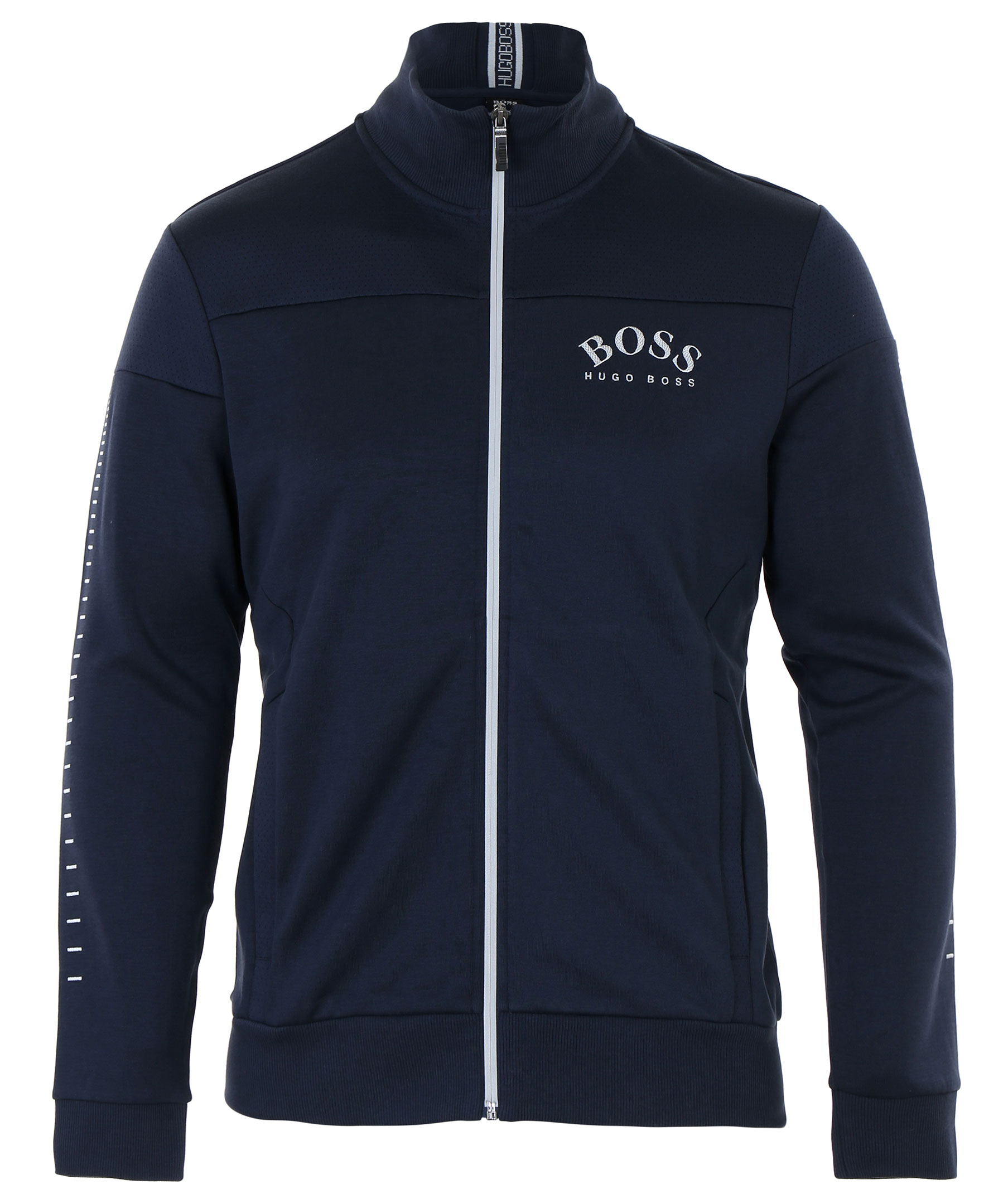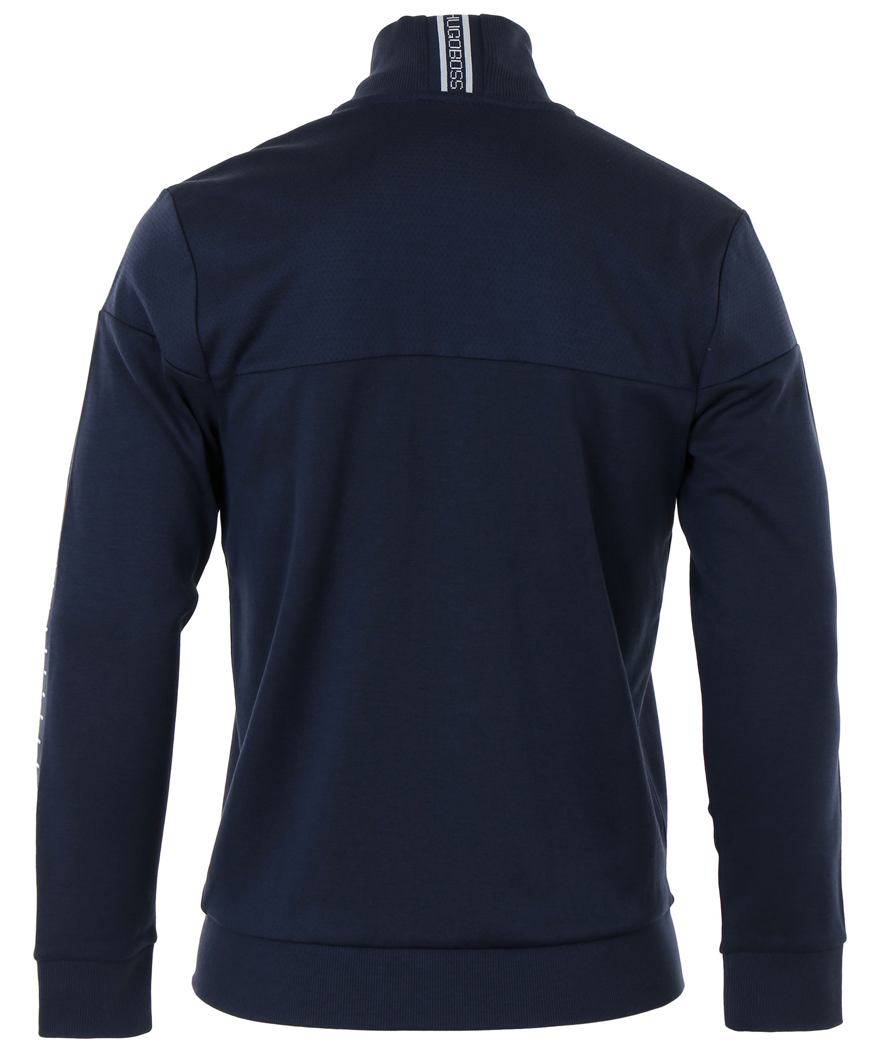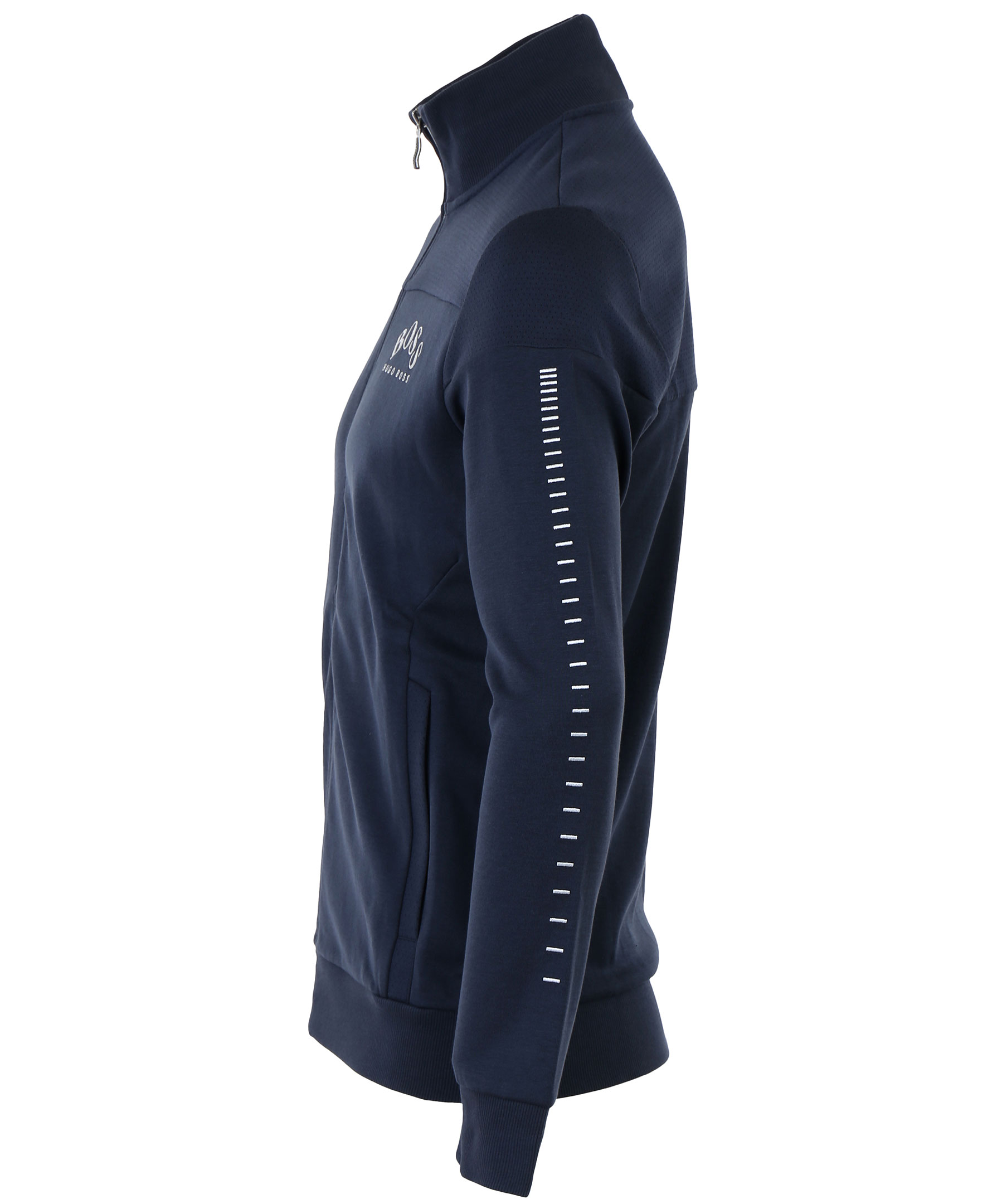 Mörkblå ziptröja i bomullsblandning med krage från Hugo Boss. Logotyp broderat på vänster bröst, broderade sträck på båda armarna och dragkedja med reflex. Fickor fram.