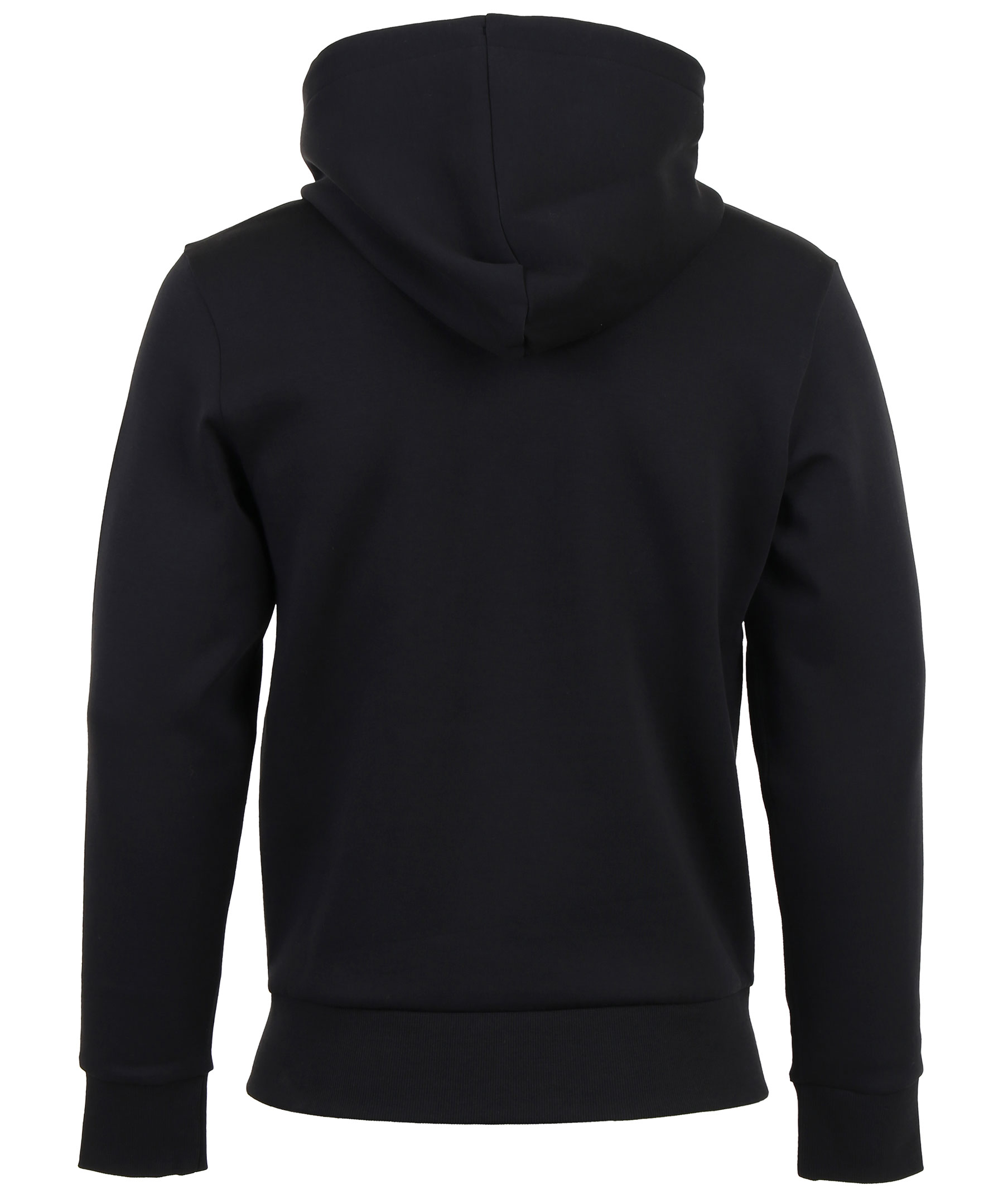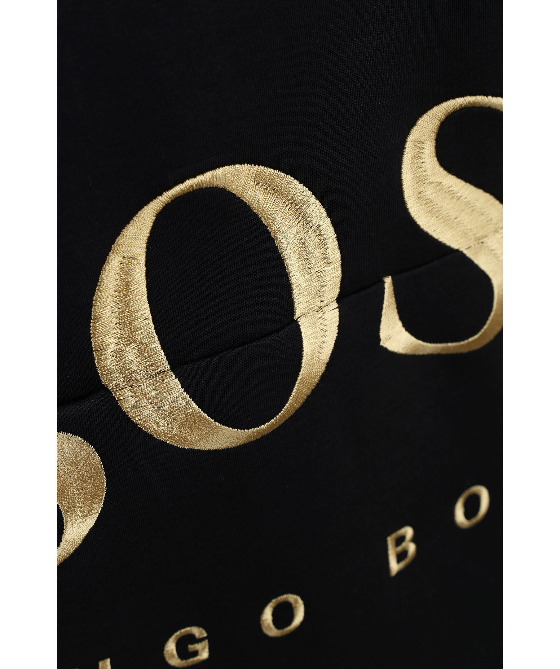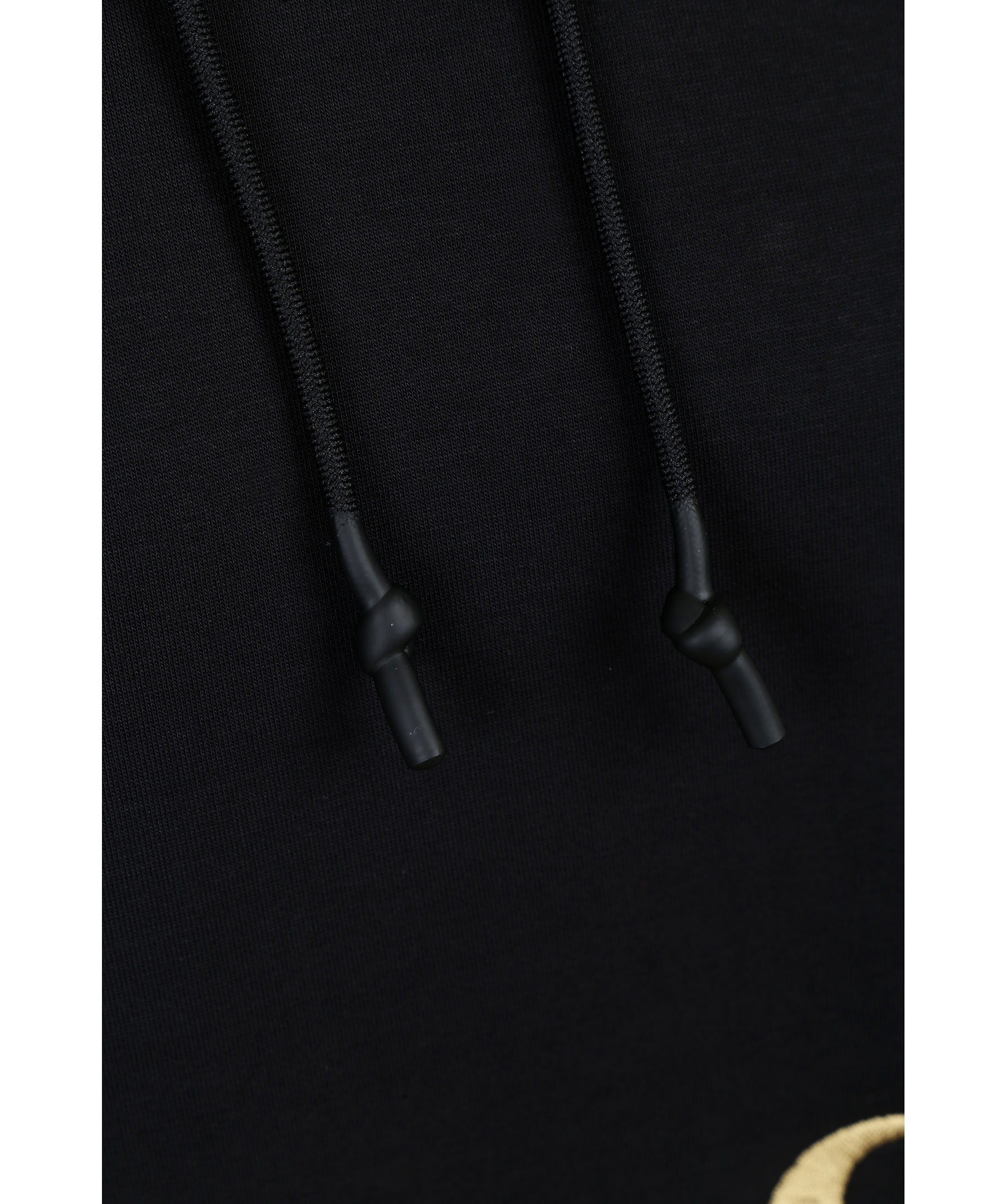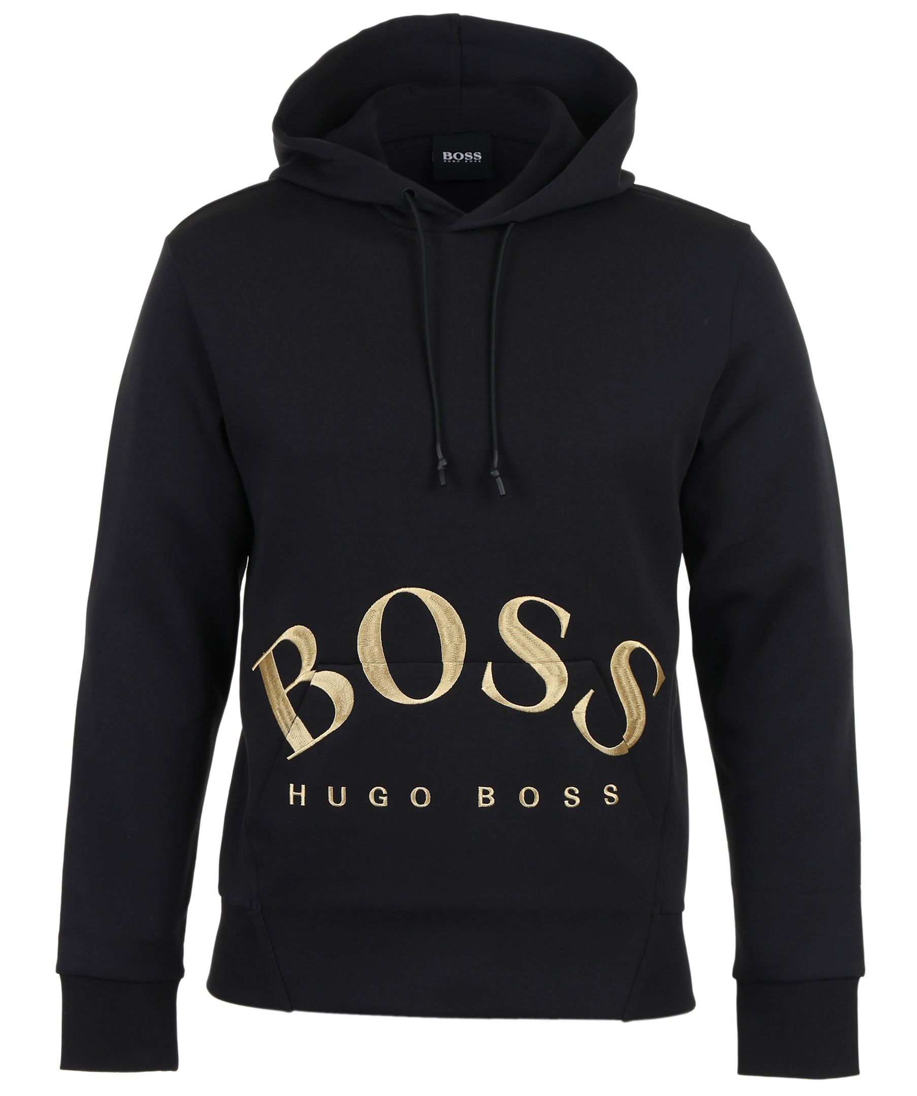 Svart hoodie med dragsko i luvan från Hugo Boss. Har stor guldfärgad, broderad logotyp på magen och muddar i ärm och plaggslut och ficka på magen.