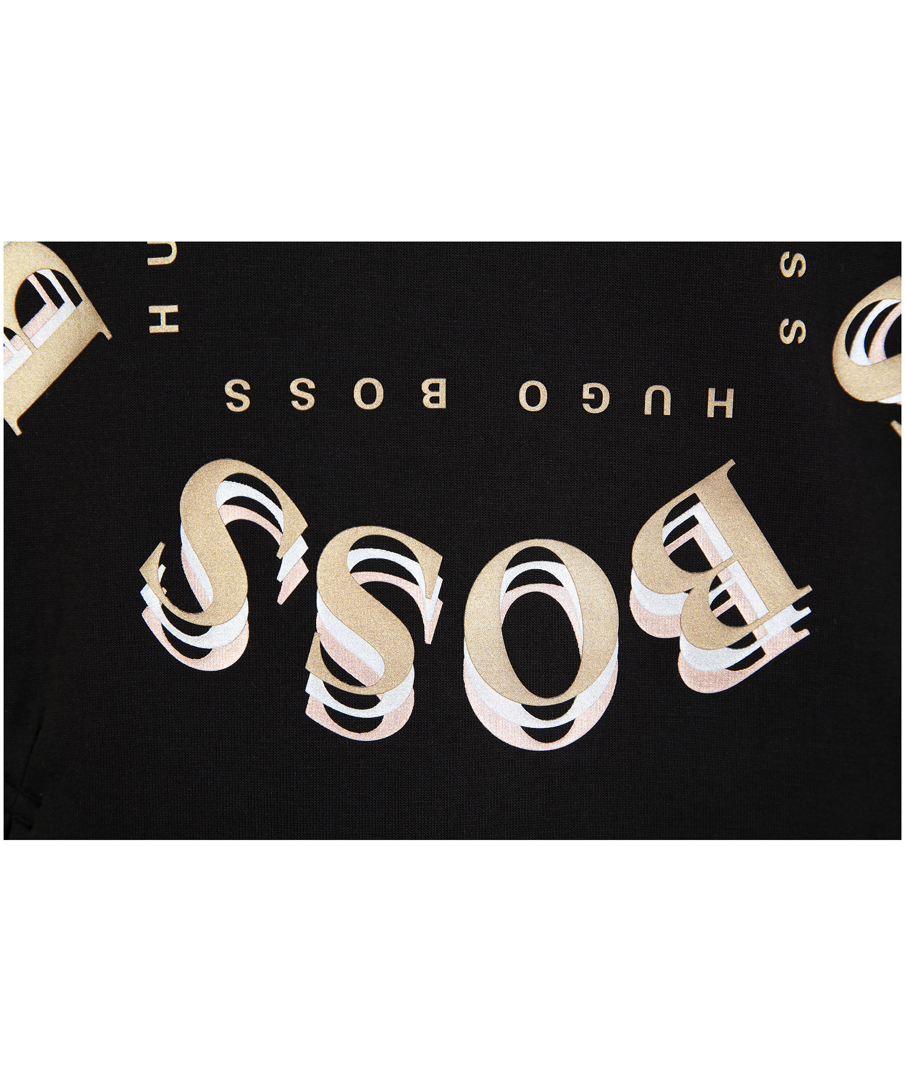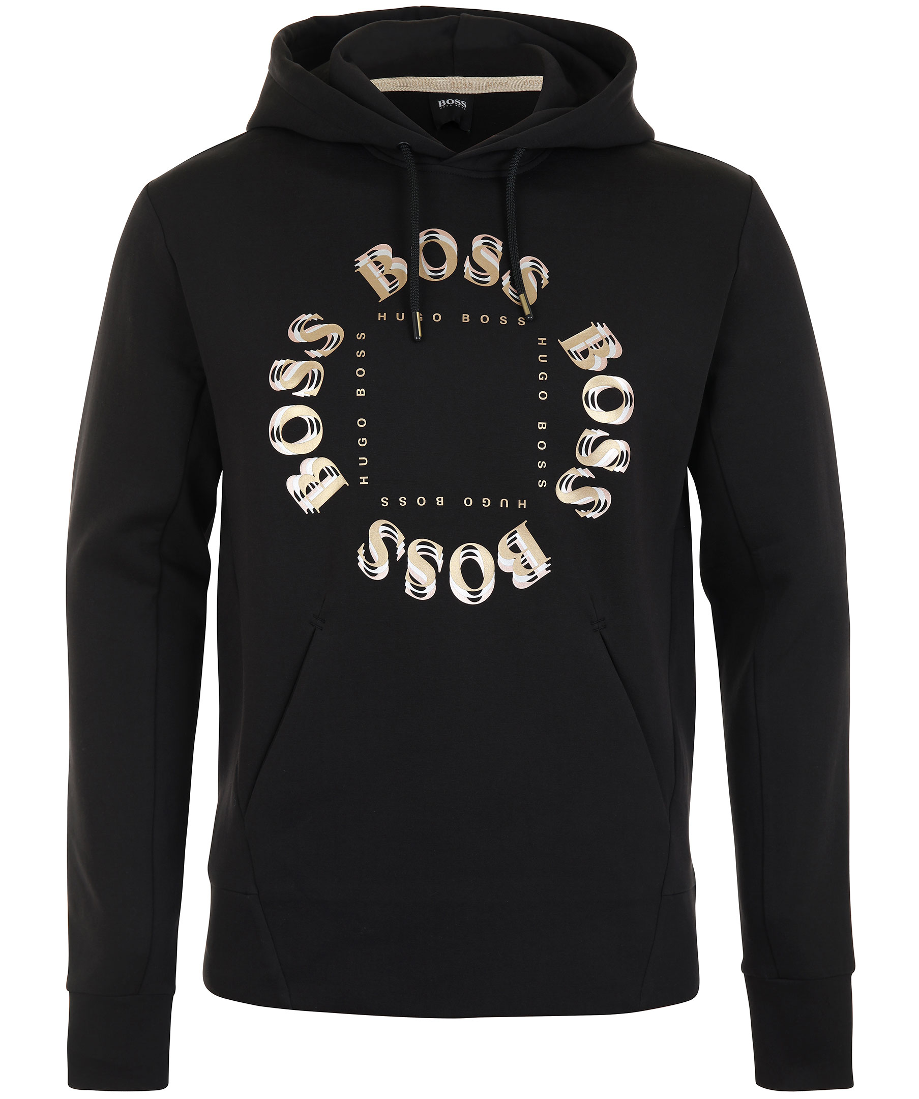 Svart hoodie från Hugo Boss Athleisure. Tillverkad i bomullsmix. Stort guldfärgat tryck på bröstet, ficka på magen, muddar i ärmslut.