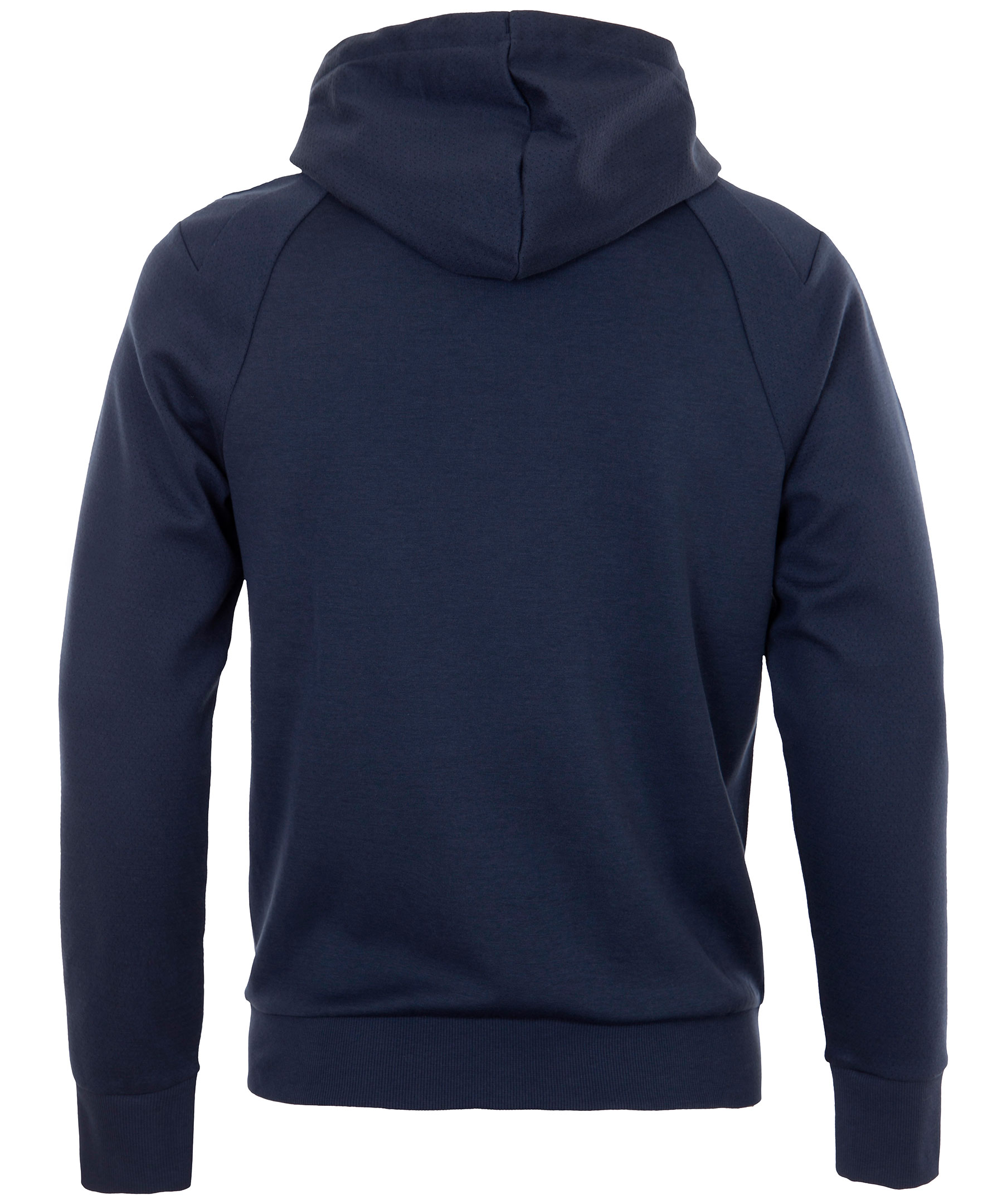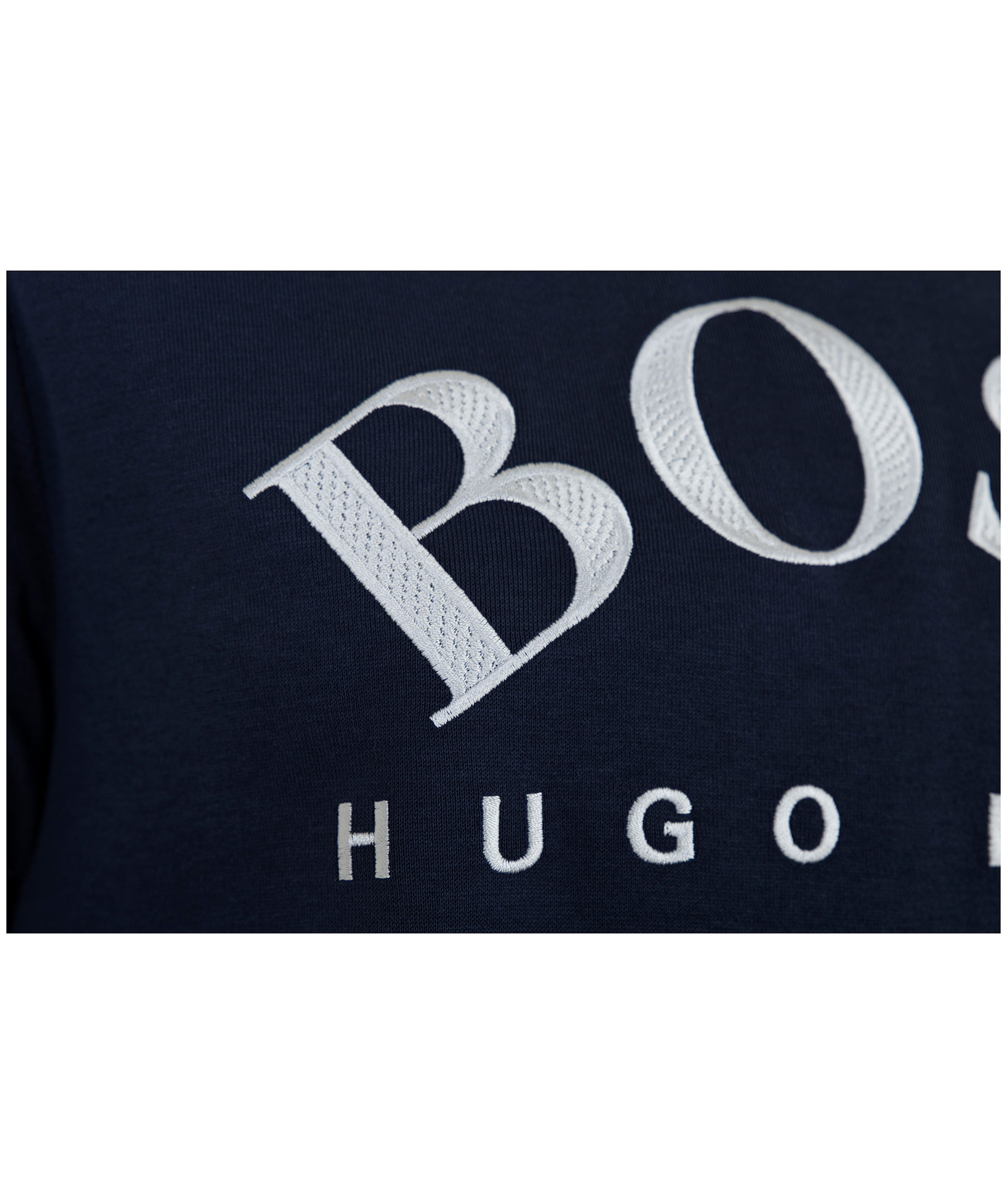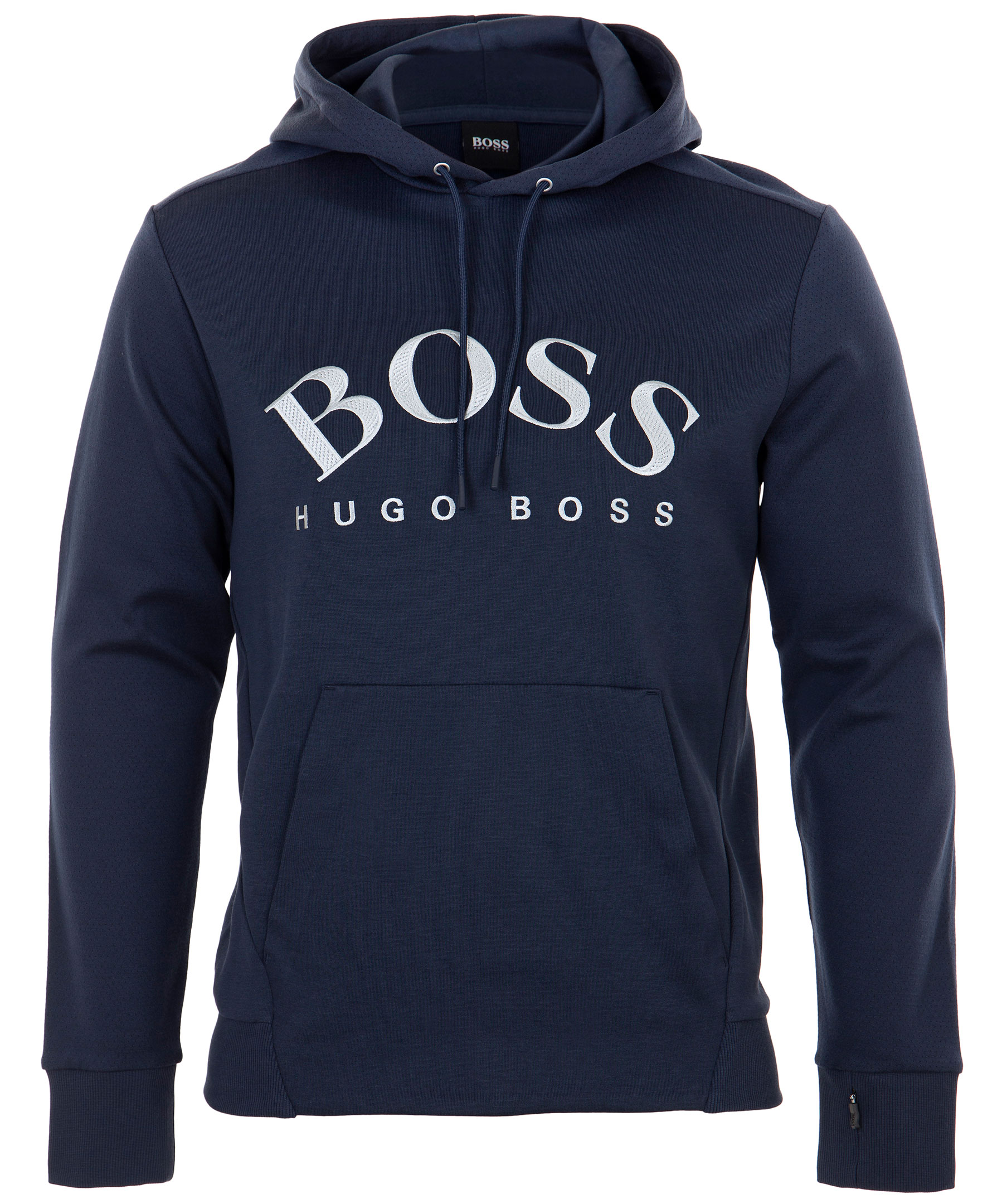 Mörkblå hoodie i bomullsblandning från Hugo Boss. Broderad logga på bröstet och småmönstrat tyg på ärmarna. Normal passform, rundad hals, långa ärmar och ribbstickade muddar. Dragsko i luva och ficka på magen.