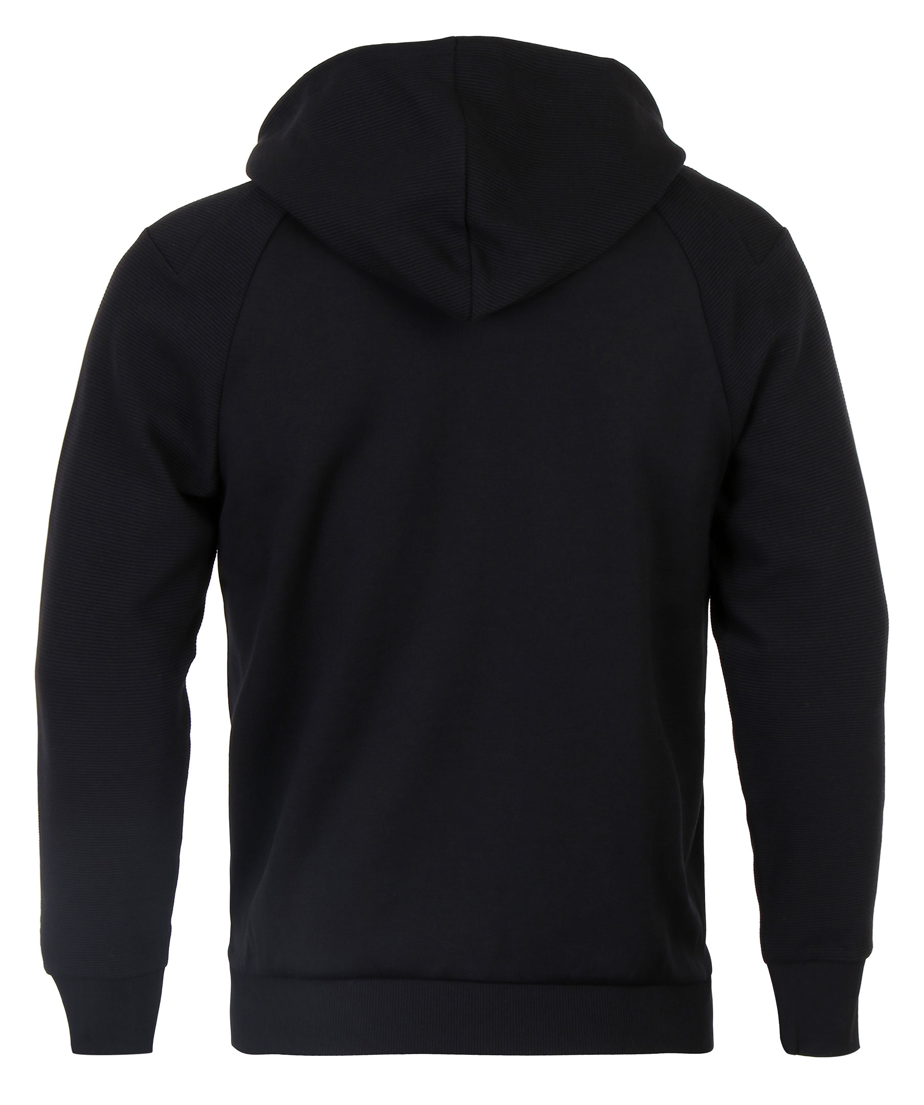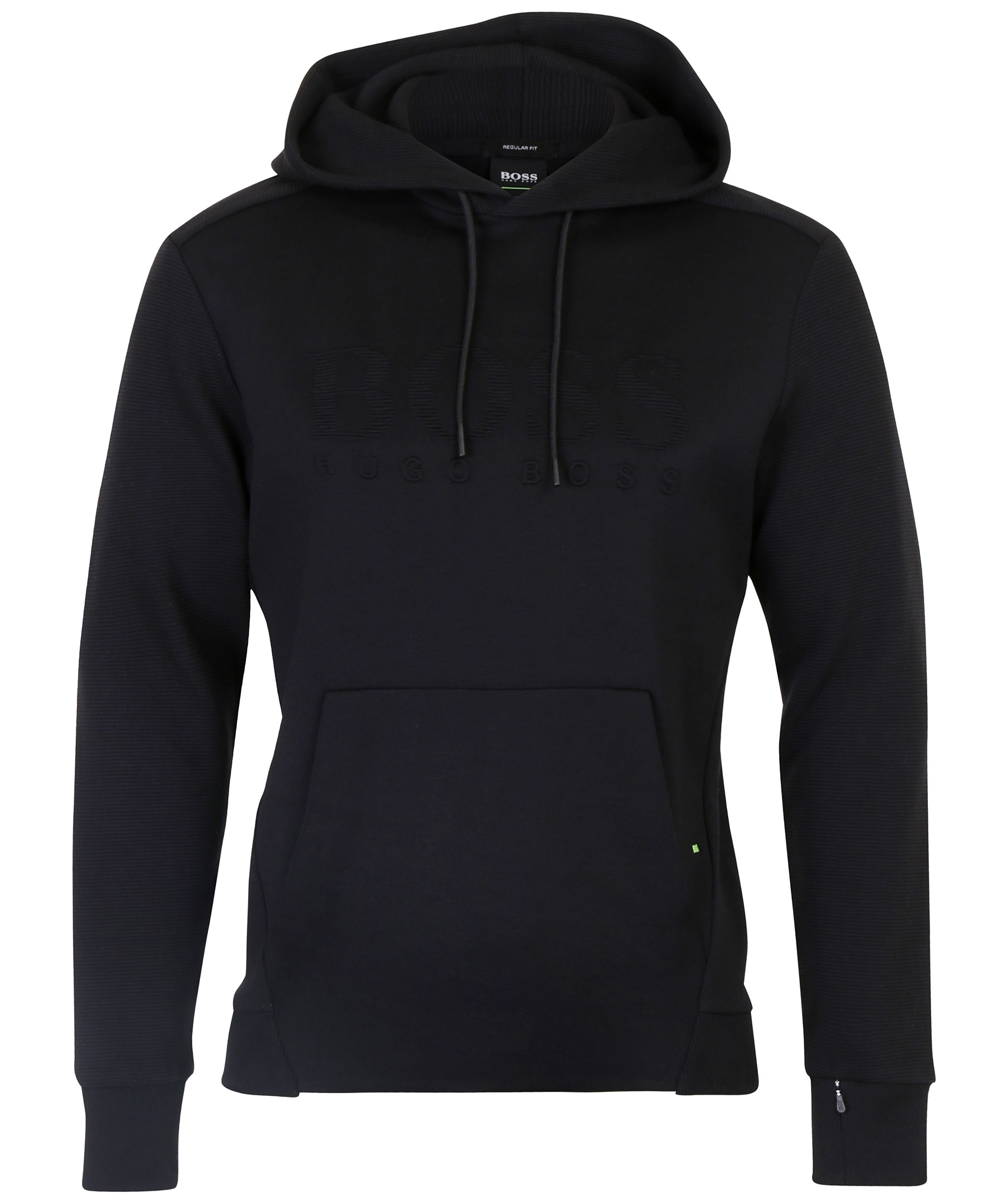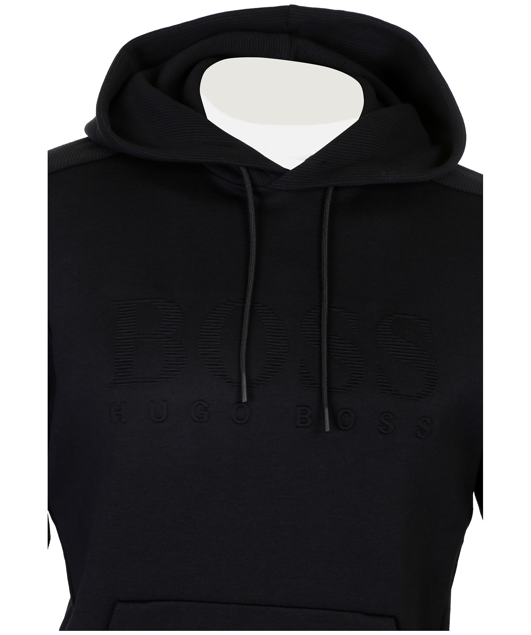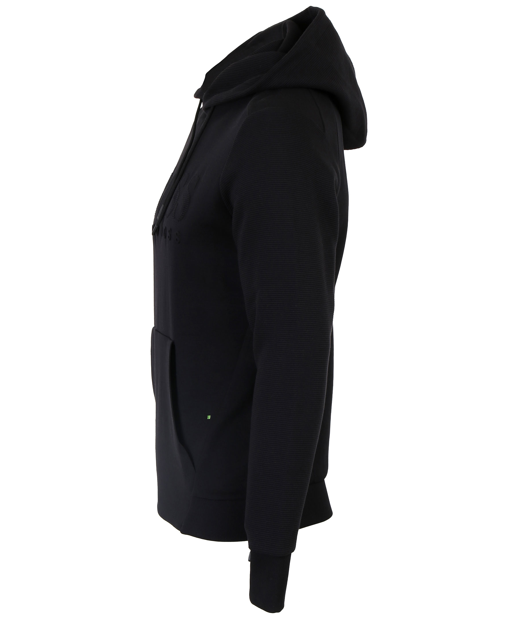 Svart luvtröja från Hugo Boss Athleisure kollektion. Stor logotyp på bröstet, snörning i luva, ficka på magen och ribbstickade muddar.