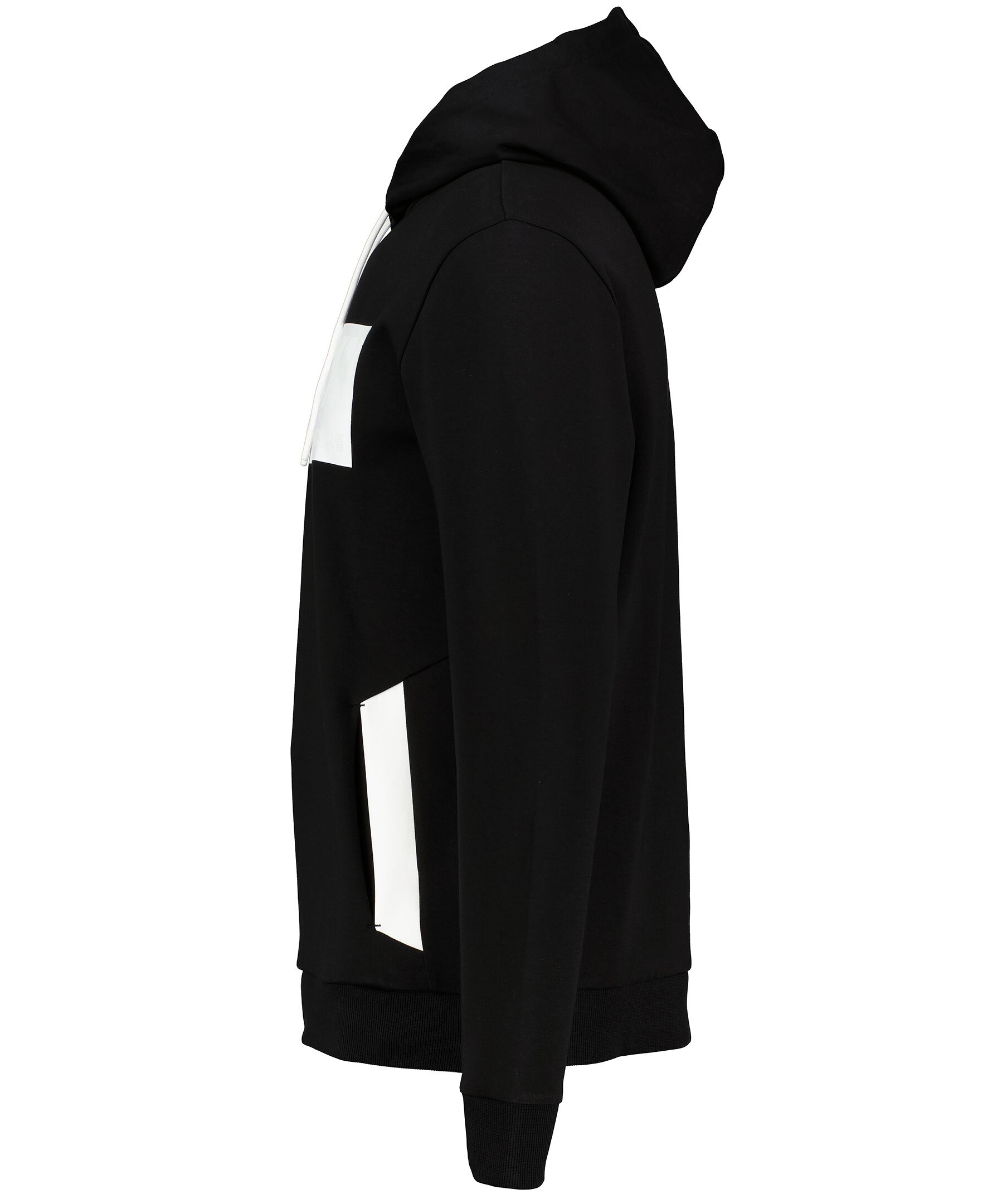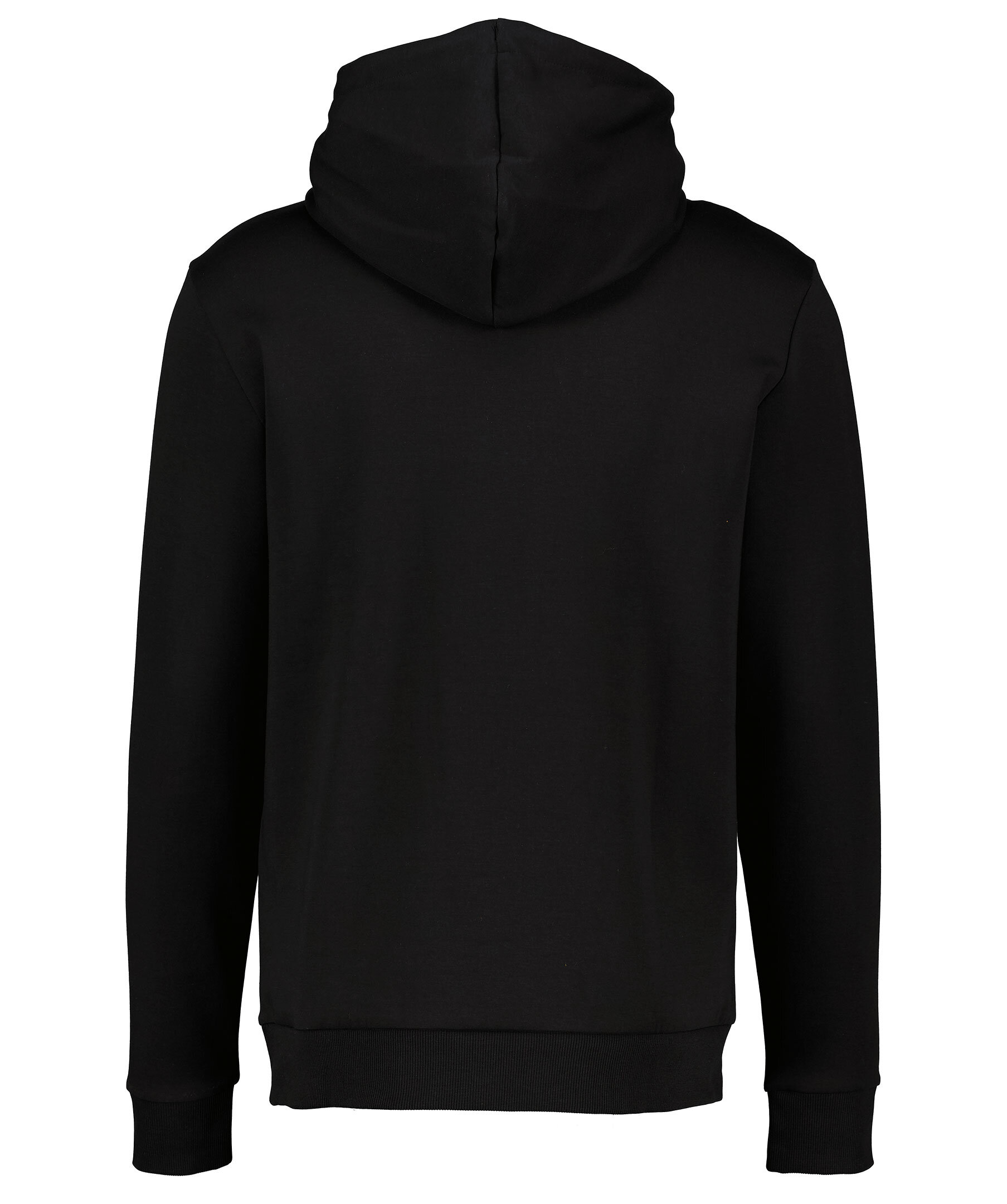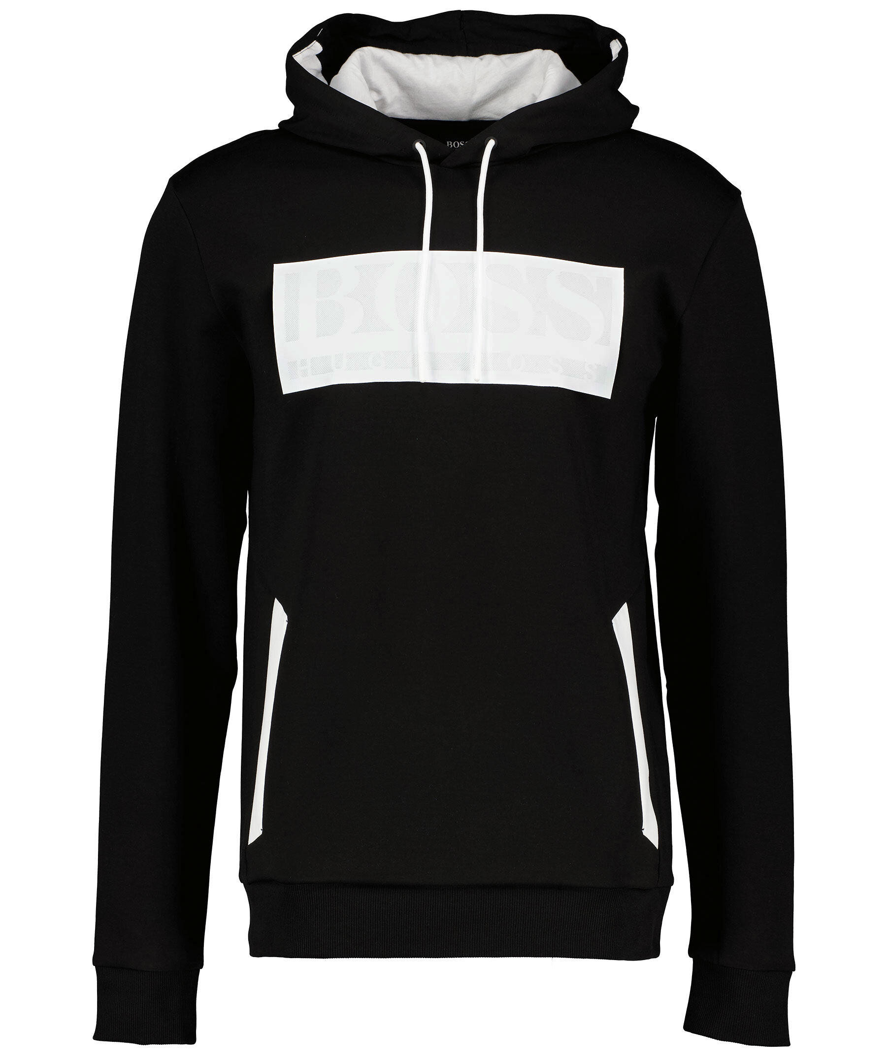 Svart hoodie från Boss Athleisure. Tillverkad i polyester och bomullsblandning. Vit ruta med logotyp, känguruficka på magen och ribbade muddar i ärmslut och plagggslut. Luva med vitt innertyg och dragsko med vit snörning.