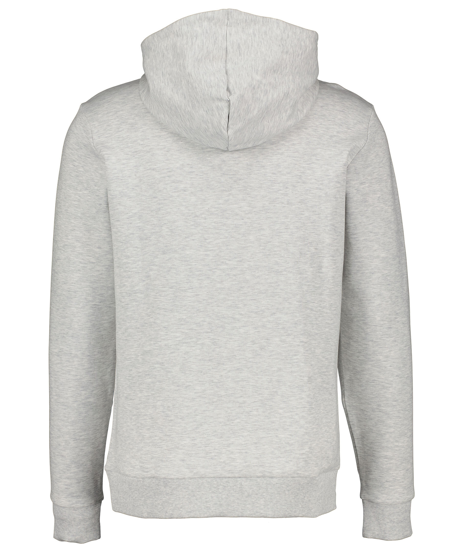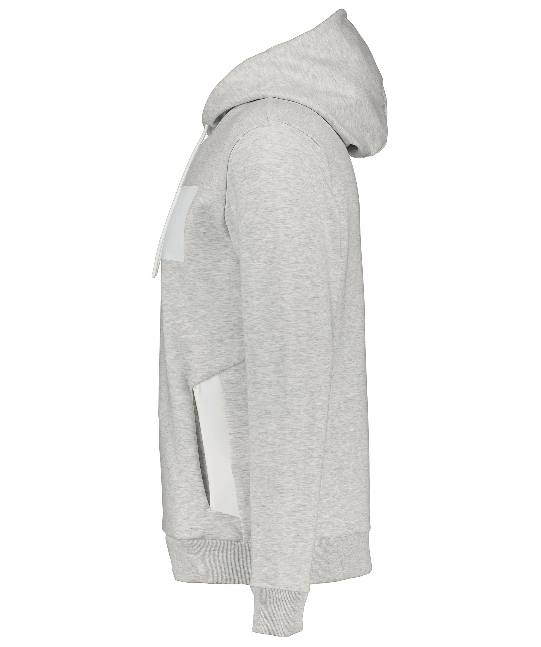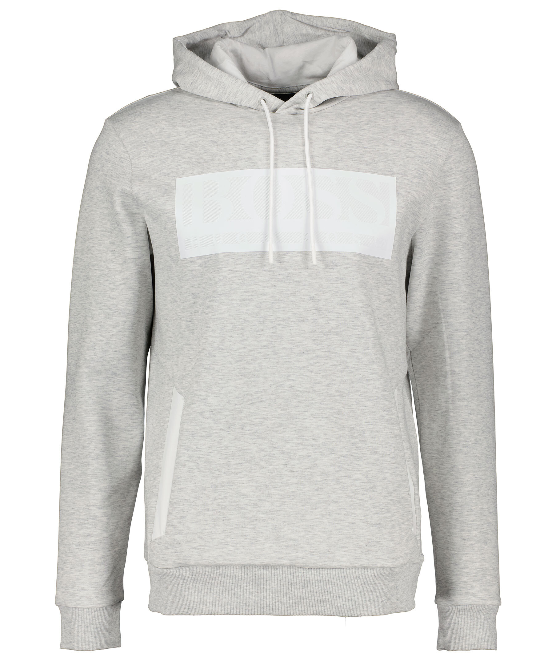 Ljusgrå hoodie från Boss Athleisure. Tillverkad i polyester och bomullsblandning. Vit ruta med logotyp, känguruficka på magen och ribbade muddar i ärmslut och plagggslut. Luva med vitt innertyg och dragsko med vit snörning.