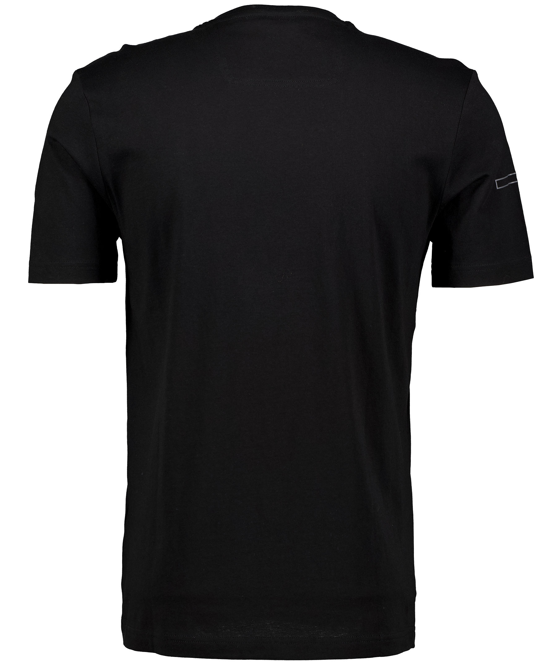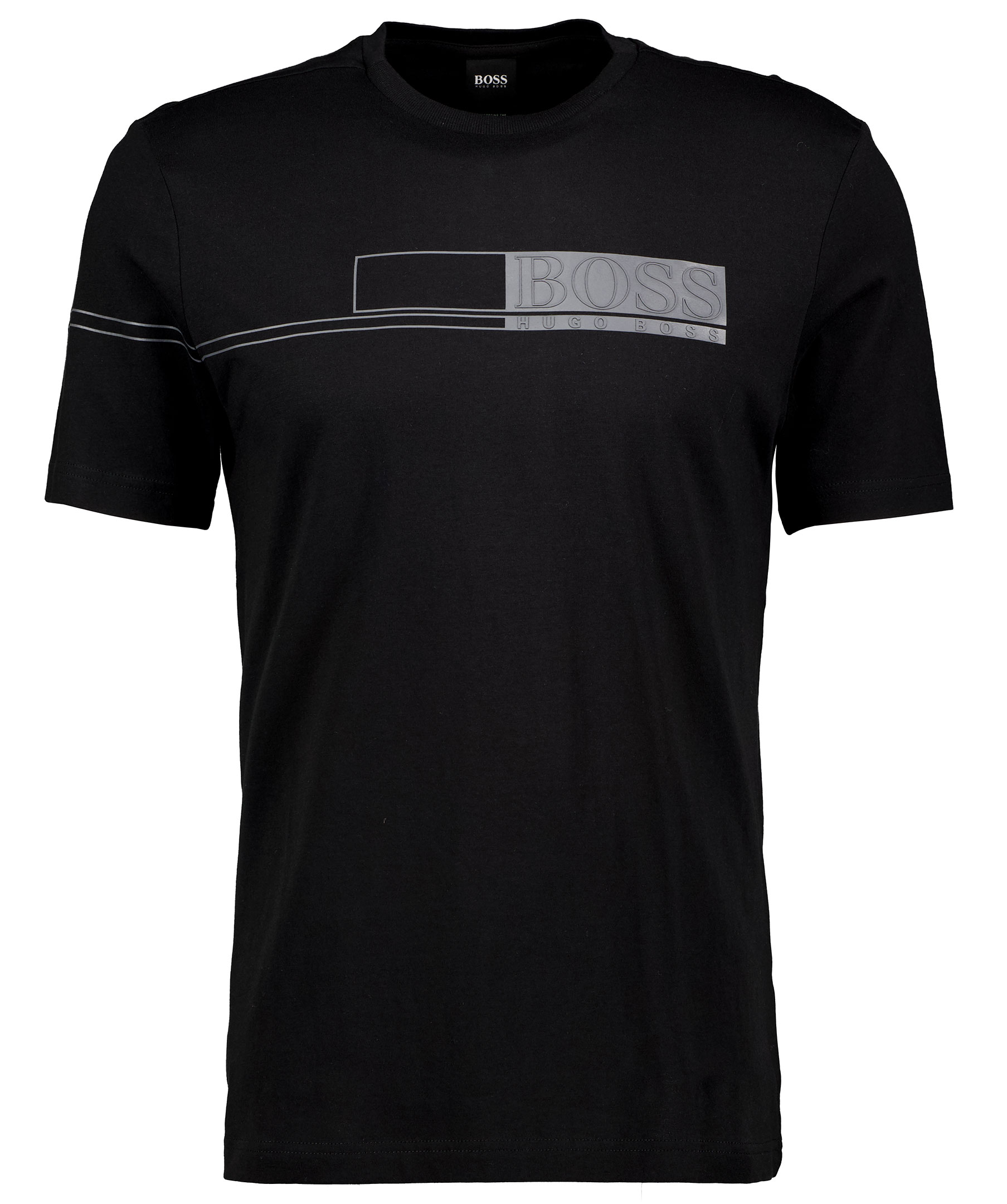 Svart t-shirt från Hugo Boss Athleisure. Gjord i ett skönt bomullstyg. Mörkgrått tryck med logotyp över bröstet med två smala ränder som går längs bröstet och över den högra axeln. Rundad halsringning. * Crew neck * 100% bomull * Utstående logga